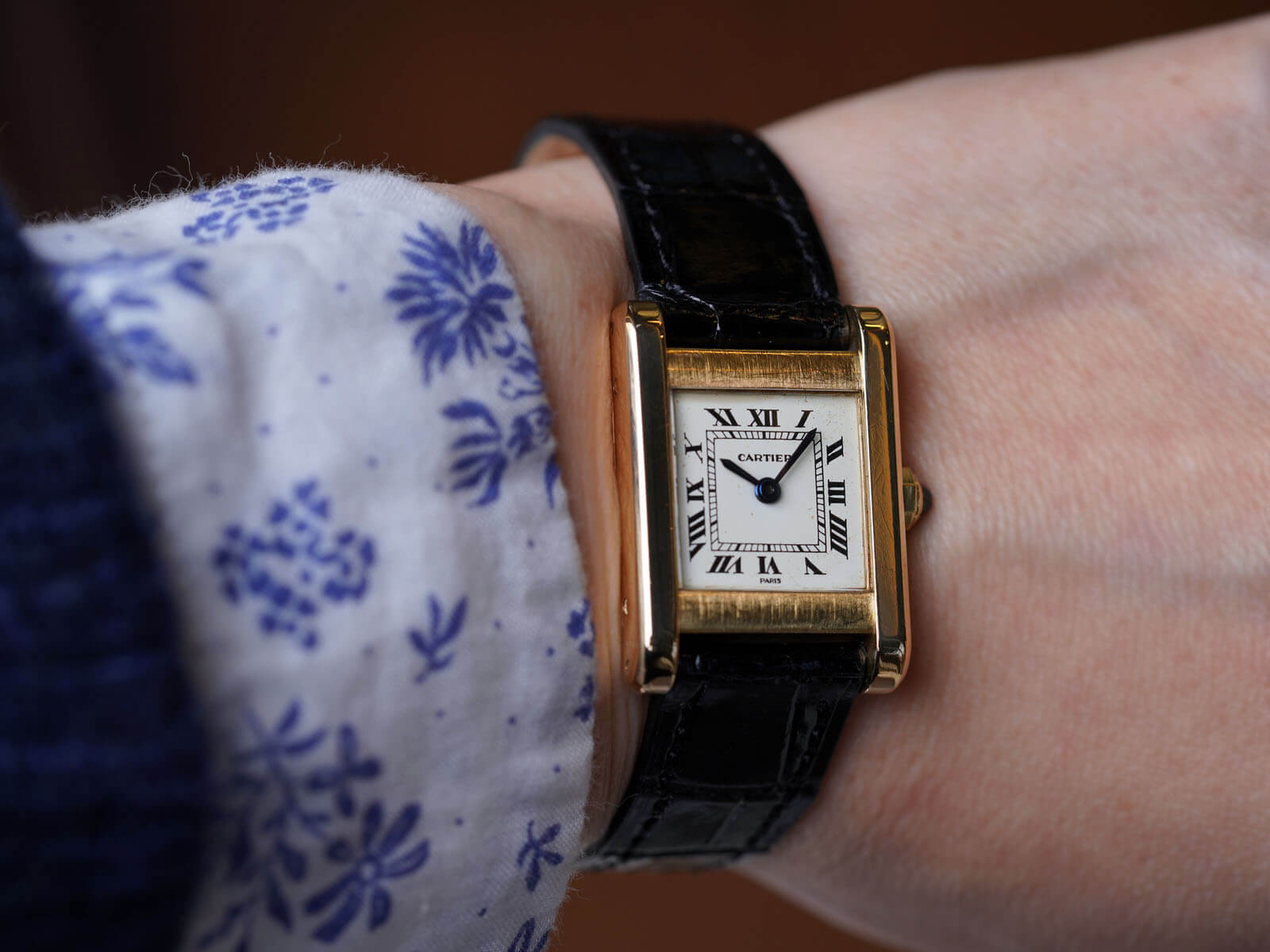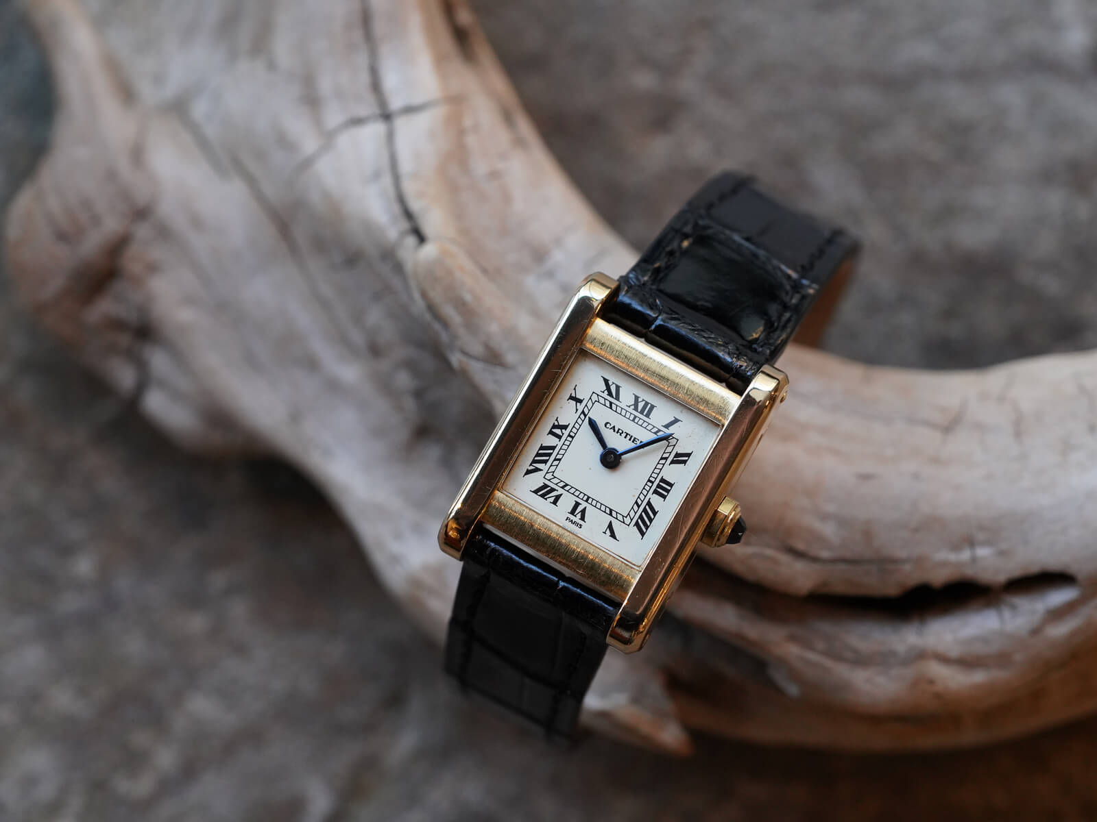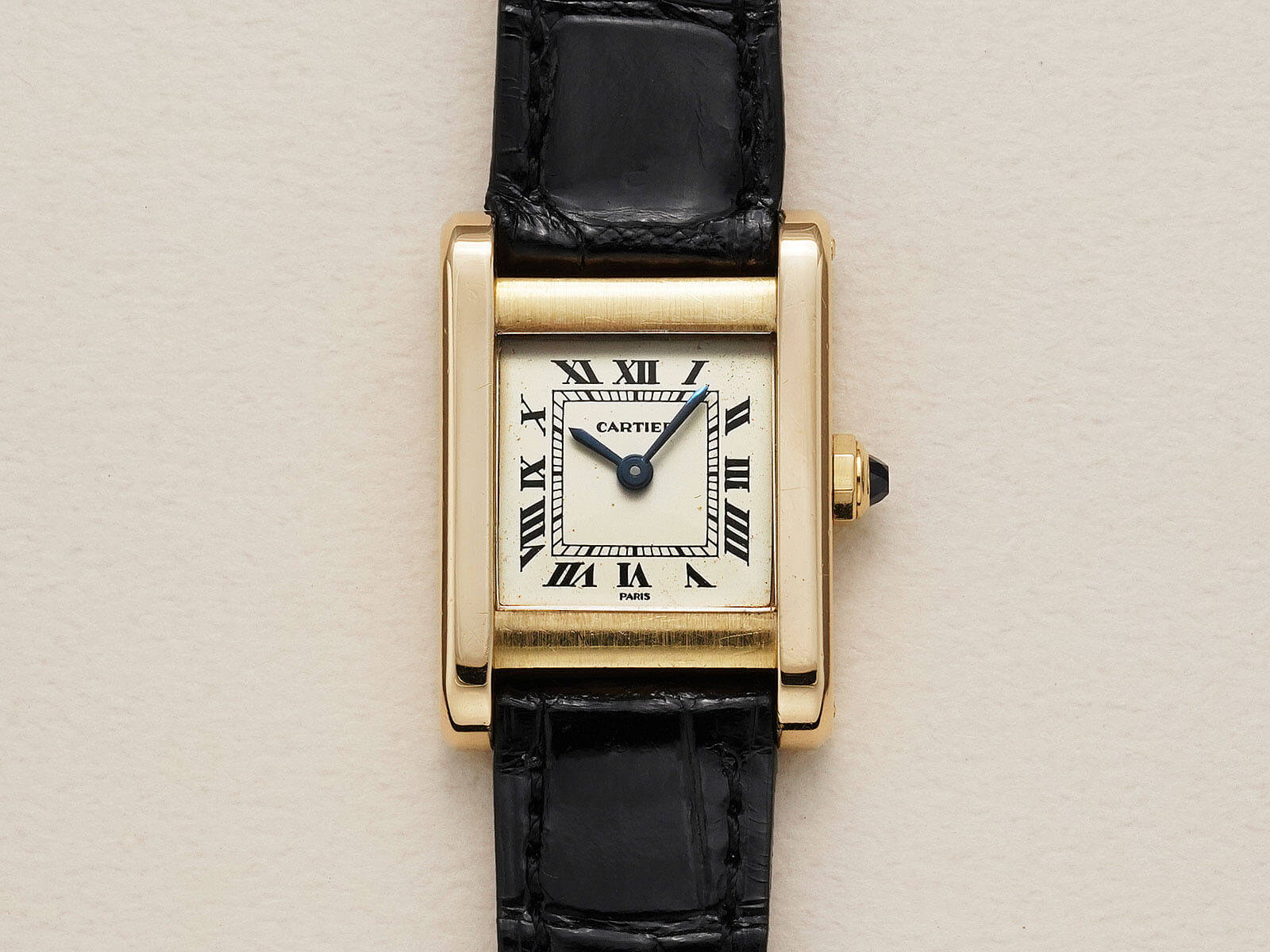 今回ご紹介のRef.78093は、1973年からスタートした[Louis Cartier Collection / ルイカルティエコレクション]にて発売されたモデルの一つでもあります。アールデコの概念を色濃く映し出しているデザインに、ソリッドゴールドモデルのみに見られる、PARIS表記のホワイトローマンダイヤルにブルースチールハンド、サファイアカボションリューズ等、カルティエ伝統のディティールが美しく、人を惹きつける不思議な力を感じてしまいます。