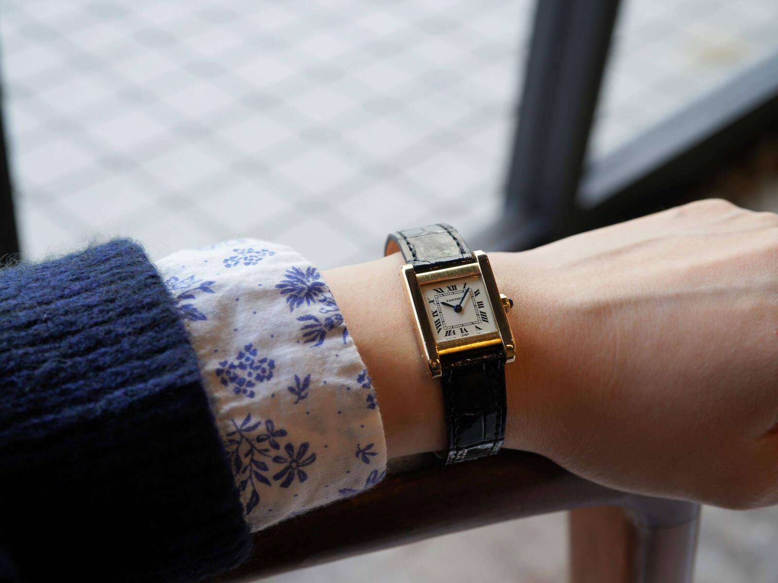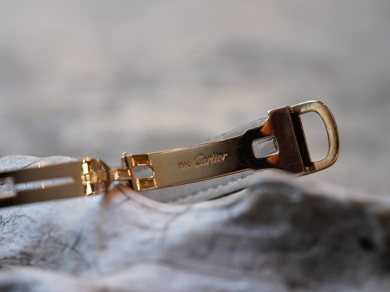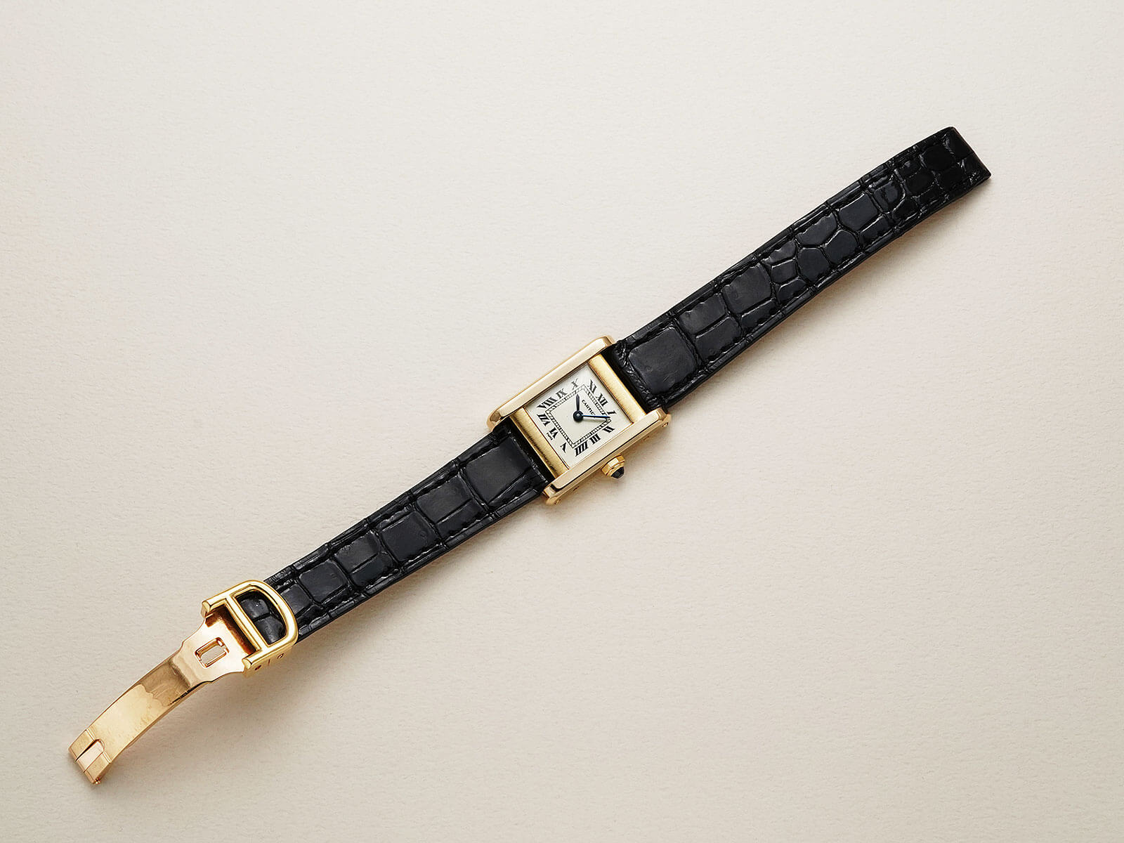レザーブレスには、当店オリジナルのクロコダイルレザーブレスのシャイニーブラックをセレクトし、カルティエの発明である貴重な「Deployant Clasp / Dバックル」を付属。時計の落下防止を目的に作られ、実際に使ったら手放せない実用性の高さを実感して頂けます。初期型Dバックルは、カルティエサロンにて一本一本クチュールにて製作していた為、サイズ調整が出来ませんが、サイズの合わないお客様には、お好きな素材にてレザーブレスをお作り致します(納期約1ヵ月)。筆者の見解ですが、ごく一部のタンキストの方々に「タンクノーマルこそオリジナル」と称される価値のある存在です。趣を感じさせる温かみとすっきりとした品の良いデザインで、お手元をスタイル良く演出してくれます。是非店頭にてご覧下さい。