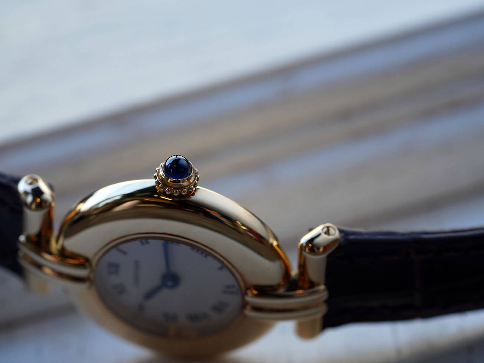 今回ご紹介のRef.1985は、綺麗なソリッドゴールドモデルです。シンプルなホワイトローマンダイヤルとブルースチールハンド、美しい形状のサファイアカボションリューズが揃い、カルティエらしくシンプルなフォルムで、他にはない魅力を感じさせてくれます。