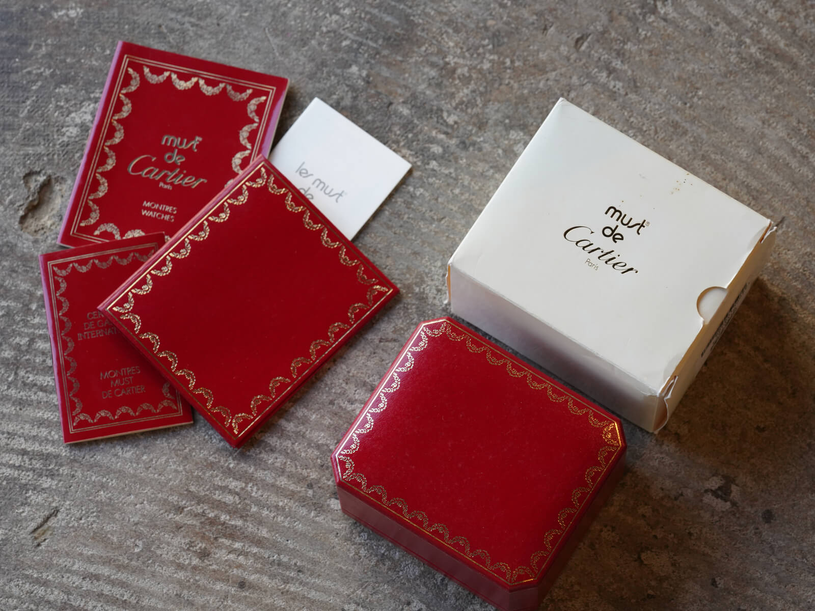 レザーブレスには、当店オリジナルのクロコダイルレザーベルトのシャイニーブラウンをセレクト。貴重なイエローゴールド製純正尾錠と純正ボックスも付属し、とても大切に保管されていた事が伺える、素晴らしい固体です。直線的デザインの多いカルティエの中では珍しく、独特な曲線を持った綺麗な時計です。是非店頭にて御覧ください。