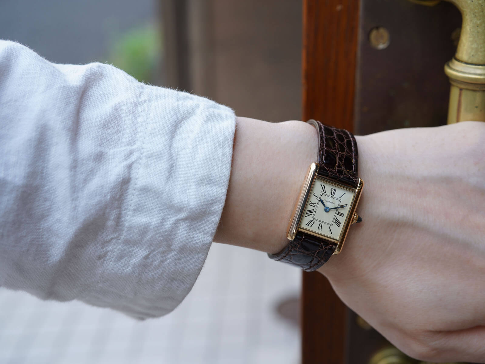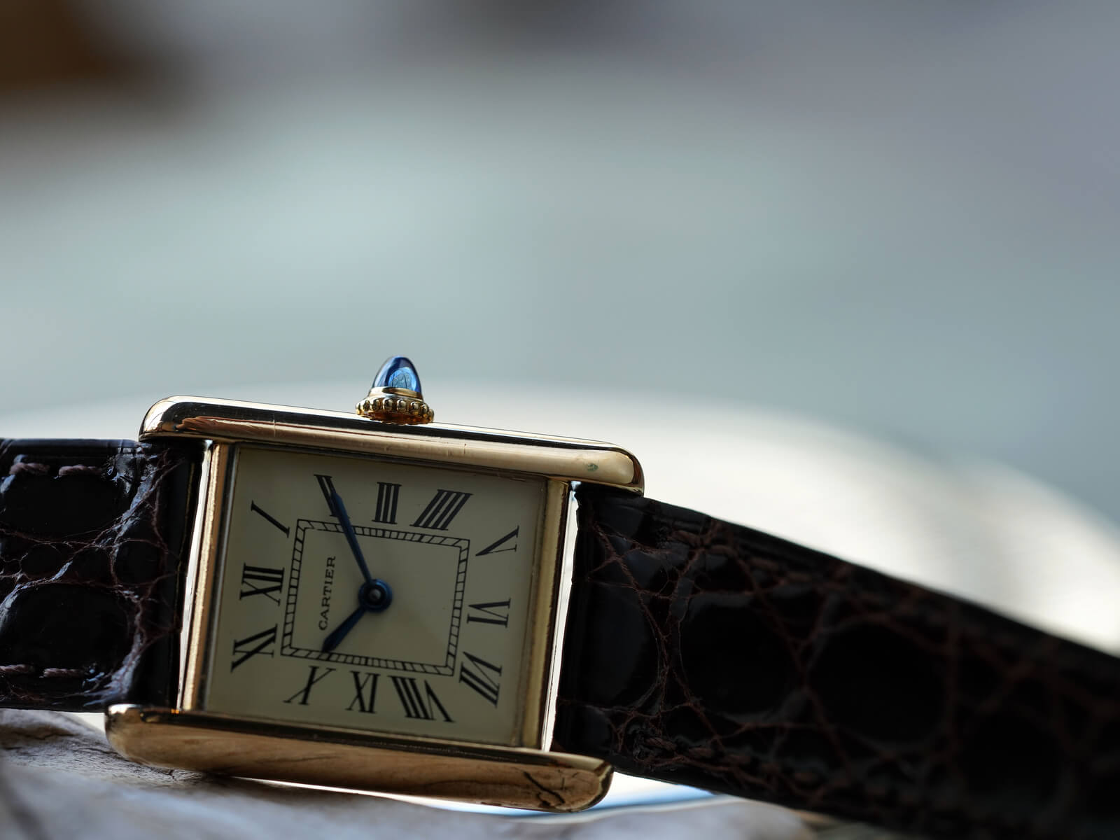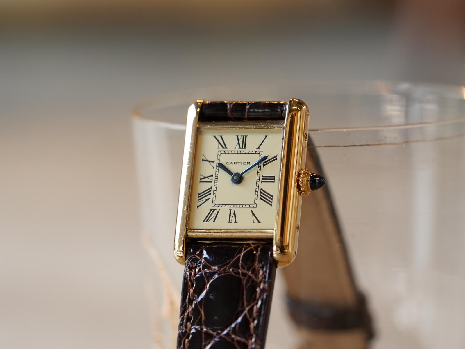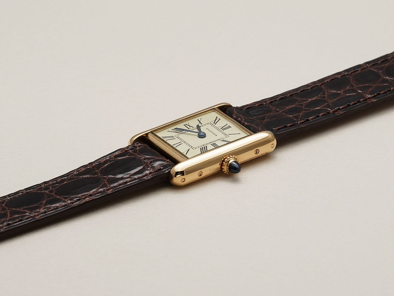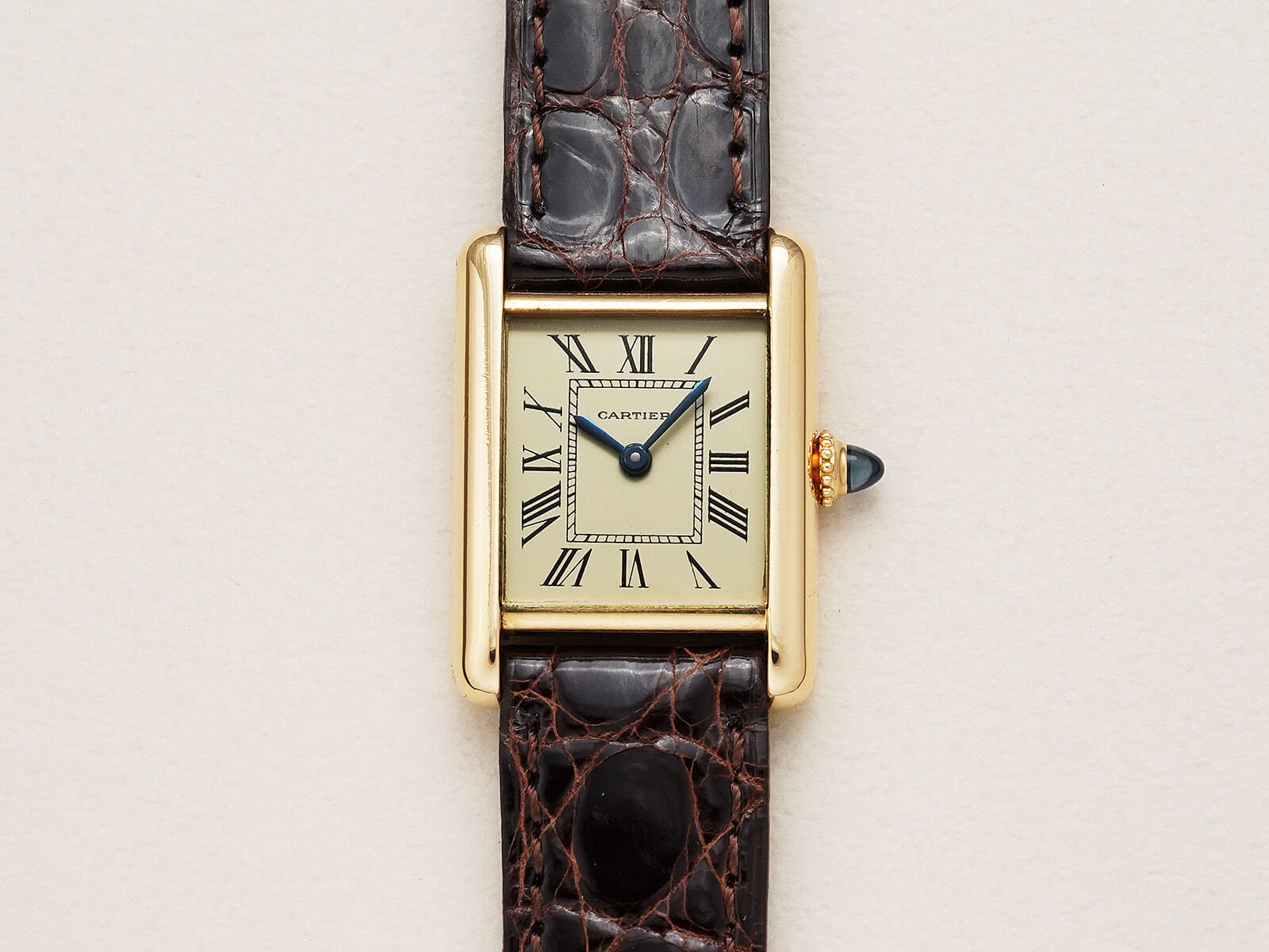 今回は「タンクルイカルティエSM / Tank Louis Cartier」Ref78087のご紹介です。1922年にスタートしたタンクLCのヴィンテージモデルの一つで、状態の良いブルースチール針と、美しく理想的な形の砲弾型サファイアカボションリューズも存在し、全てが優美な魅力を放ち、いつ見ても素敵な時計だと感じてしまいます。特にこちらの個体は、当時純正の文字盤で交換されたとされ、6時の位置にあるParisやSwissの表記は無く、字体の細いローマンダイヤルとなります。通常のローマ数字とは少し違った、気品と趣を感じさせてくれる魅力的なモデルです。