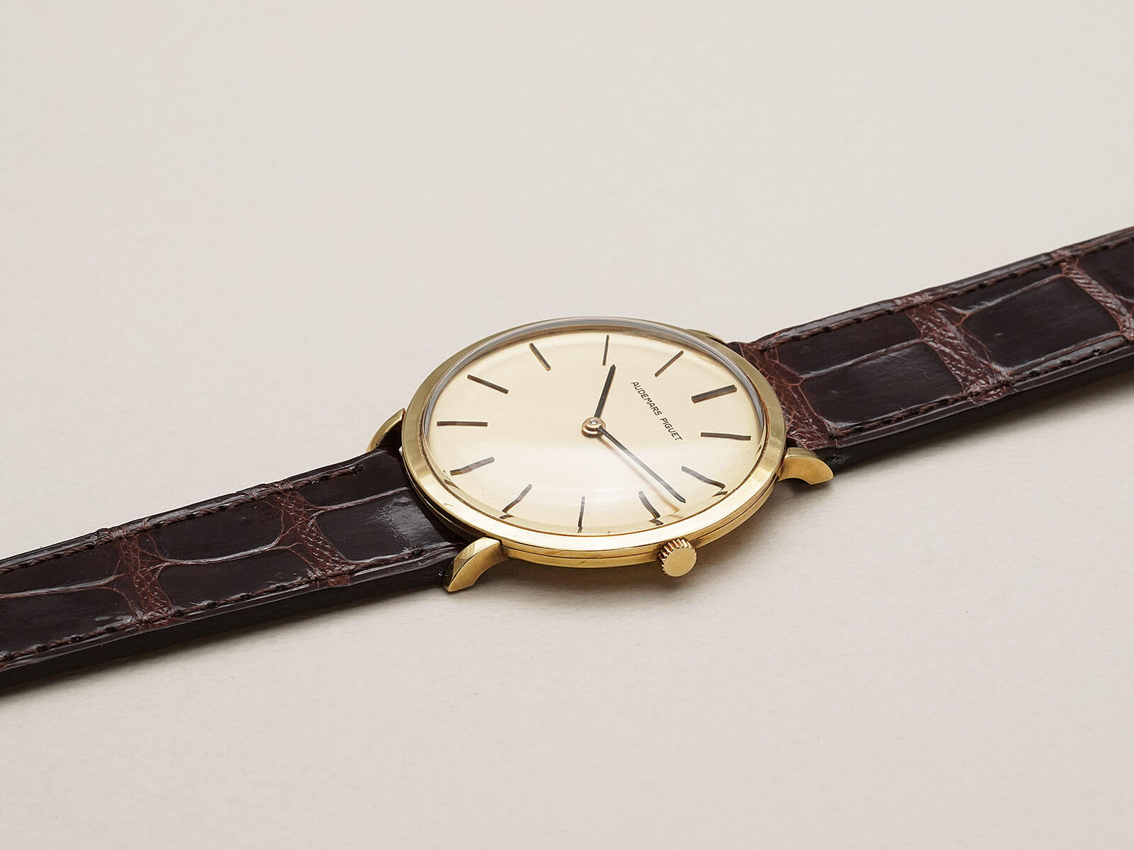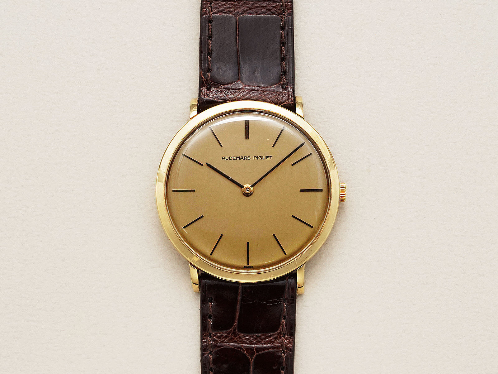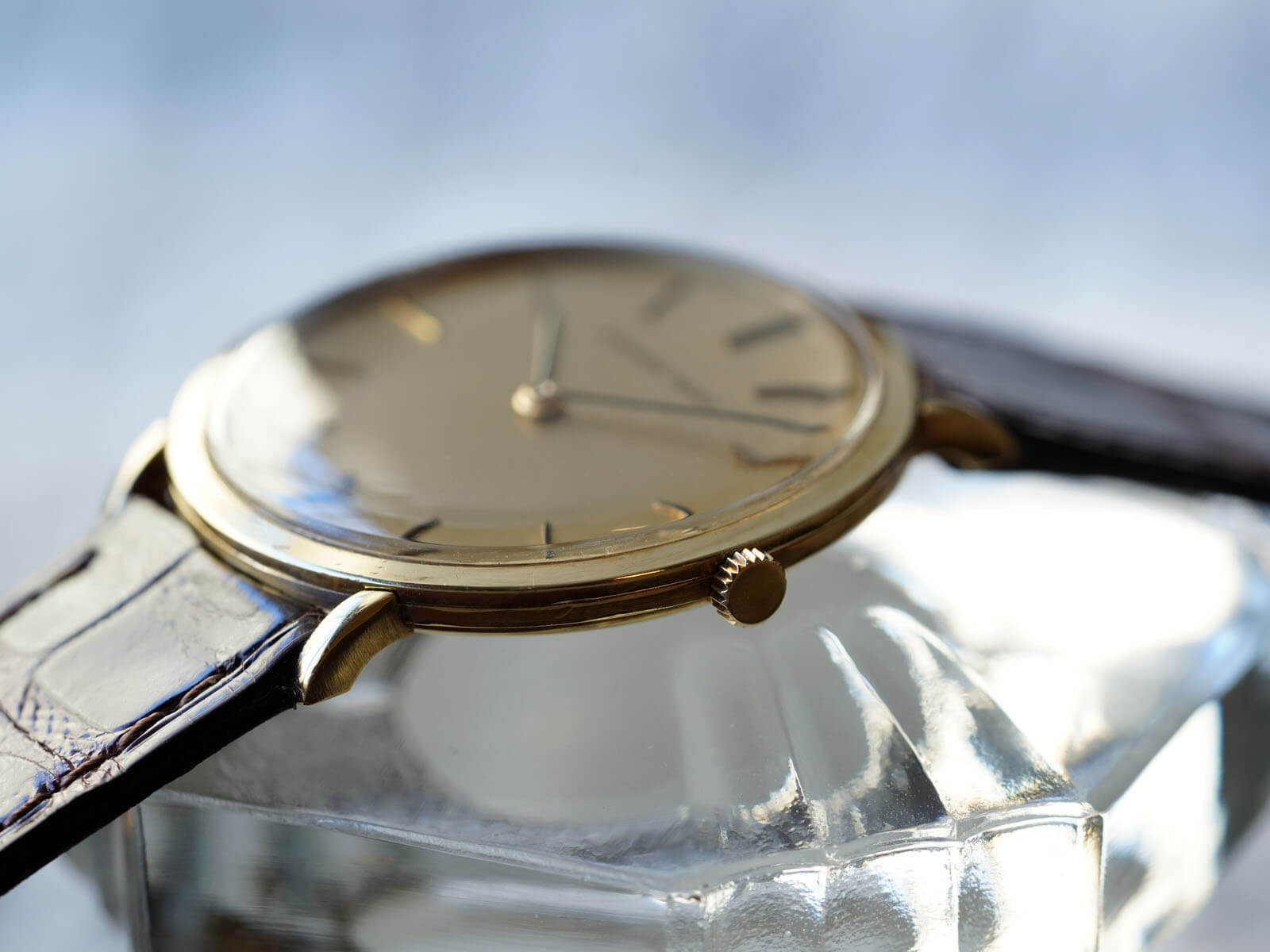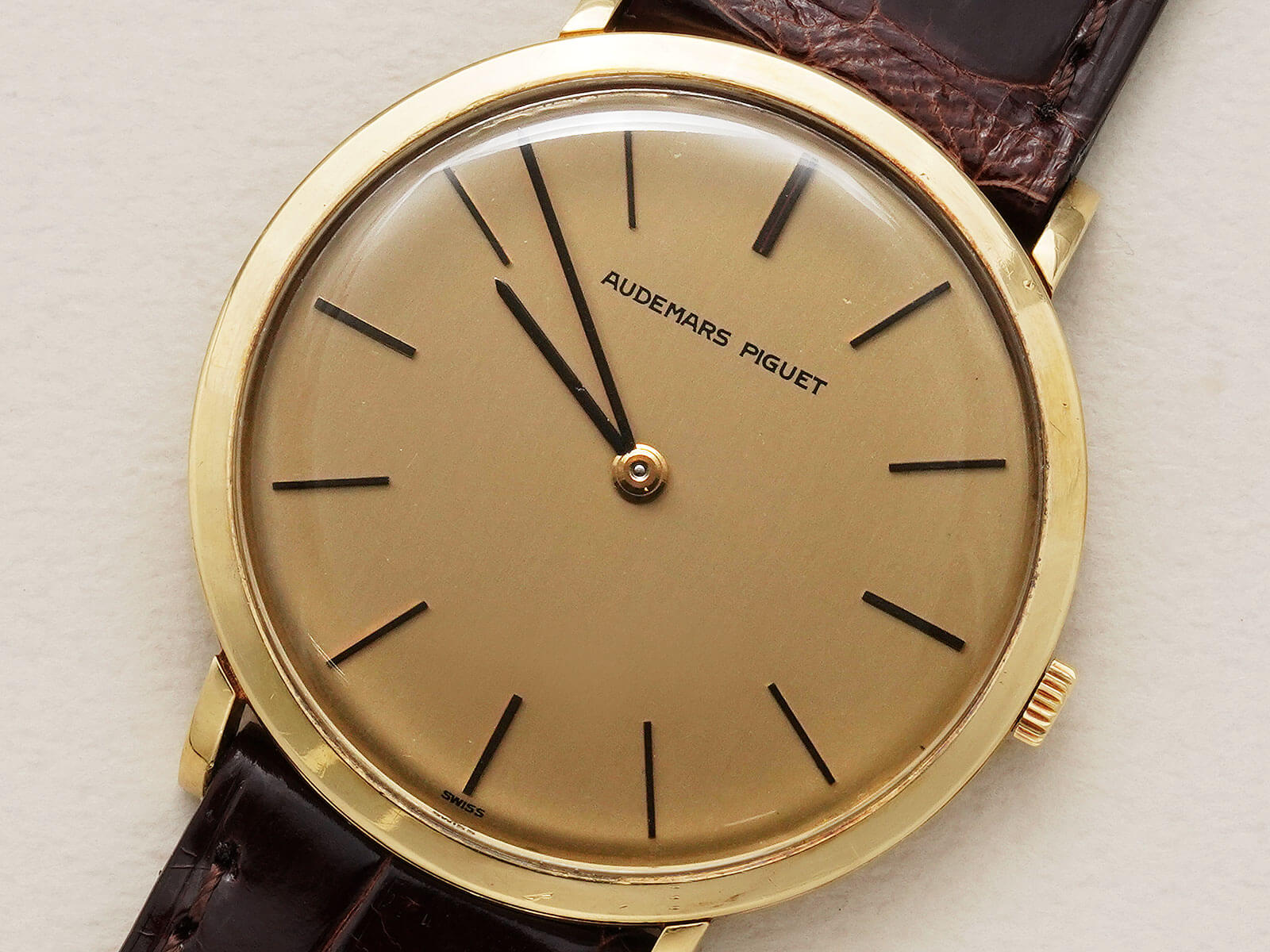 今回は、シンプルな美しさを表現した薄くエレガントなモデル、エクストラフラットのご紹介です。ラグ部分を短くする事で、綺麗な形を表現したソリッドゴールド製ラウンドケースに、気品を漂わせるヘアライン加工の施されたゴールドダイヤル。シャープなバーインデックスにペンシルハンドの組み合わせで、シンプルながらに優美で存在感のあるデザインです。