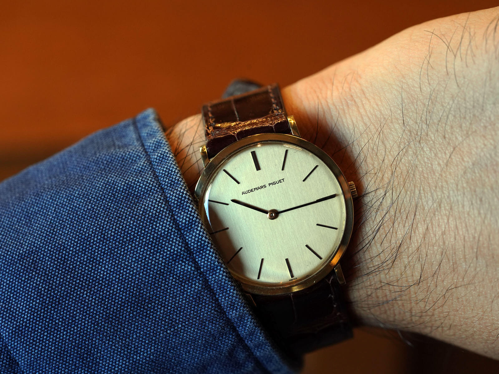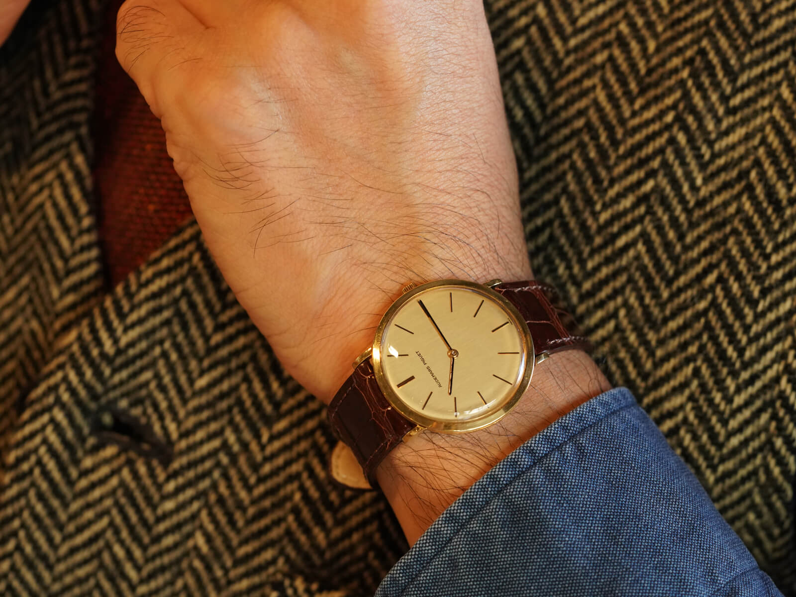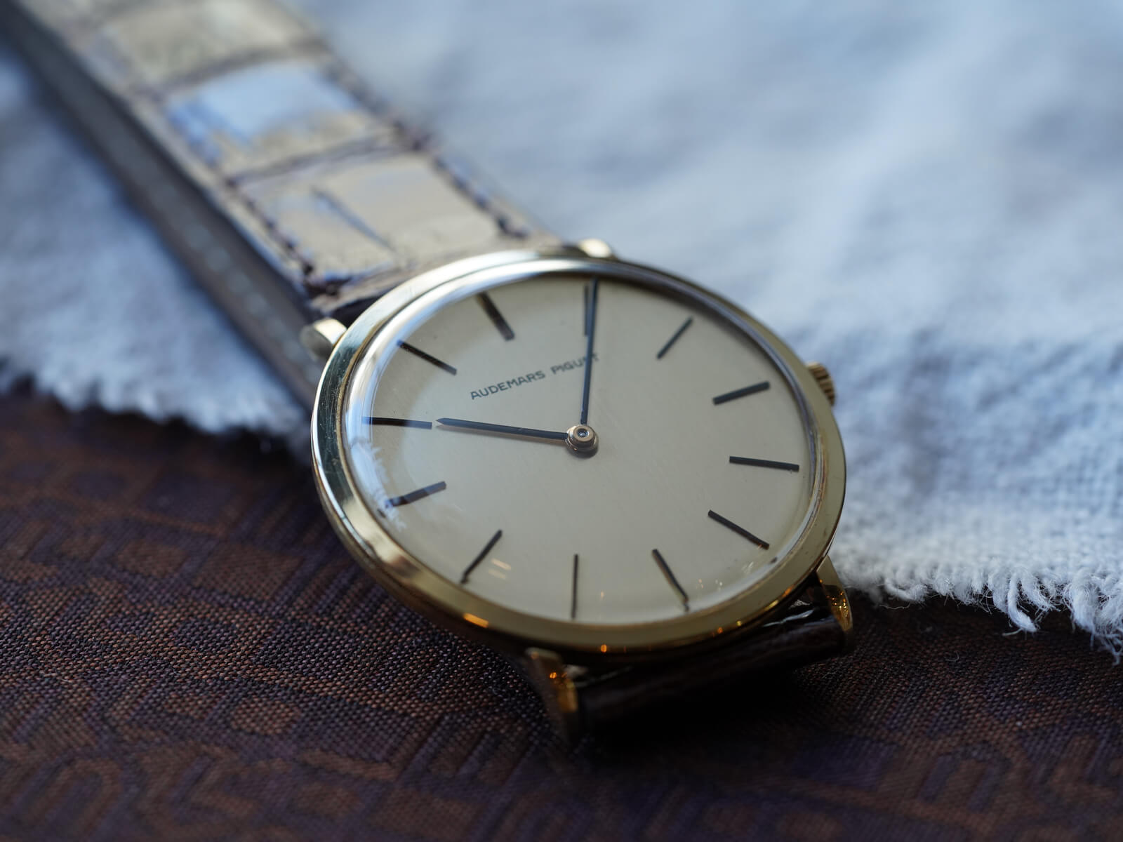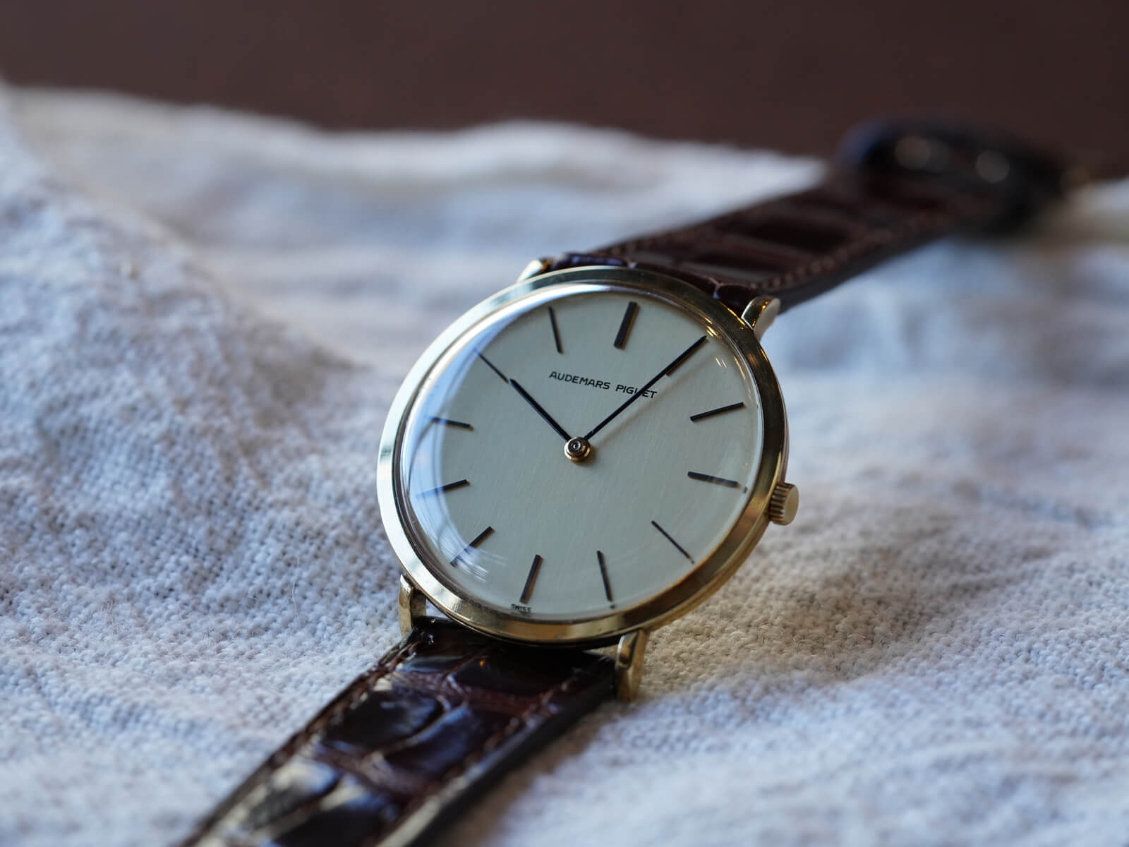 今回は、シンプルな美しさを表現した薄くエレガントなモデル、エクストラフラットのご紹介です。ラグ部分を短くする事で、綺麗な形を表現したソリッドゴールド製ラウンドケースに、気品を漂わせるヘアライン加工の施されたゴールドダイヤル。シャープなバーインデックスにペンシルハンドの組み合わせで、シンプルながらに優美で存在感のあるデザインです。