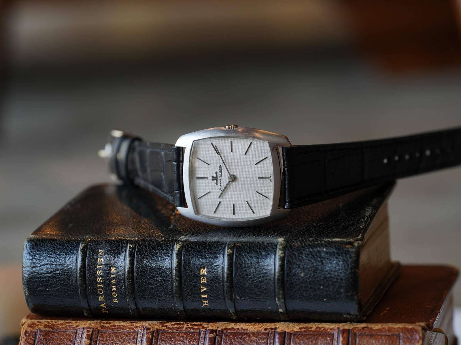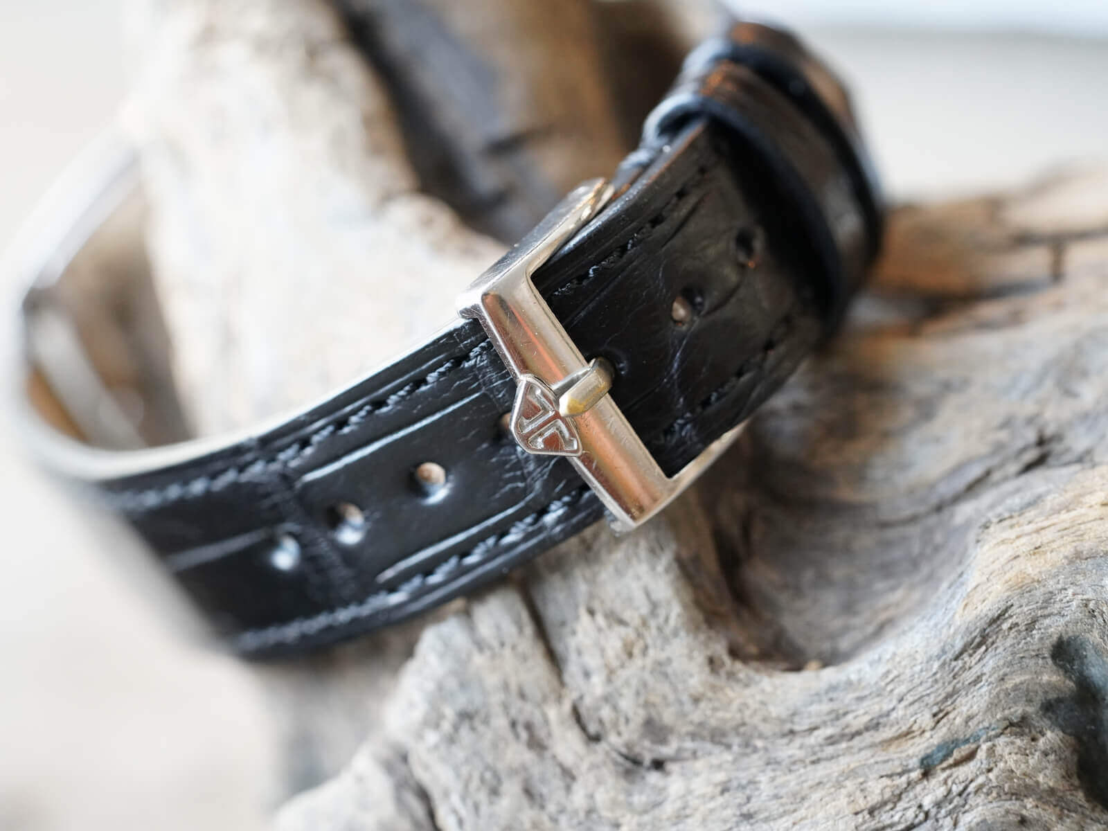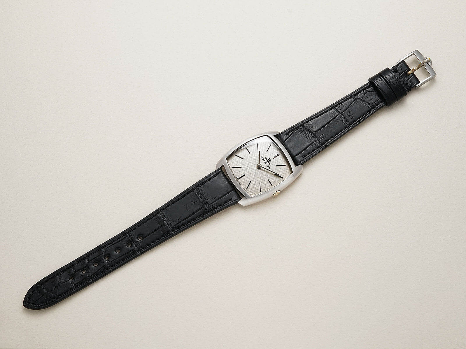 レザーブレスには、当店オリジナルのクロコダイルレザーブレスのブラックをセレクト。貴重な純正尾錠も付属しておりますので、共にお使い頂けることをお勧めいたします。ジャガールクルトらしい主張し過ぎない"静かな"美しさに、高いセンスを感じる逸品。是非お手に取ってご覧ください。
