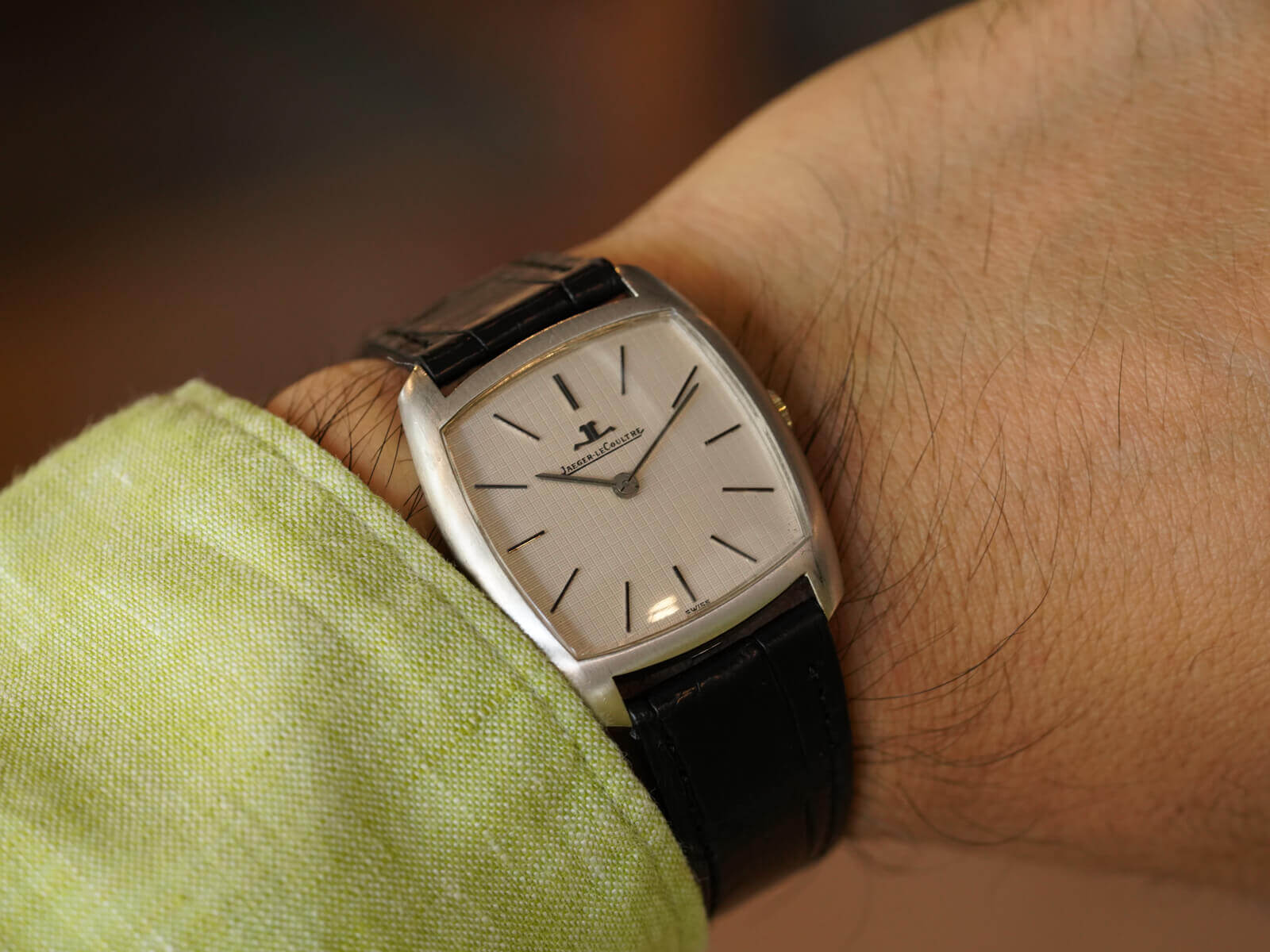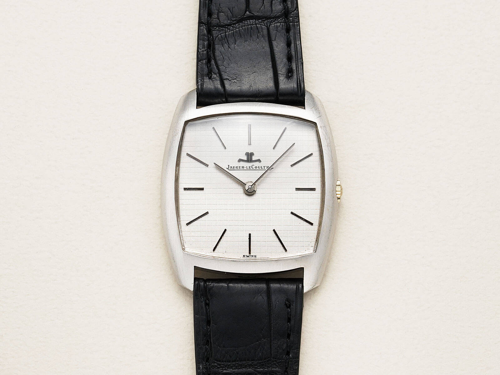 そんな歴史のあるブランドから展開された、Ref9040-22のご紹介です。綺麗な形をしたホワイトゴールド製スナップバック式クッションケースに、ダイヤルは渋味のあるタペストリー模様のホワイトダイヤルと、墨入りされたバーインデックスとペンシルハンド。ヴィンテージ・ジャガールクルト特有の落ち着きと、渋さを強く感じさせるモデルです。