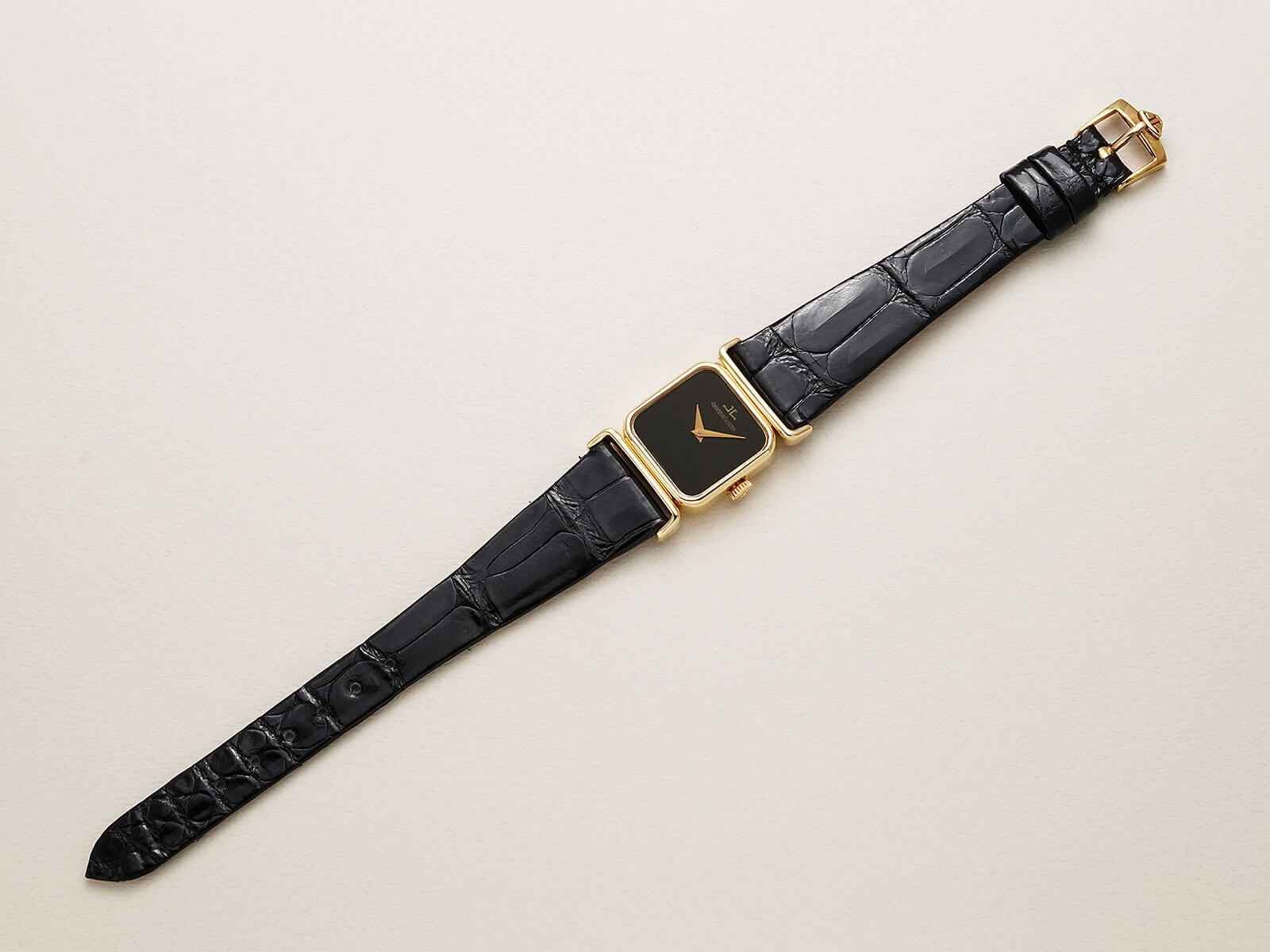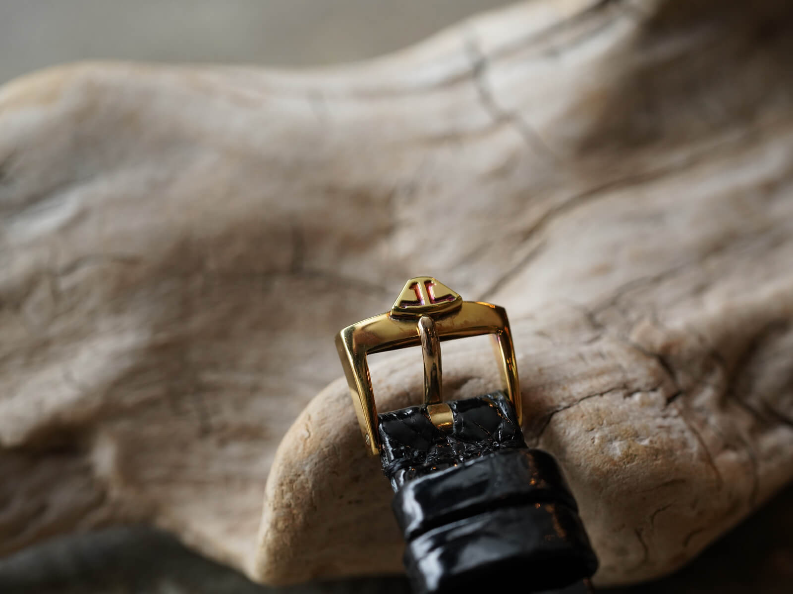 レザーブレスには、当店オリジナルのクロコダイルレザーブレスのブラックをセレクト。貴重な純正尾錠も付属しておりますので、共にお使い頂けることをお勧め致します。漆黒のダイアルが際立つ高級感と上品な雰囲気を感じさせる美しい時計を是非お手に取ってご覧ください。