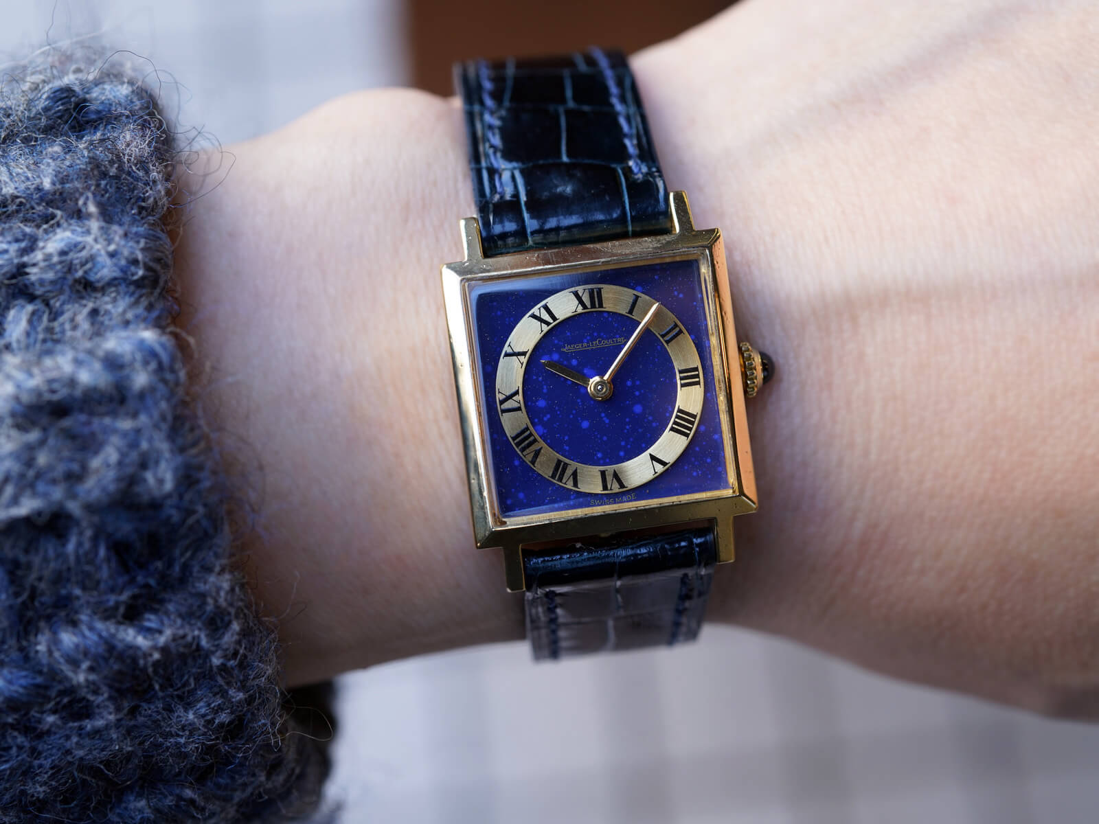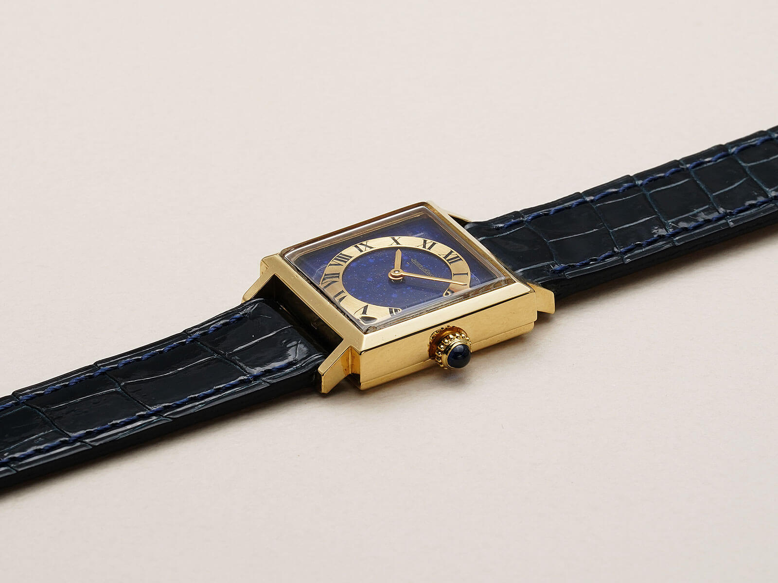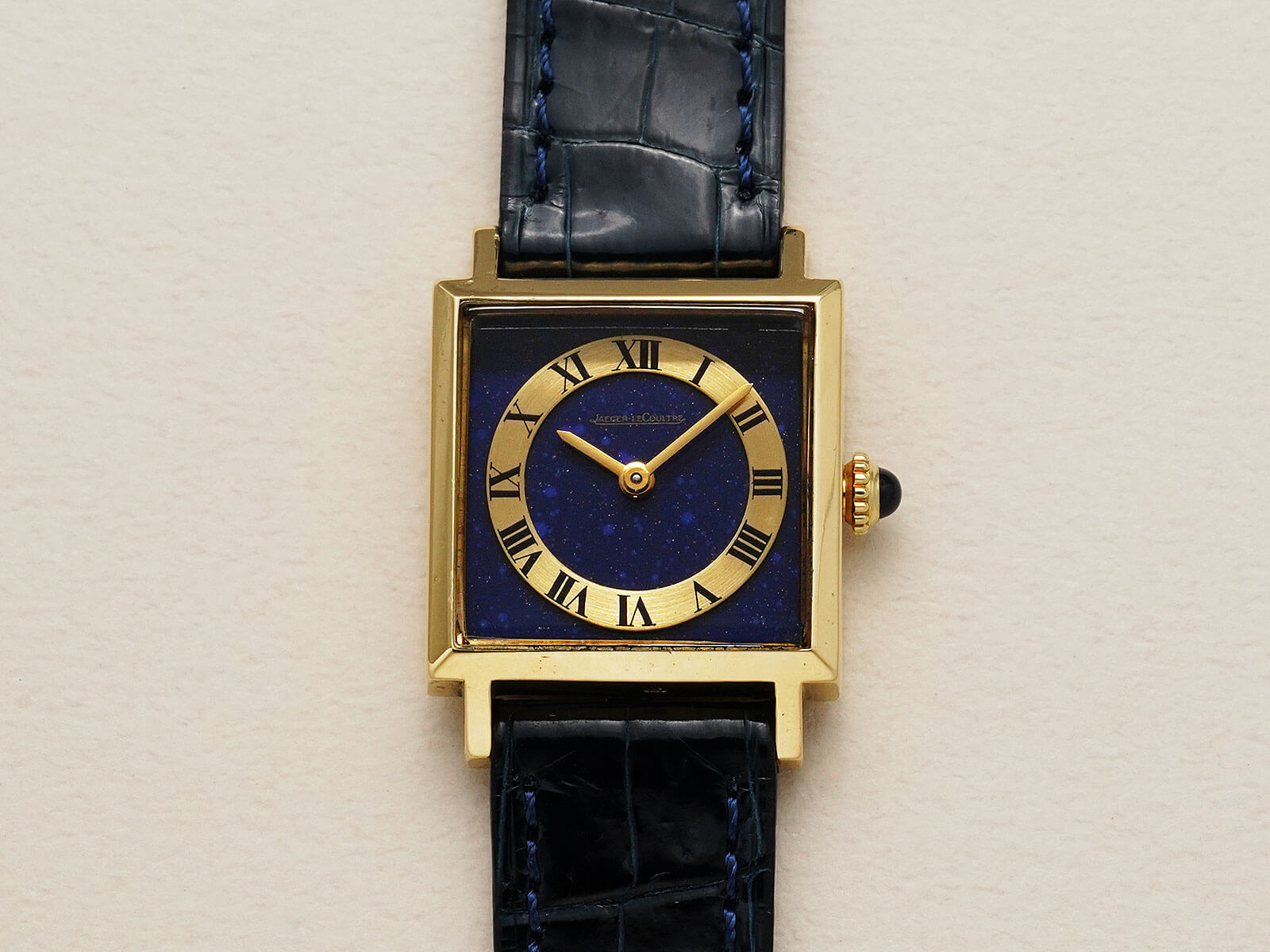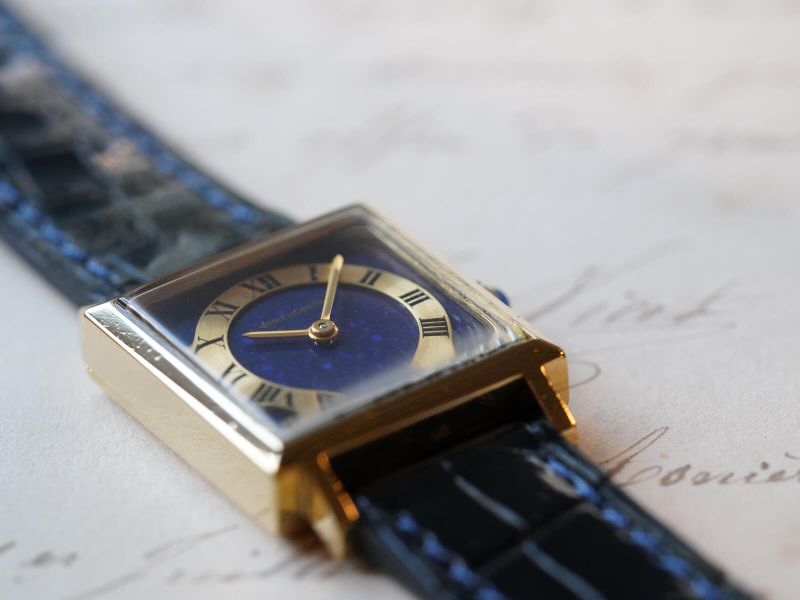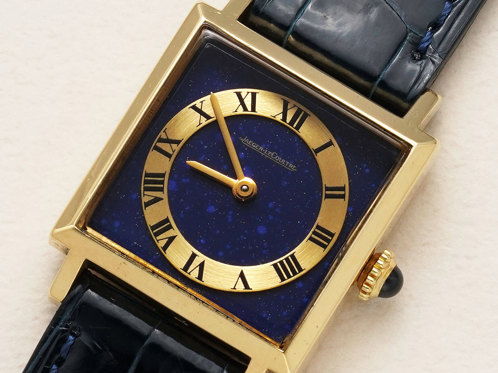 今回ご紹介のRef.6003-21は、印象的な文字盤が特徴的な上品なモデルです。輝きを放つソリッドゴールドのスクエアケースに、円状に配置されたローマンインデックスのラピスブルーダイヤルとサファイアカボションリューズが、上品な時計を見事に表現。不規則な模様の群青に金粉を散りばめ、天然石の様な美しいブルーを表現したラピスダイヤルが特に印象的で、ジャガールクルトらしい主張し過ぎない美しさに、高いセンスを感じさせる一本です。