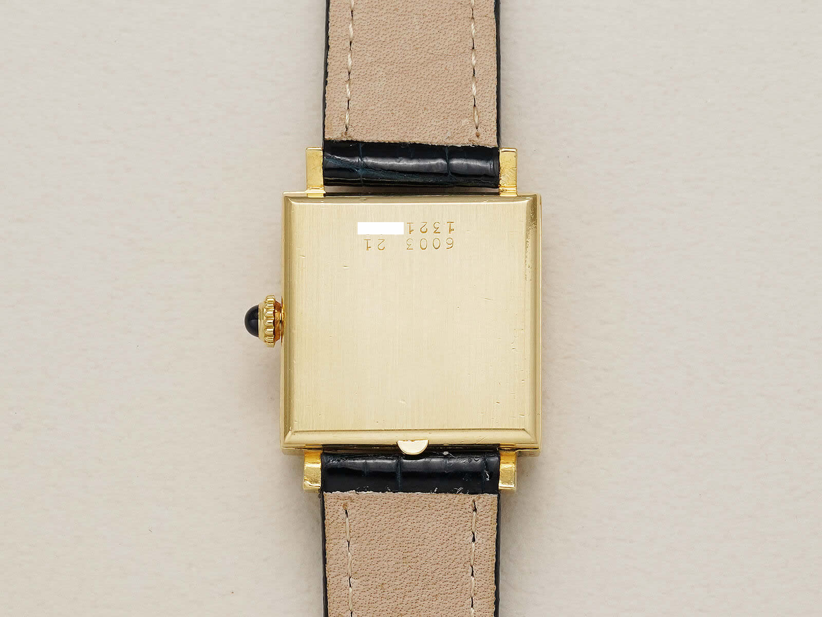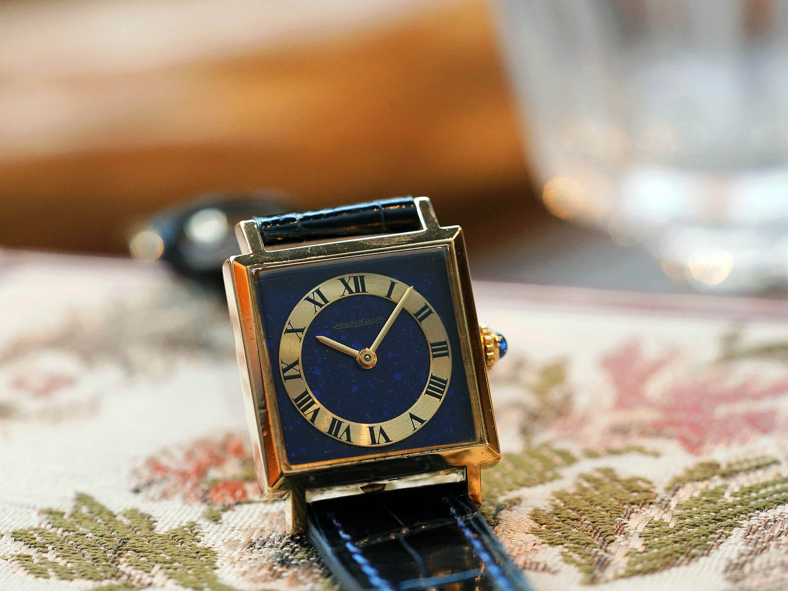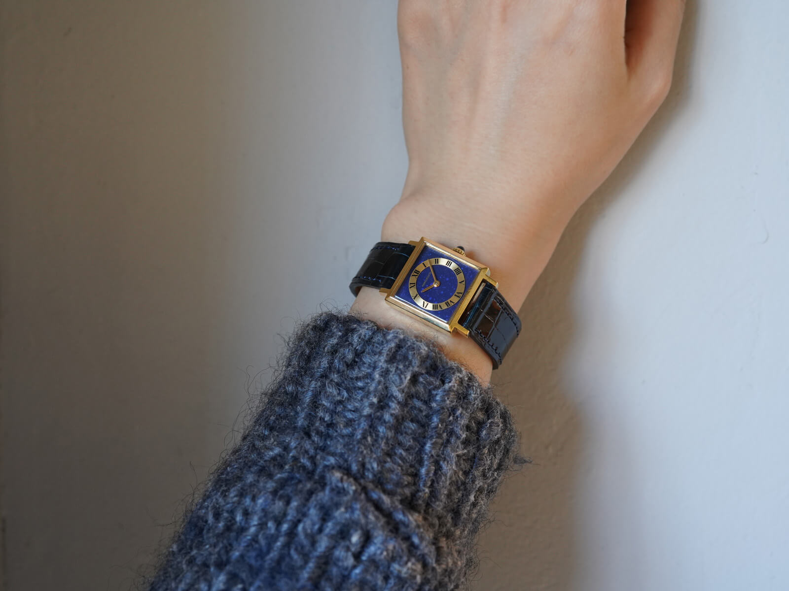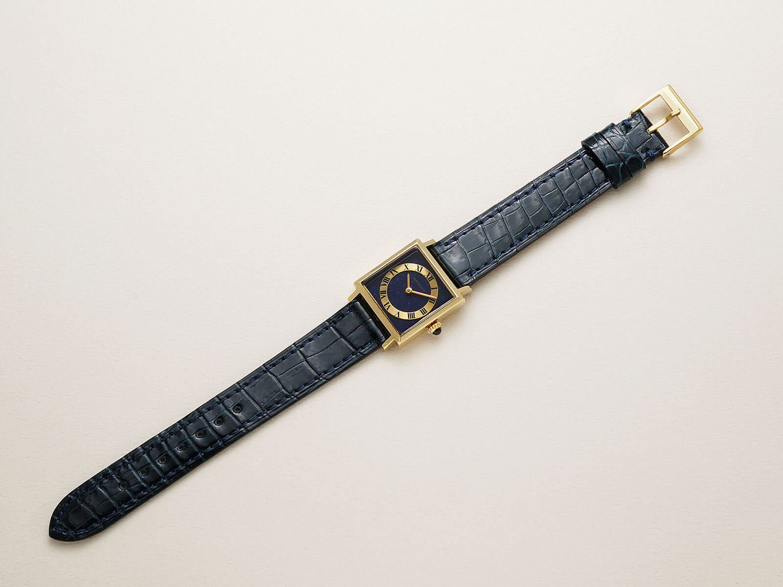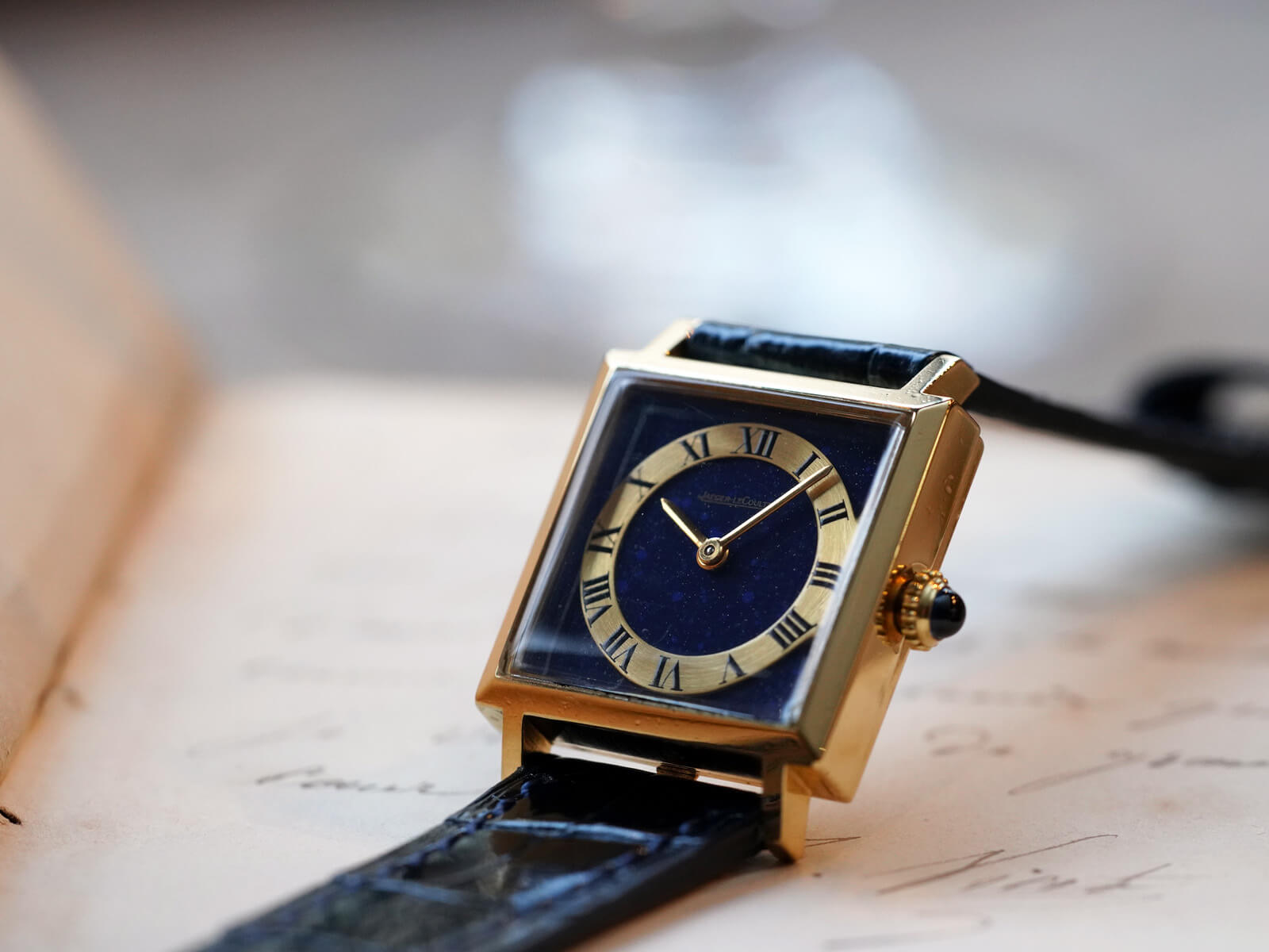 今回ご紹介のRef.6003-21は、印象的な文字盤が特徴的な上品なモデルです。輝きを放つソリッドゴールドのスクエアケースに、円状に配置されたローマンインデックスのラピスブルーダイヤルとサファイアカボションリューズが、上品な時計を見事に表現。不規則な模様の群青に金粉を散りばめ、天然石の様な美しいブルーを表現したラピスダイヤルが特に印象的で、ジャガールクルトらしい主張し過ぎない美しさに、高いセンスを感じさせる一本です。