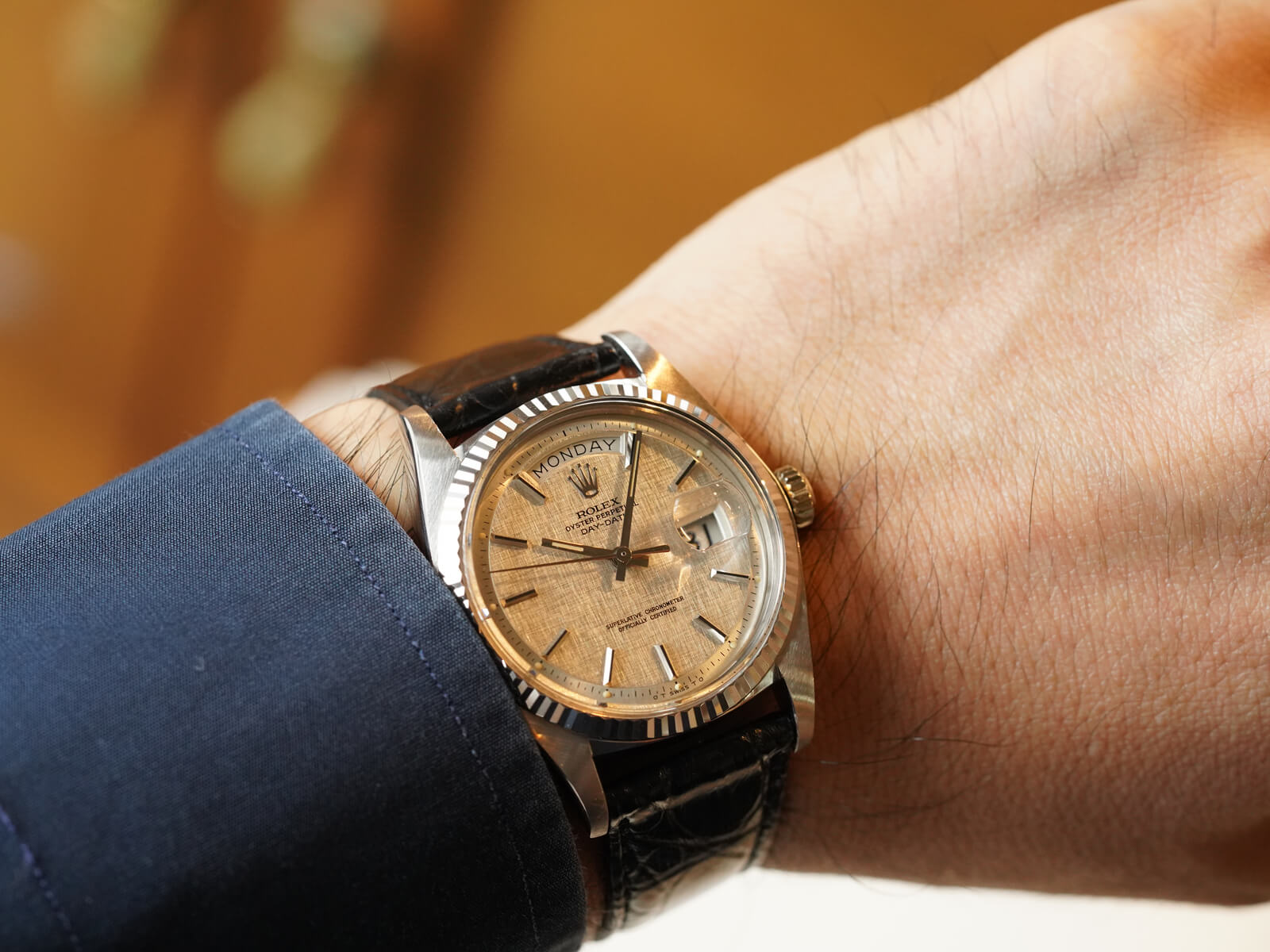 日付表示に加えフルスペルの曜日表示を備える[ デイデイト / Daydate ]は、アメリカ大統領が着けていたことで、[プレジデント / President ]と呼ばれ、当時のロレッックス全モデルの中で、最高峰と言われたモデルです。ビジネスの世界で時間が重要視しされ始めた時代の象徴として、ワンランク上のステイタスを感じさせるモデルであったと言えます。