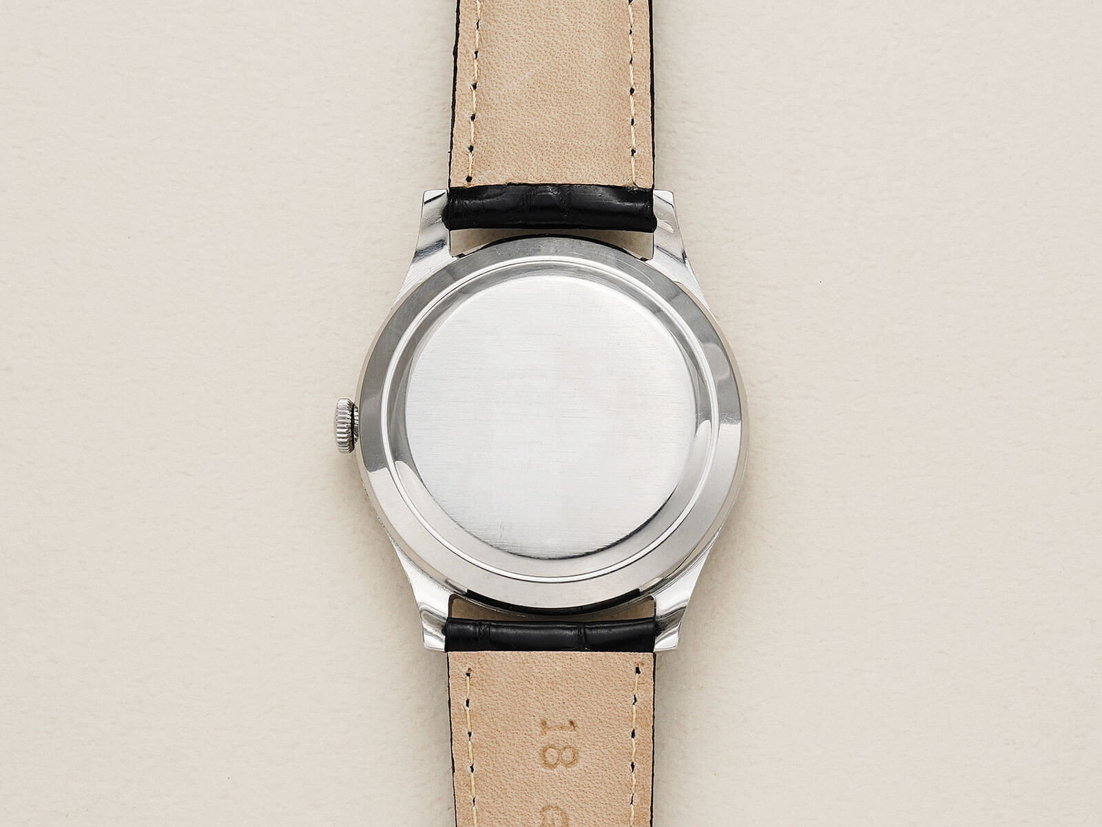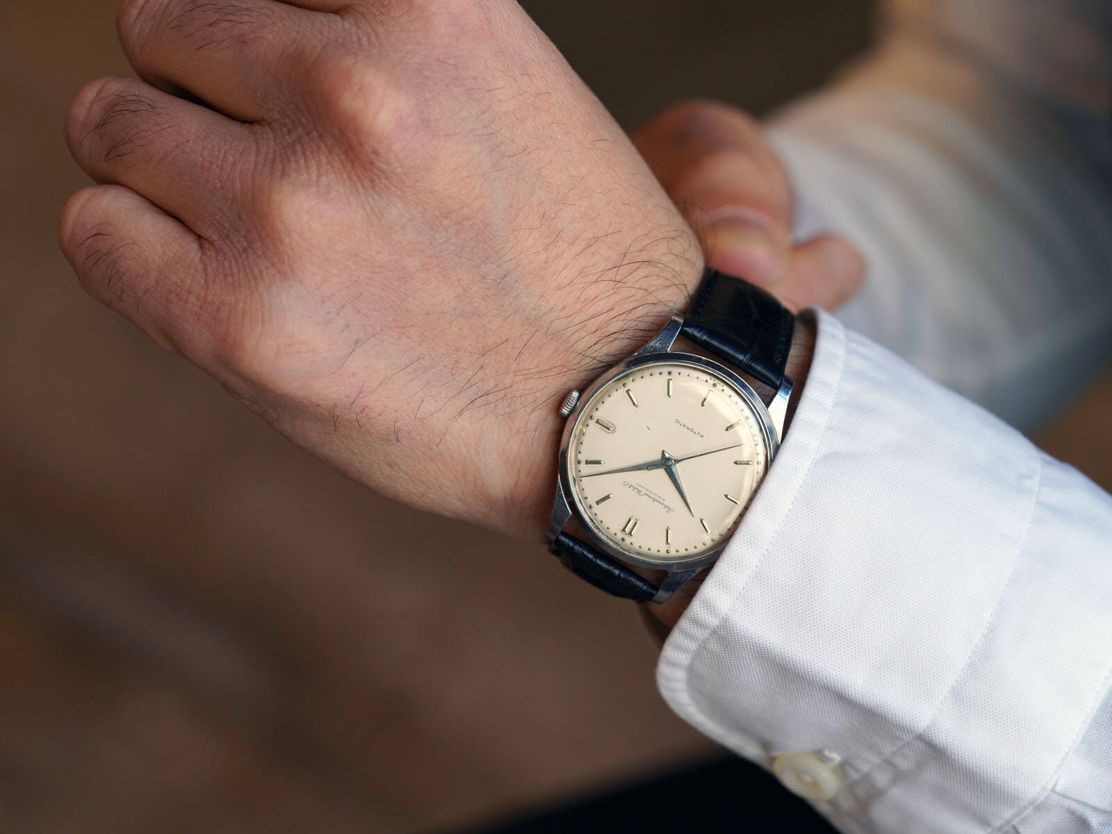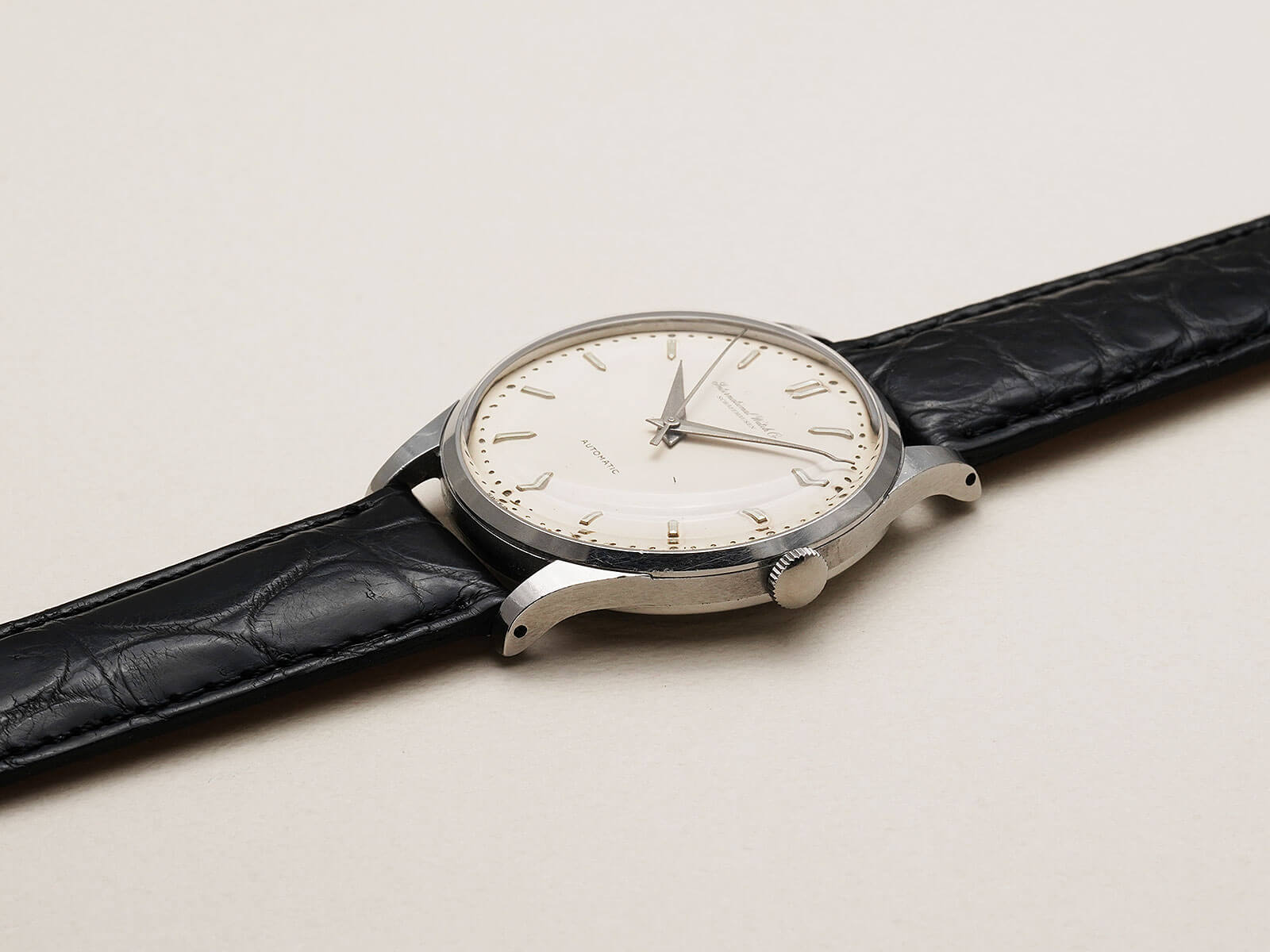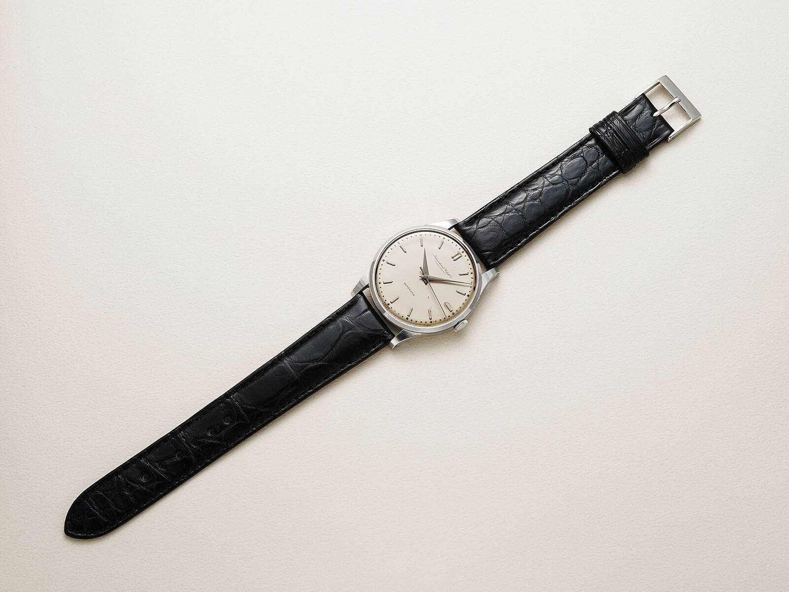 今回のご紹介は、形の良いステンレス製ラウンドケースが美しくシンプルな印象のモデルです。ほのかに優しい色合いのアイボリーダイヤルに、品の良い筆記体ロゴ、バレットインデックスとドルフィンハンドが、ヴィンテージテイストを強く感じさせ、シンプルで存在感の際立つ美しいデザインです。