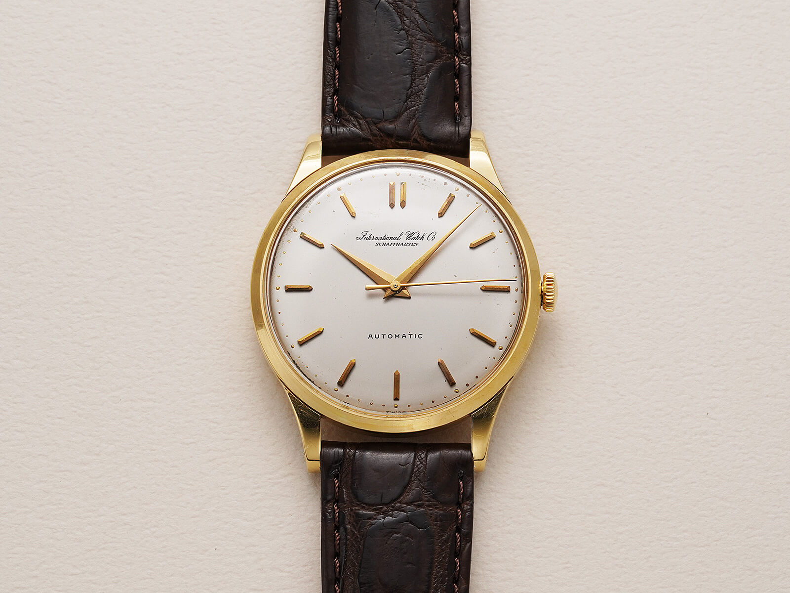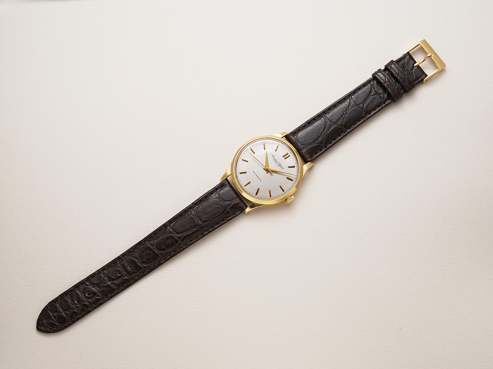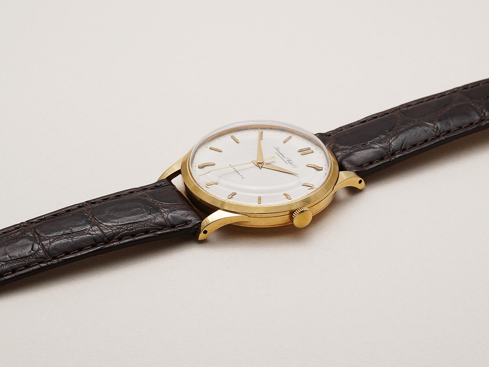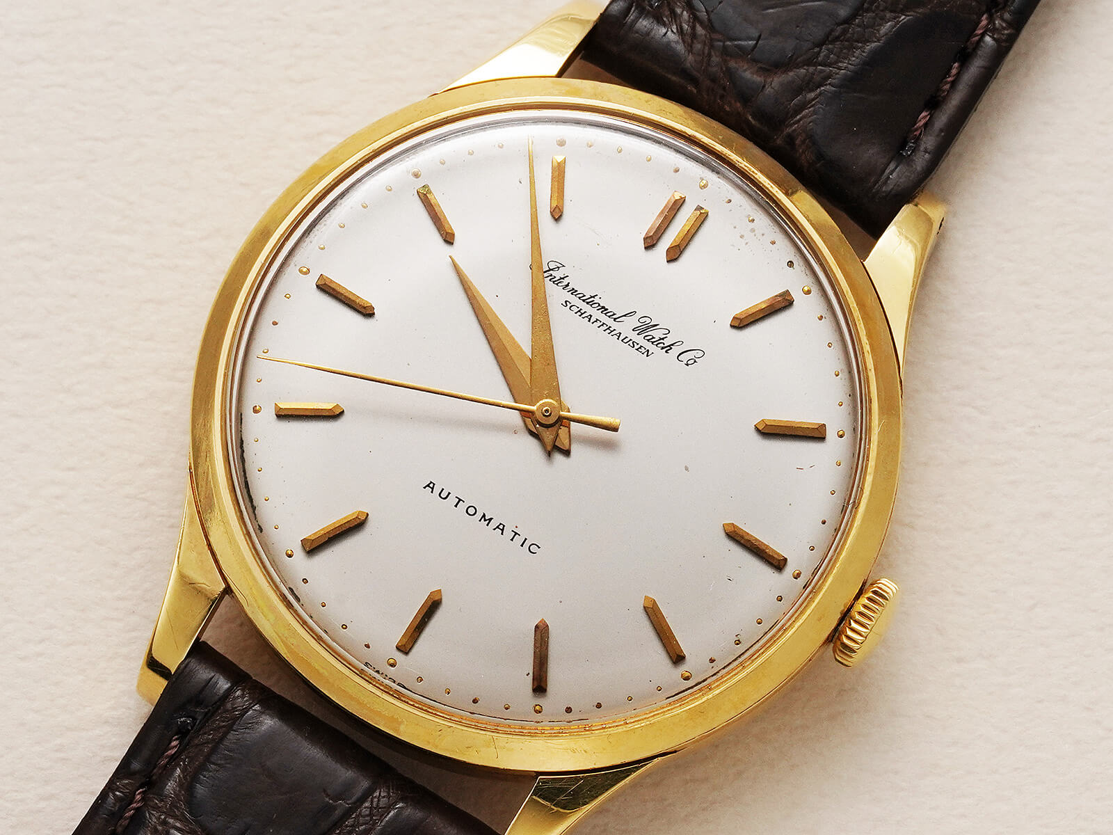 今回のご紹介は、IWCらしくシンプルで美しくスマートな印象のモデルです。風格のあるアイボリーダイヤルに、渋いゴールドのバレットインデックスとドルフィンハンドで、落ち着きを感じさせてくれる魅力的な一本。オールドインター特有の、品の良い筆記体ロゴのみの表記や金属のボールを埋め込まれたミニッツマーカーもあり、シンプルでありながら実用性の高い、職人気質を感じさせる拘りのディテールです。