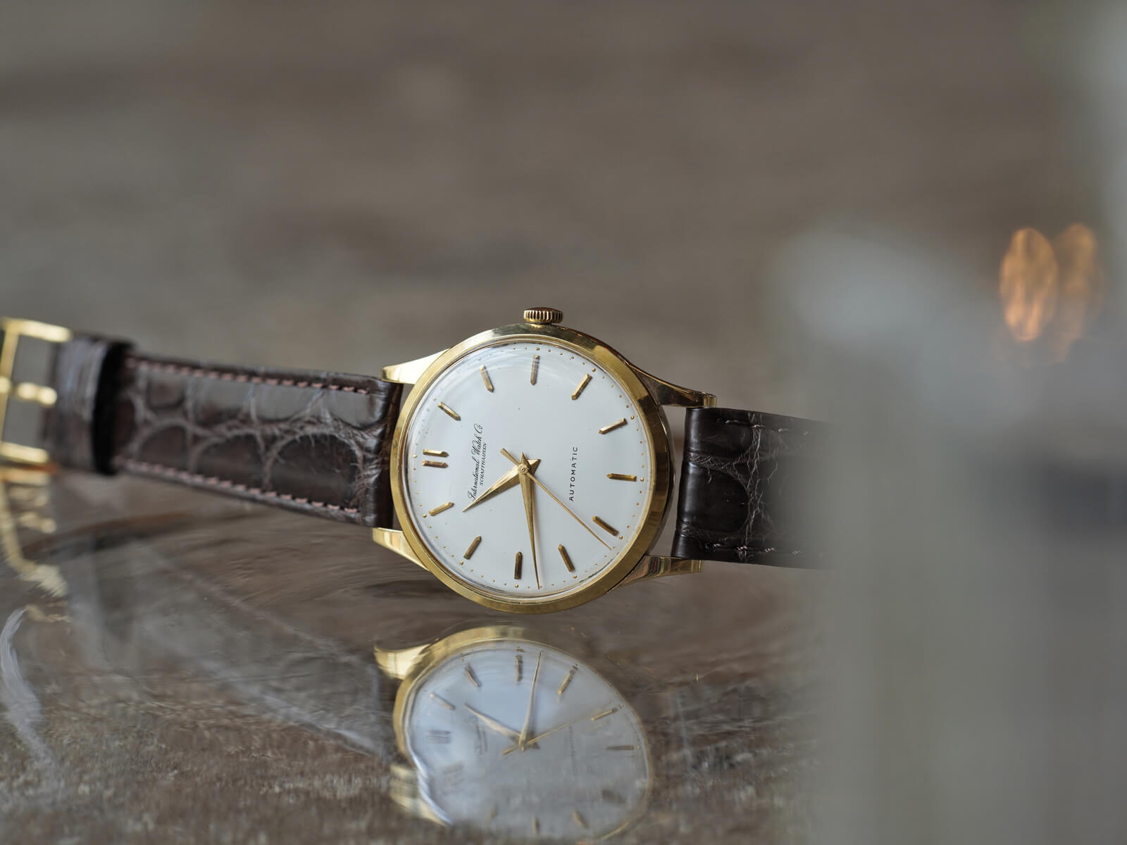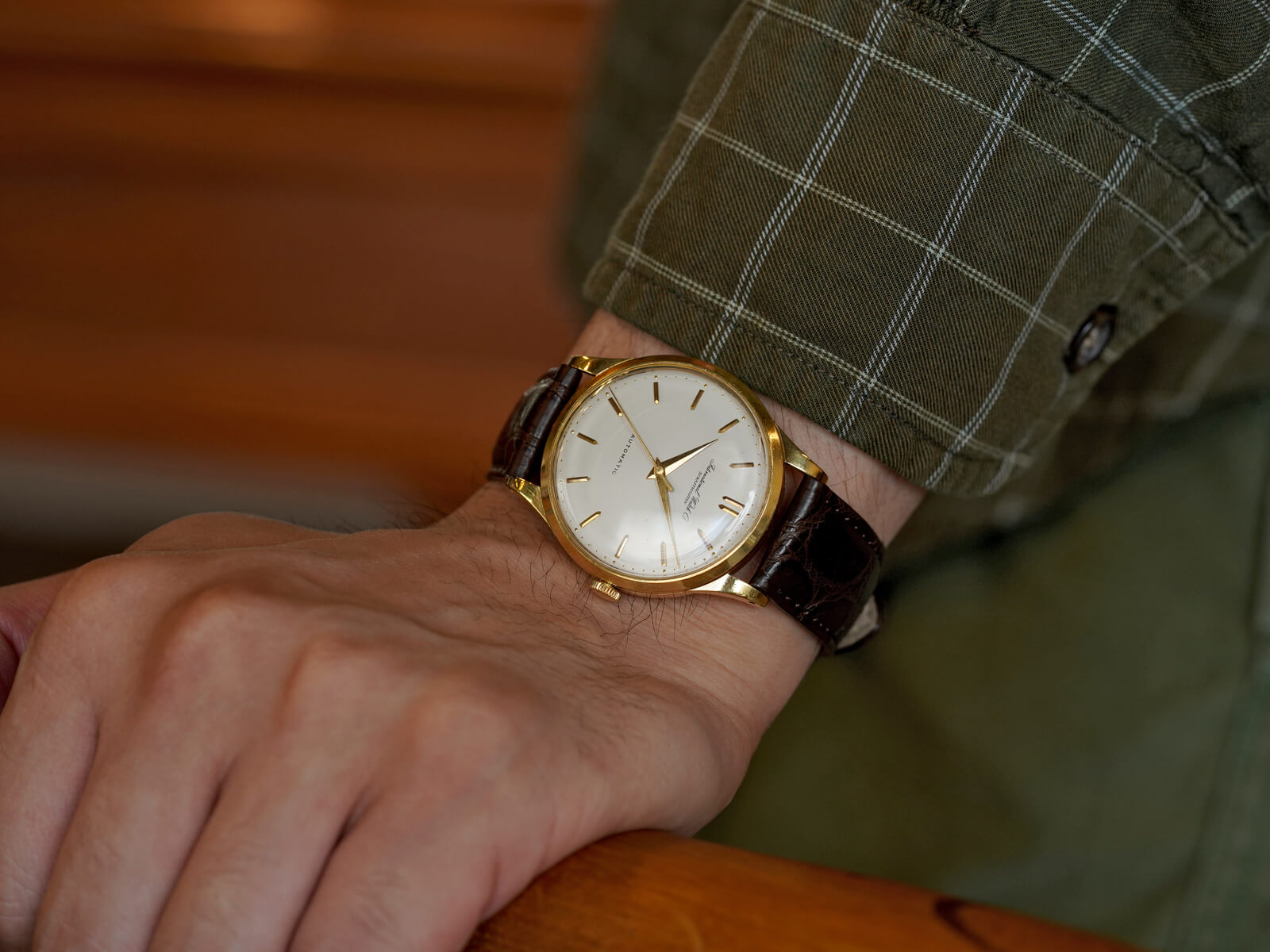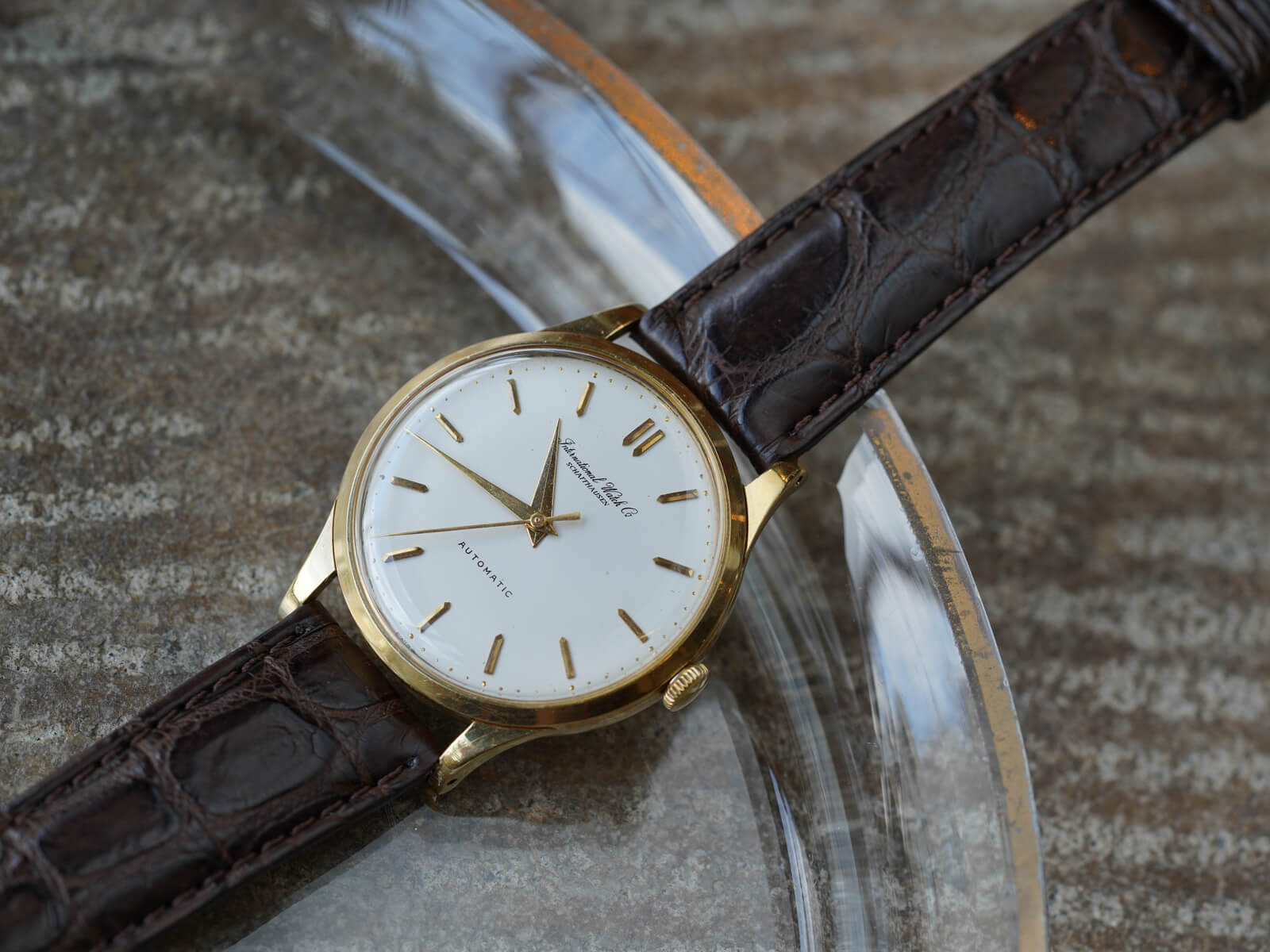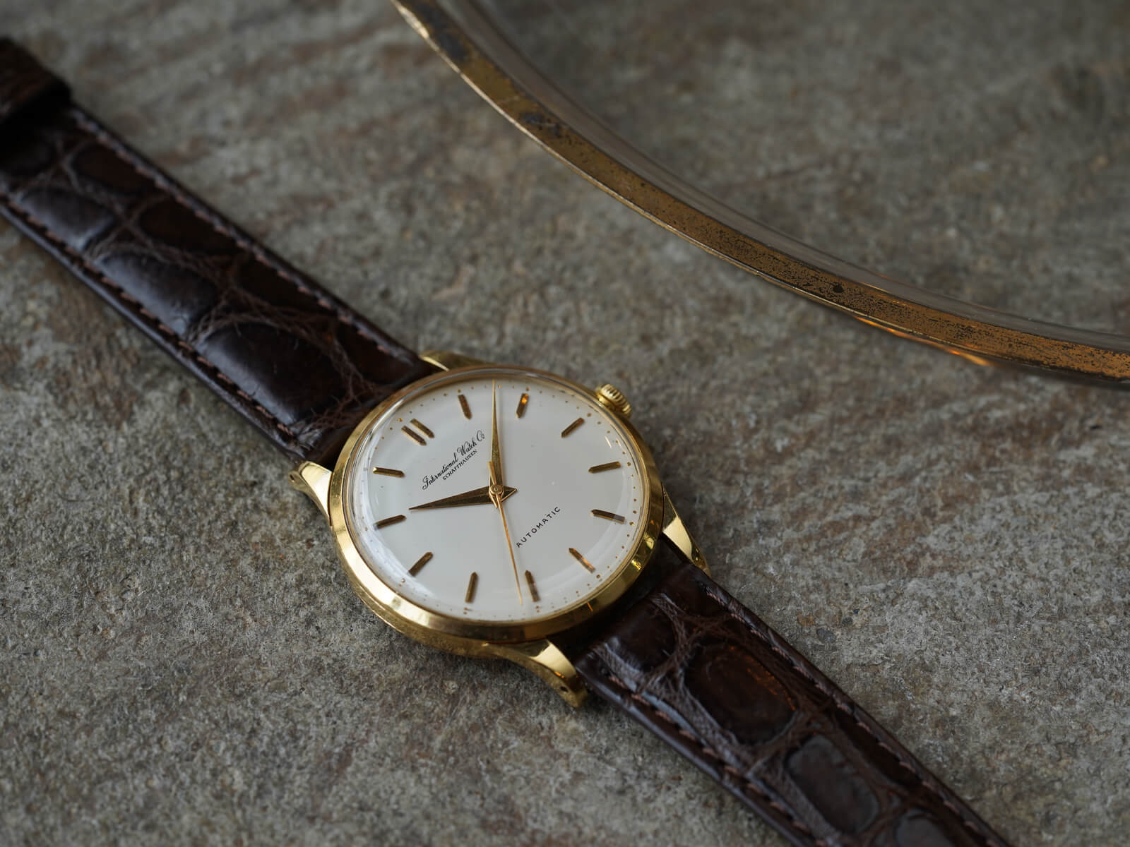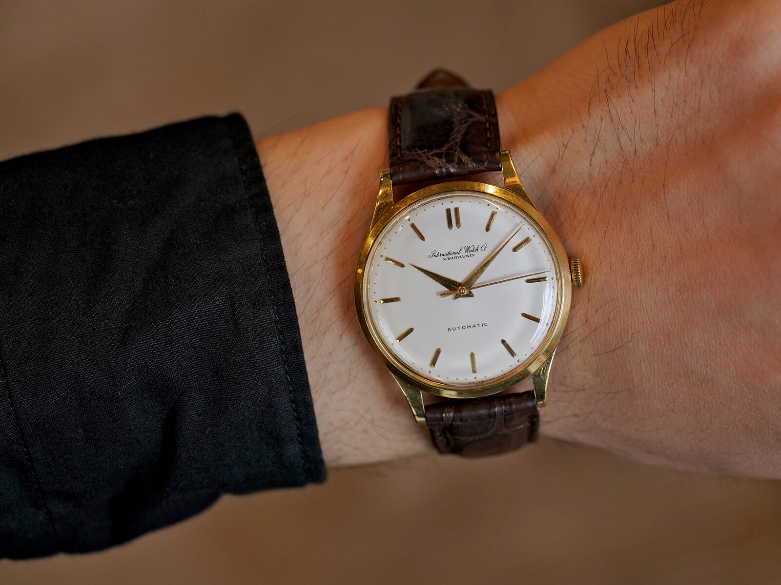 今回のご紹介は、IWCらしくシンプルで美しくスマートな印象のモデルです。風格のあるアイボリーダイヤルに、渋いゴールドのバレットインデックスとドルフィンハンドで、落ち着きを感じさせてくれる魅力的な一本。オールドインター特有の、品の良い筆記体ロゴのみの表記や金属のボールを埋め込まれたミニッツマーカーもあり、シンプルでありながら実用性の高い、職人気質を感じさせる拘りのディテールです。