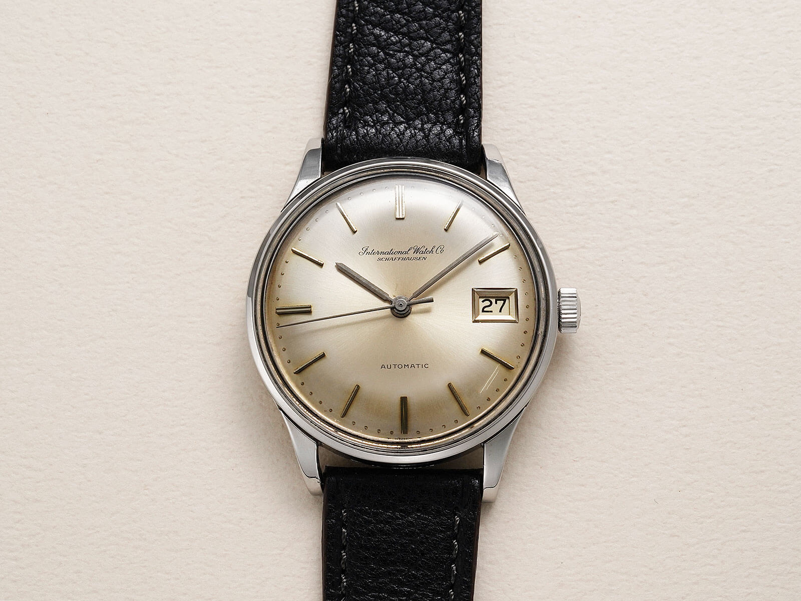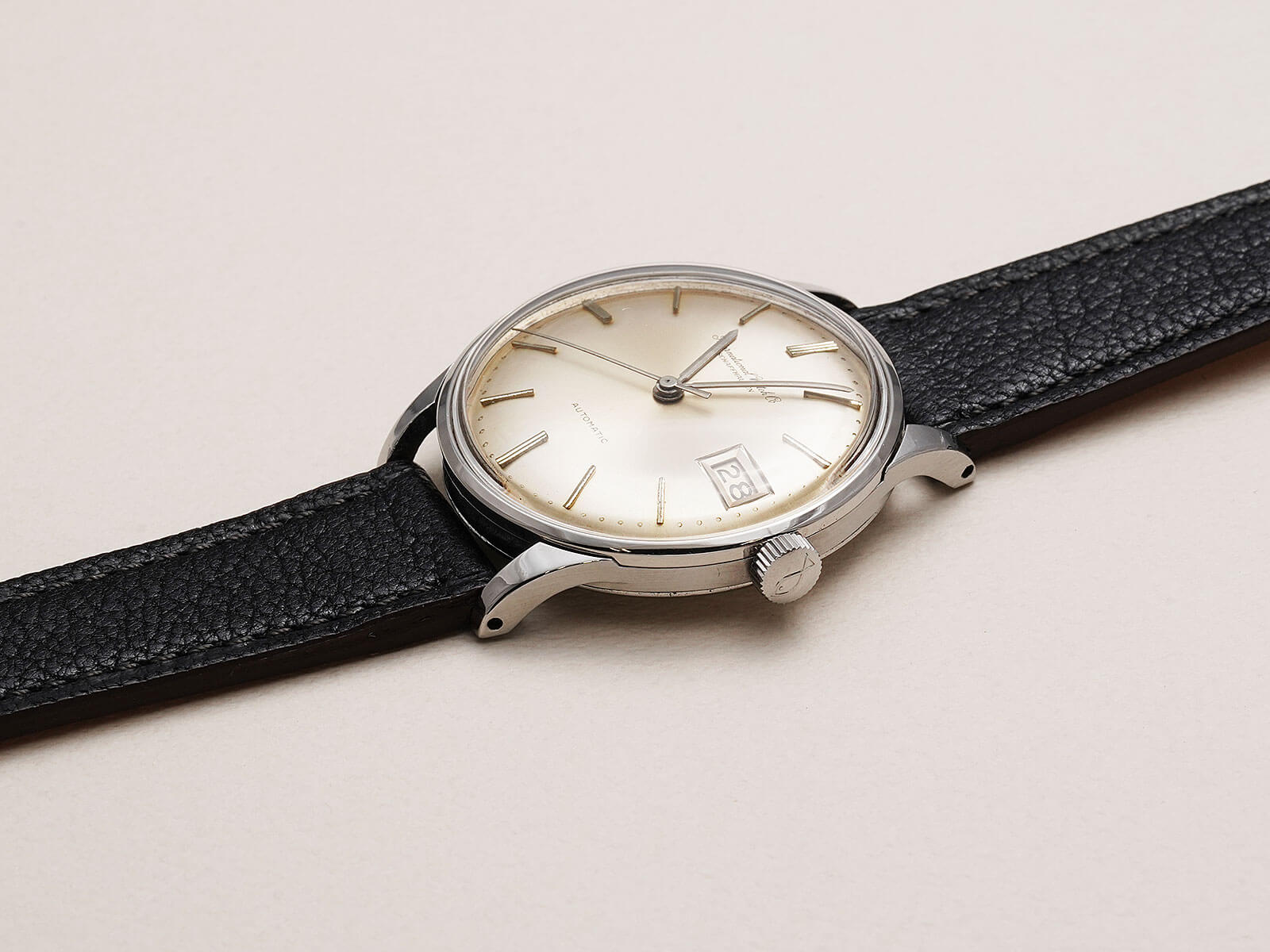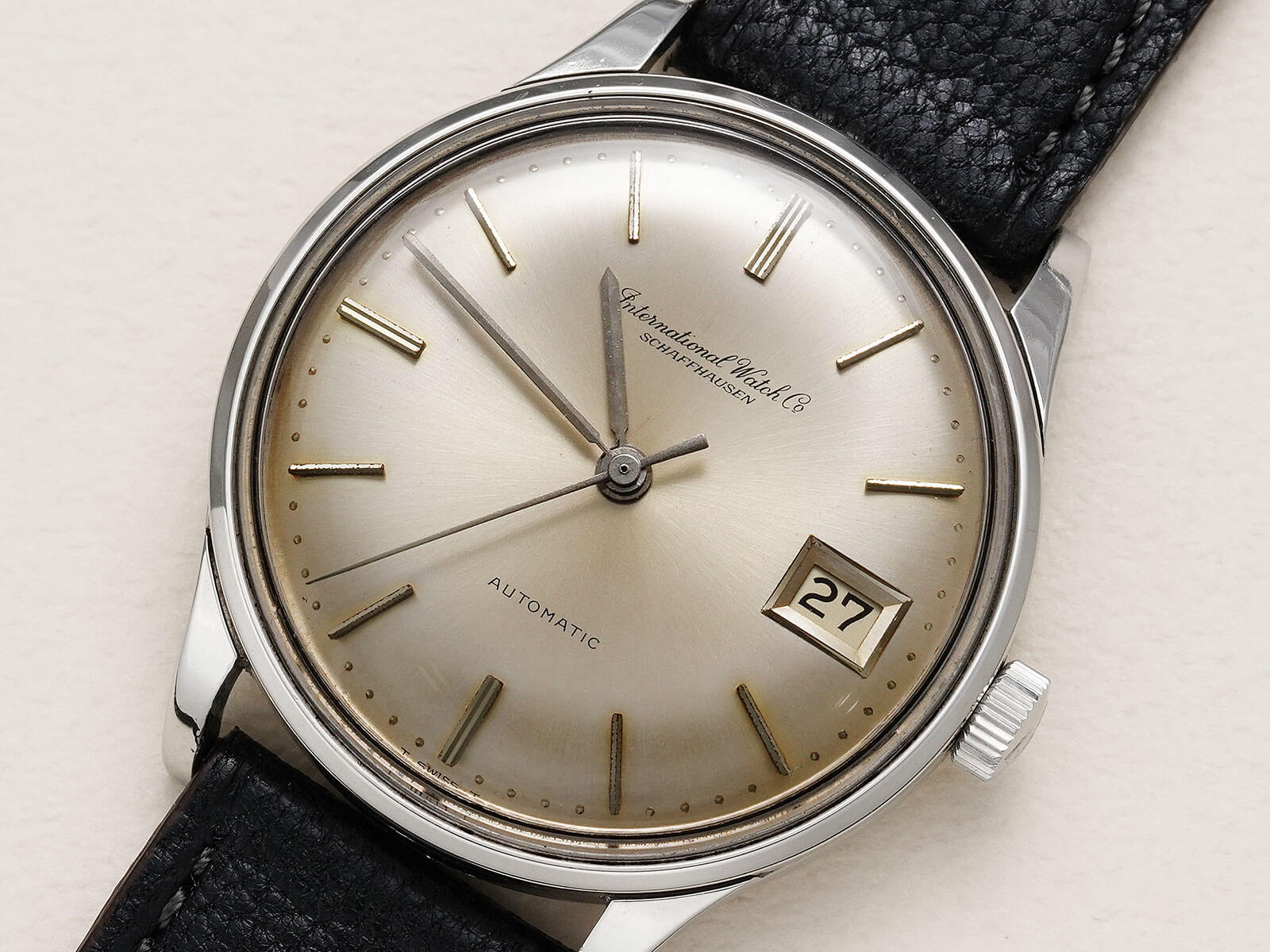 今回は、IWCの中でスタンダードなデイト付きのRef809Aをご紹介です。IWCのアプライドロゴとなる以前の証である筆記体ロゴのみの表記に、サンバースト加工のシルバーダイヤルが、経年により風格のある黄金色に変化。オールドインター特有である金属のボールを埋め込まれた、[パール・ドロップ手法/Pearl drop]というミニッツマーカーも健在し、シンプルでありながら実用性を追求された、拘りのあるディテールに味わいも感じさせてくれます。