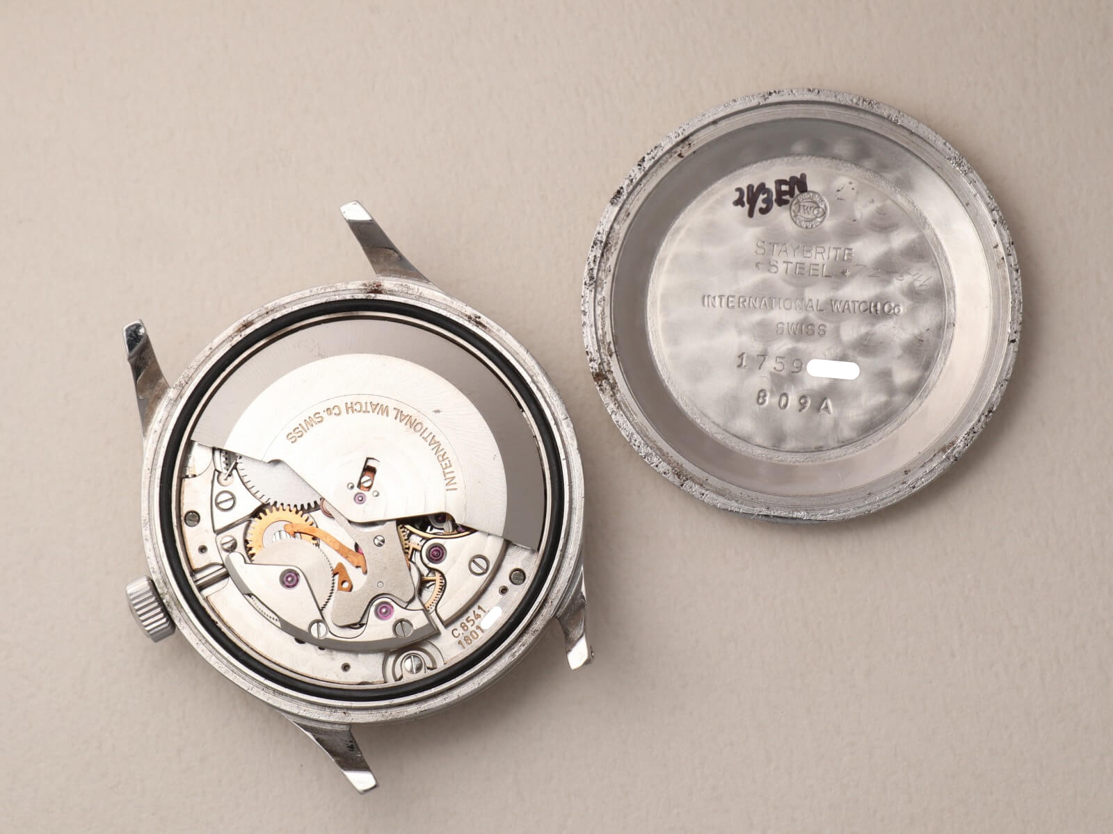 搭載されたムーブメントは、ペラトン式自動巻きキャリバー8541。巻き上げ効率が高く、メンテナンス性にも優れている、IWCの技術者『アルバート・ペラトン/Albert Peraton』の名が今でも残る名機です。23:45と24:00を行き来する事で、日付の早送りもできる高い実用性を兼ね備えております。