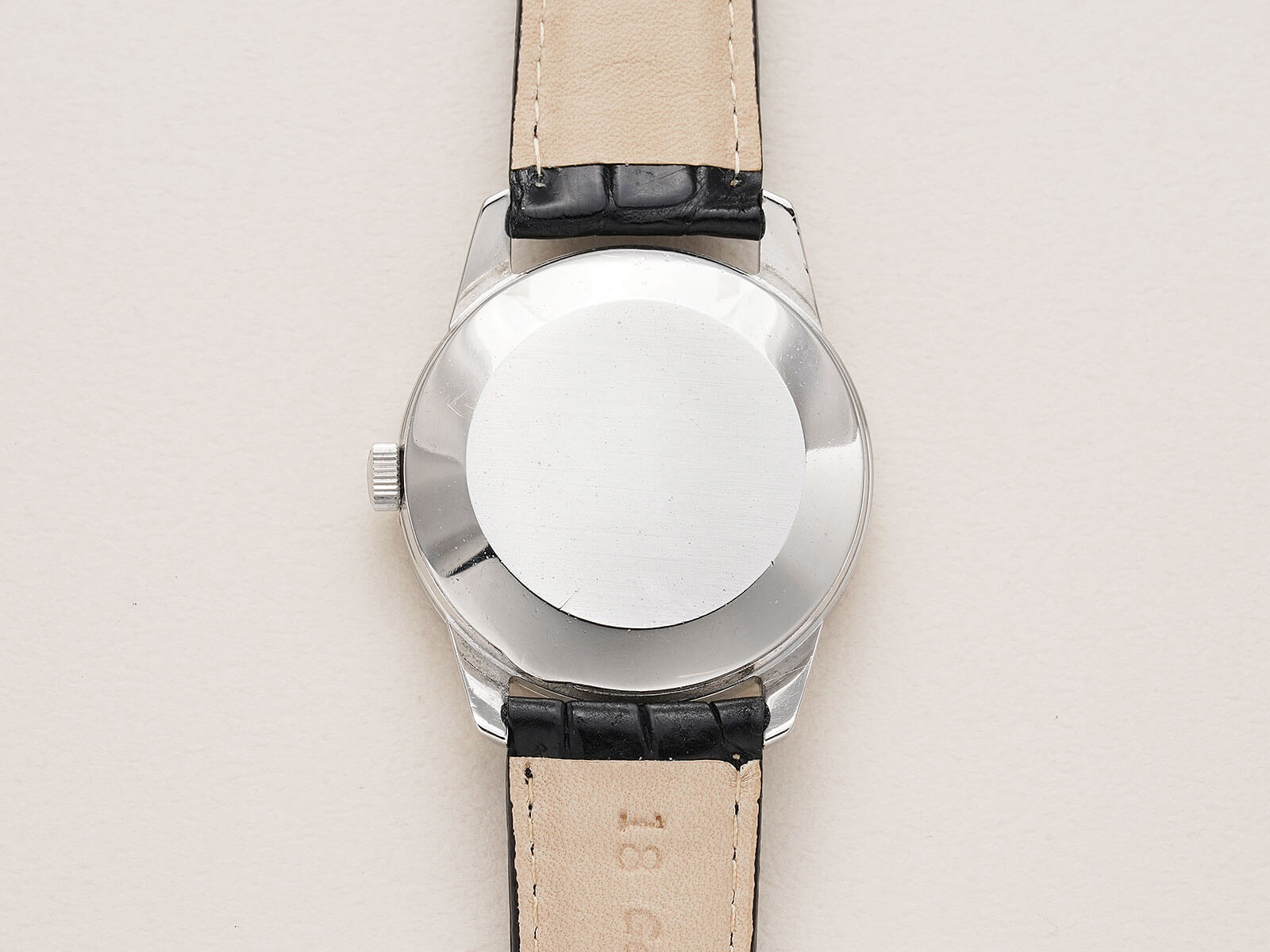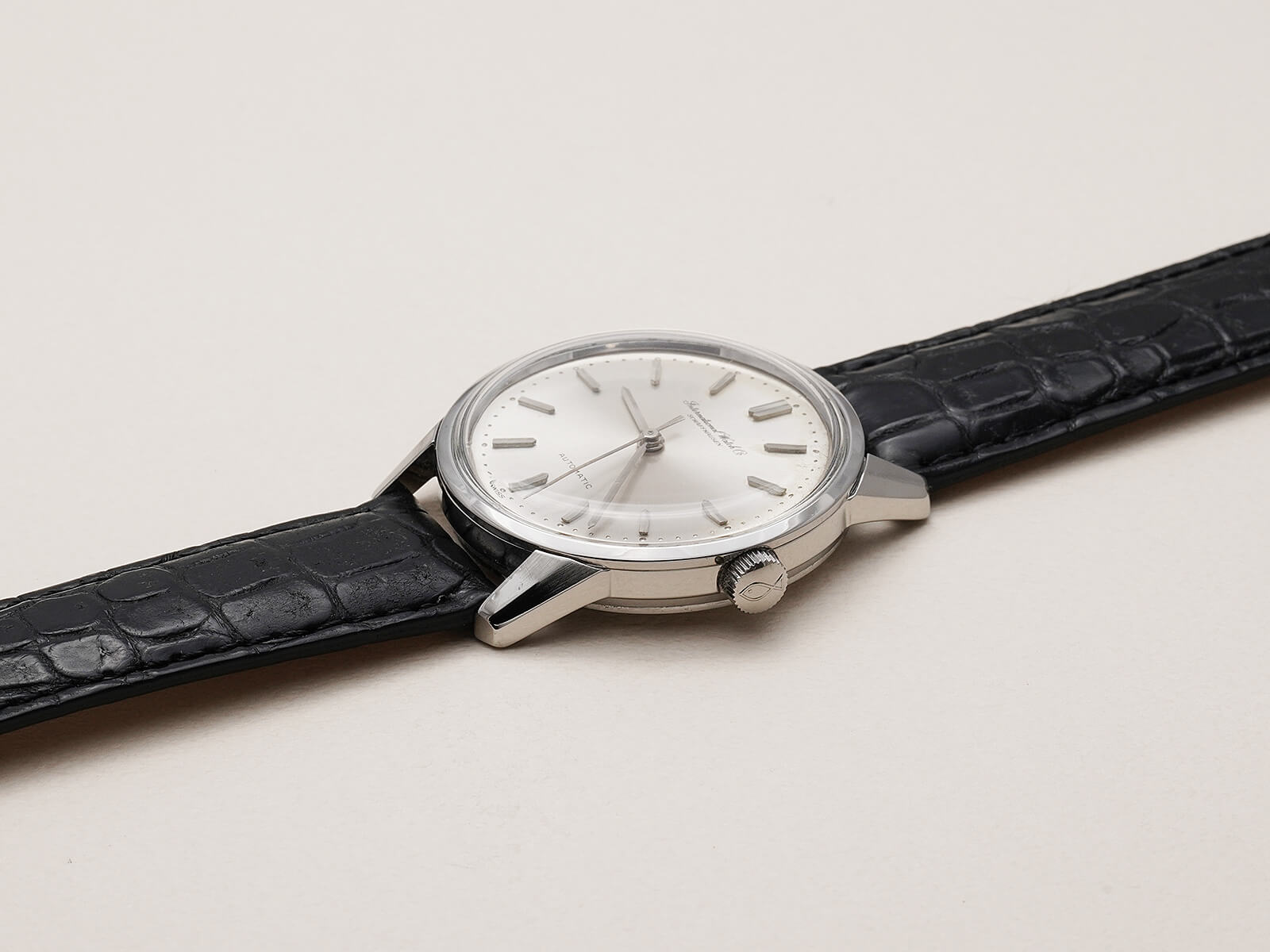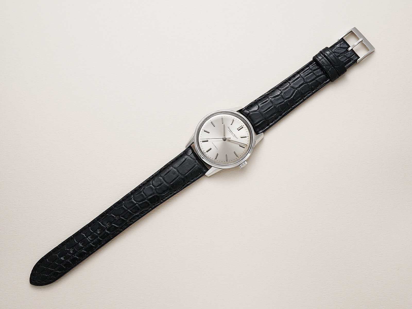 今回は、均整のとれた美しいデザインのモデル、Ref.R810Aのご紹介です。フラットベゼルのシンプルなステンレス製ラウンドケースに、美しいサンバースト加工が施されたシルバーダイヤルと、バレットインデックスや筆記体のブランド表記が、ドレスウォッチの要素を感じさせてくれる綺麗なデザインです。オールドインター特有である魚マークのリューズと、ミニッツマーカーに金属のボールを埋め込んだ職人気質の宿る”パール・ドロップ”手法も健在しております。