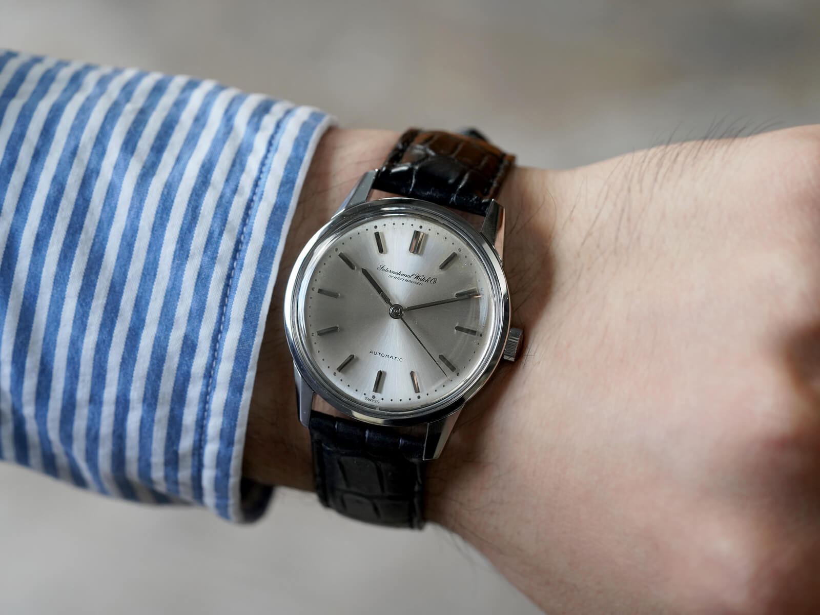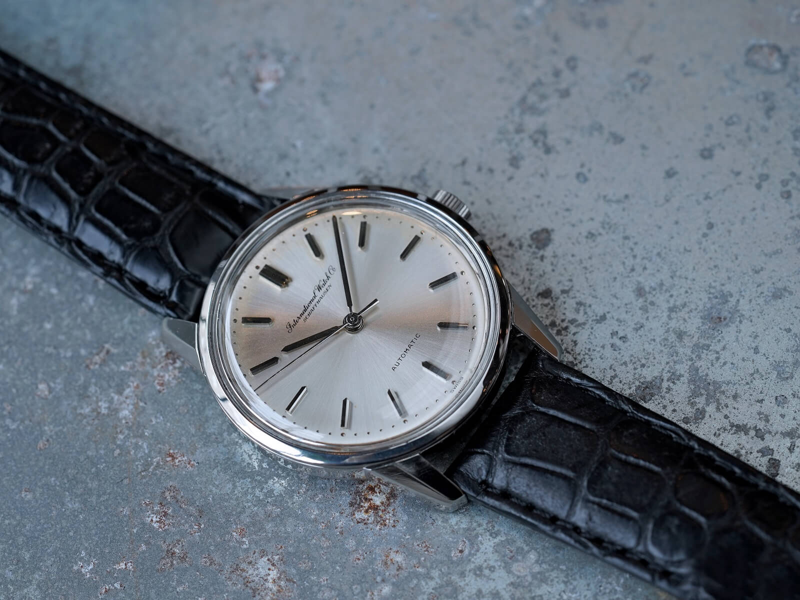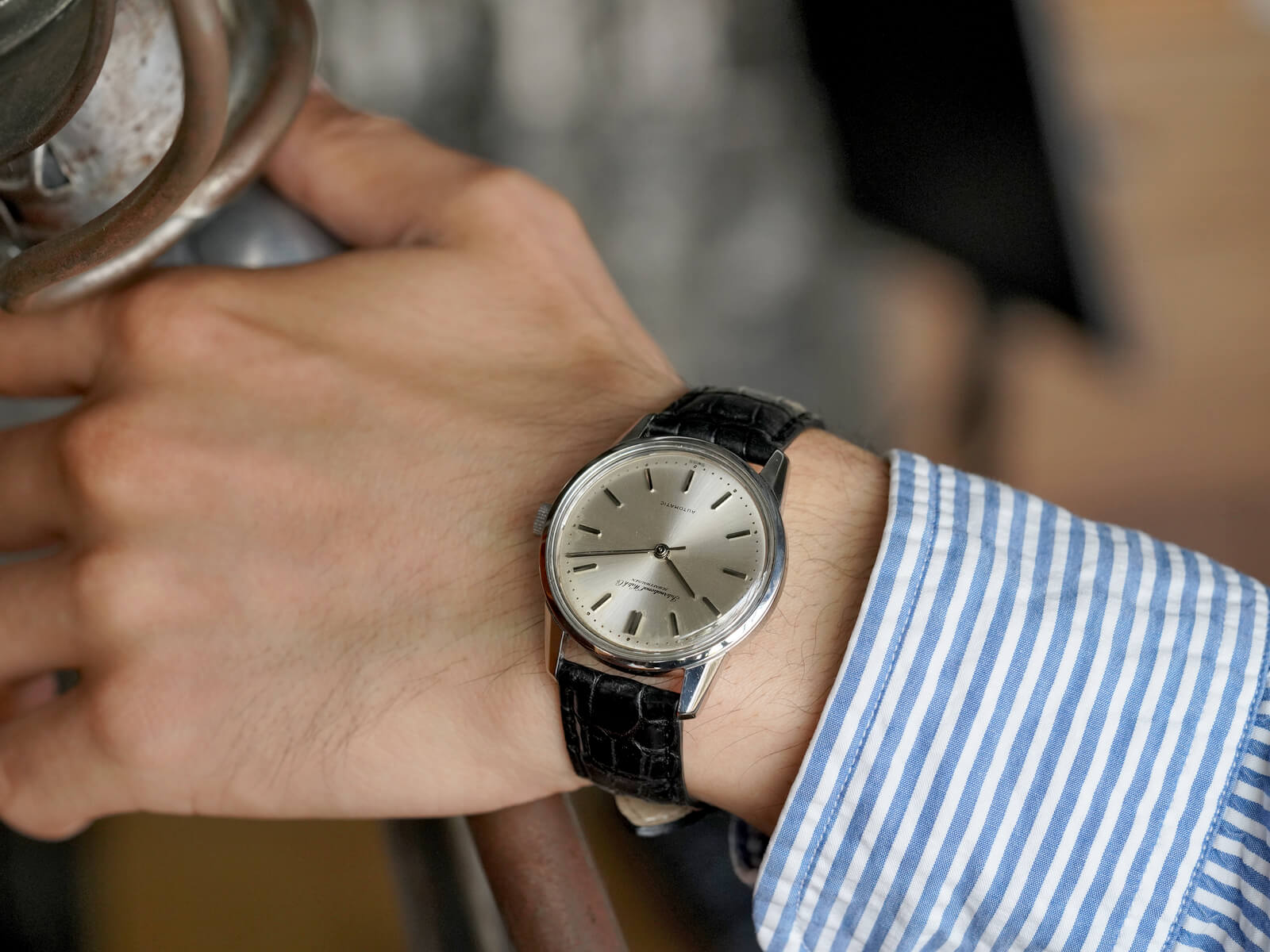 今回は、均整のとれた美しいデザインのモデル、Ref.R810Aのご紹介です。フラットベゼルのシンプルなステンレス製ラウンドケースに、美しいサンバースト加工が施されたシルバーダイヤルと、バレットインデックスや筆記体のブランド表記が、ドレスウォッチの要素を感じさせてくれる綺麗なデザインです。オールドインター特有である魚マークのリューズと、ミニッツマーカーに金属のボールを埋め込んだ職人気質の宿る”パール・ドロップ”手法も健在しております。