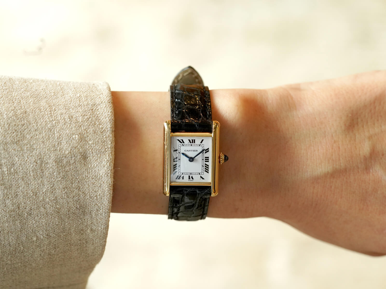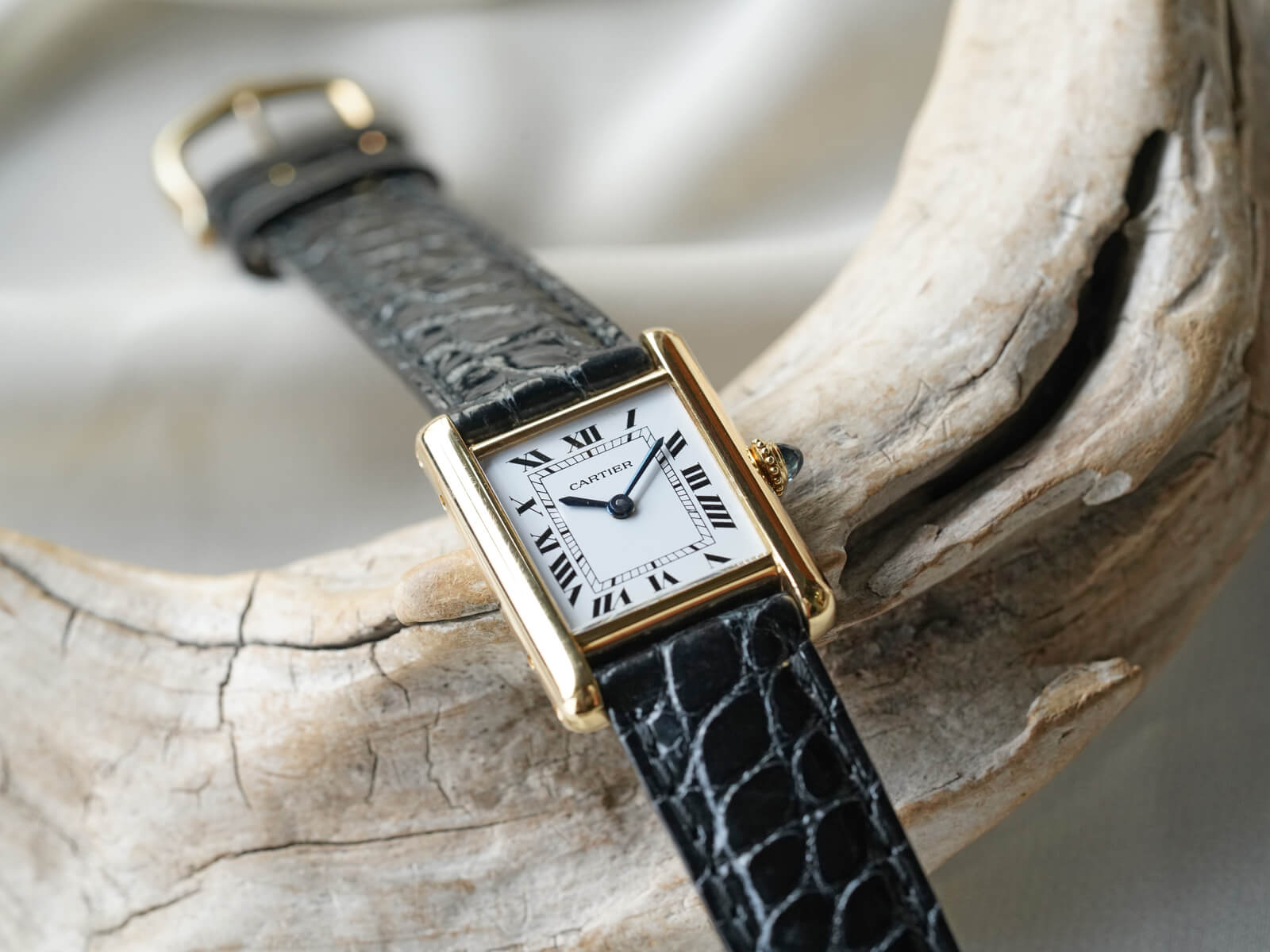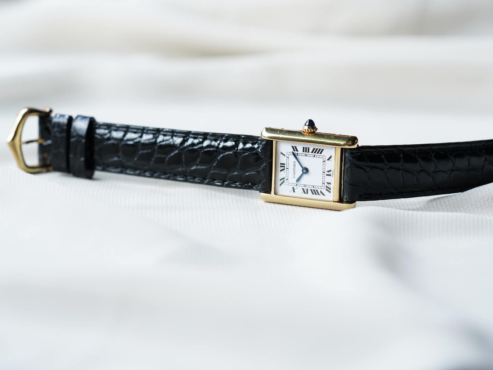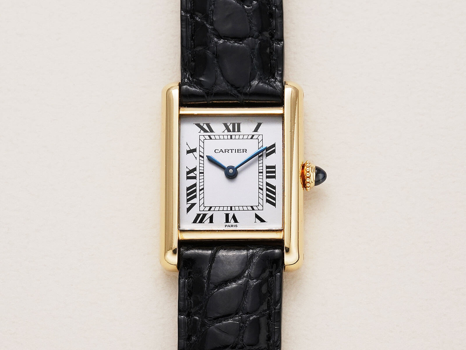 今回は、クラシカルな印象の手巻きモデル「タンクルイカルティエSM / Tank Louis Cartier」Ref.78087のご紹介です。シンプルなラインで高級感溢れるレクタンギュラーケースに、伝統のホワイトローマンダイヤルと6時下のPARIS表記、理想的な形と言える"砲弾型"のサファイアカボションリューズ等で、クラシカルな世界観にさりげない装飾美を演出した素晴らしい時計です。