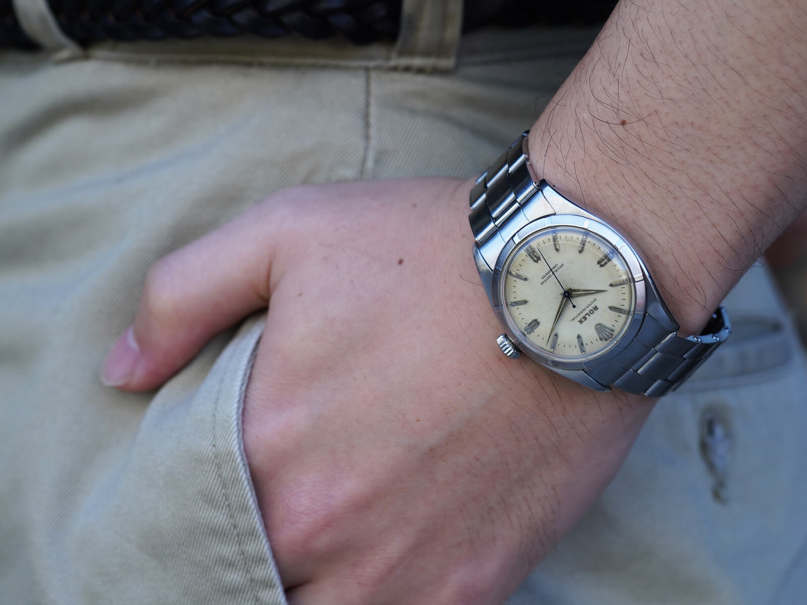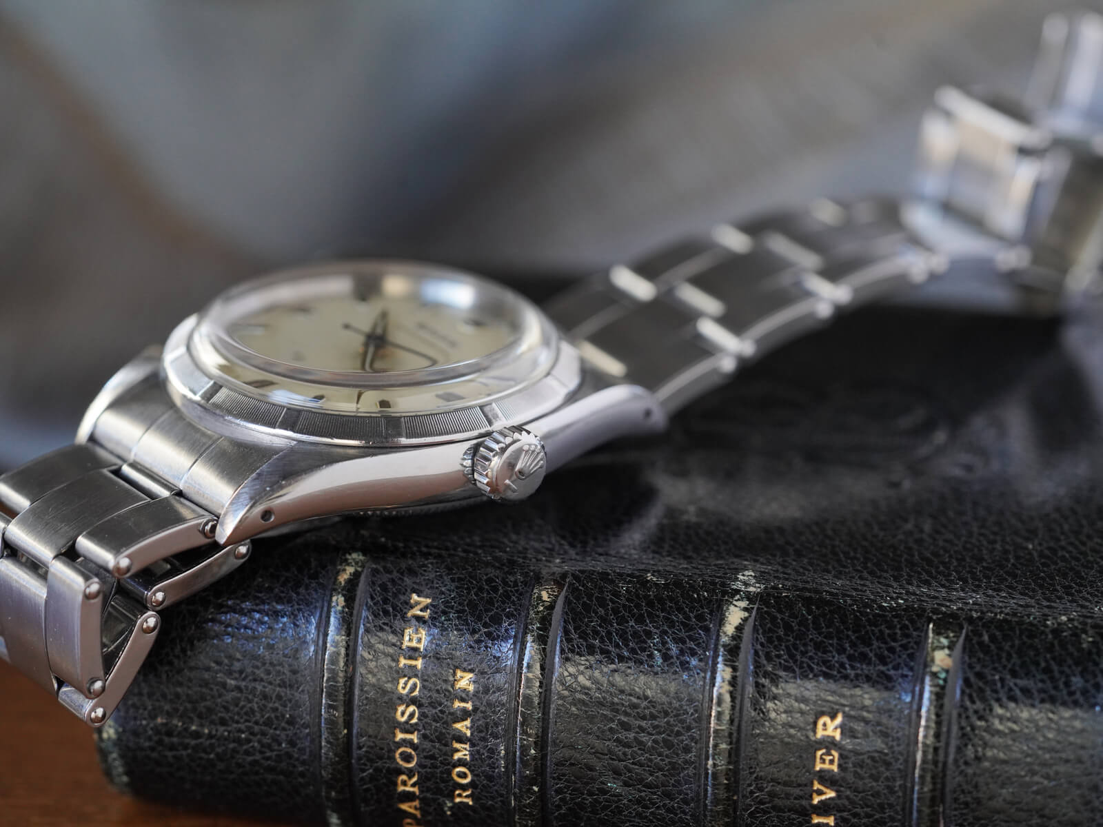 ムーブメントには、クロノメーター規格を通過したキャリバー1030を搭載。世界初の両方向巻き上げ式として開発され、50年代の象徴である「Unicorn Rotor / ユニコーンローター」がセッティングされた、ロレックス黄金期を支えた名機です。