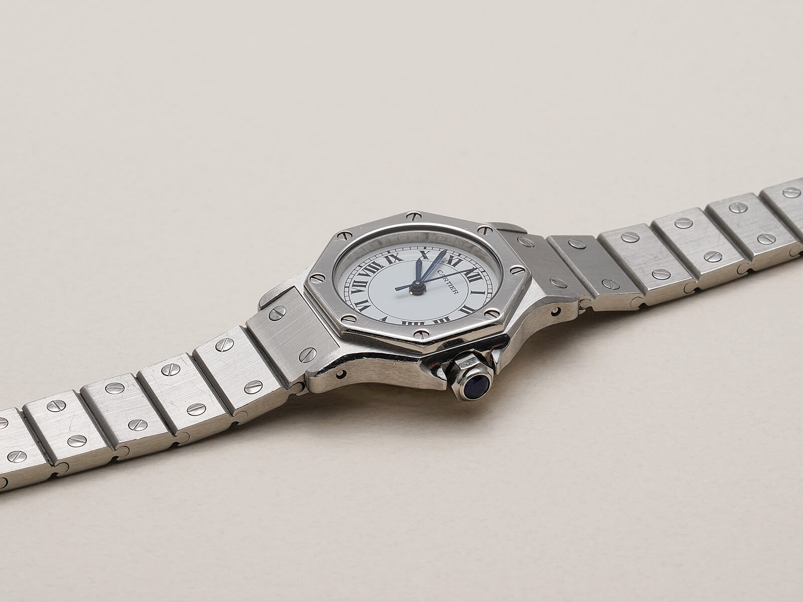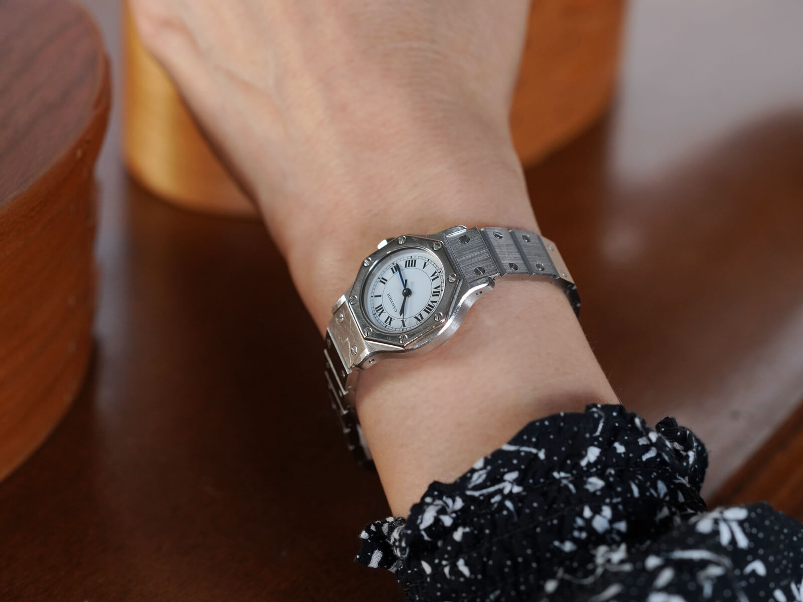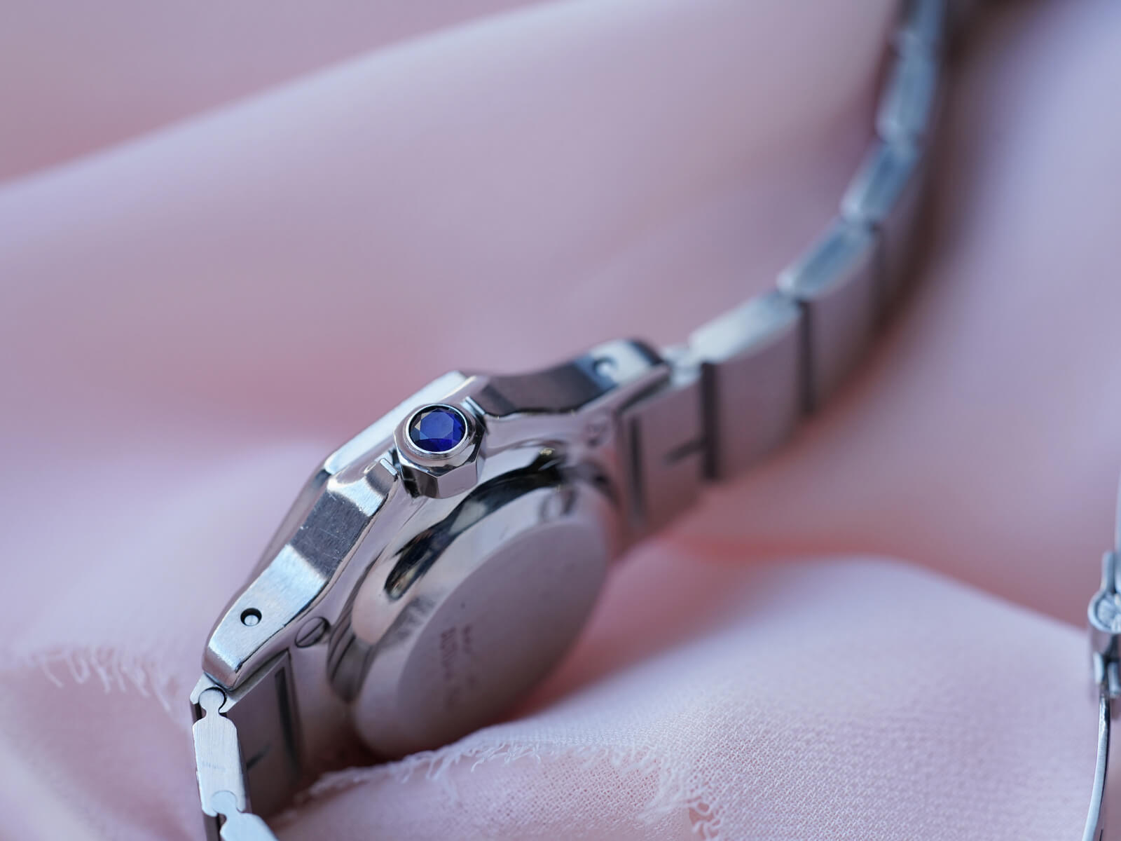 『8角形』を意味するオクタゴンのベゼルと伝統のホワイトローマンインデックスとブルースチールハンド、カボションリューズが揃い、カルティエらしいジュエリー要素も感じさせてくれるスポーツウォッチ。この感覚は他の時計ブランドからは感じることのできない、カルティエだからこそできるデザインと言えます。