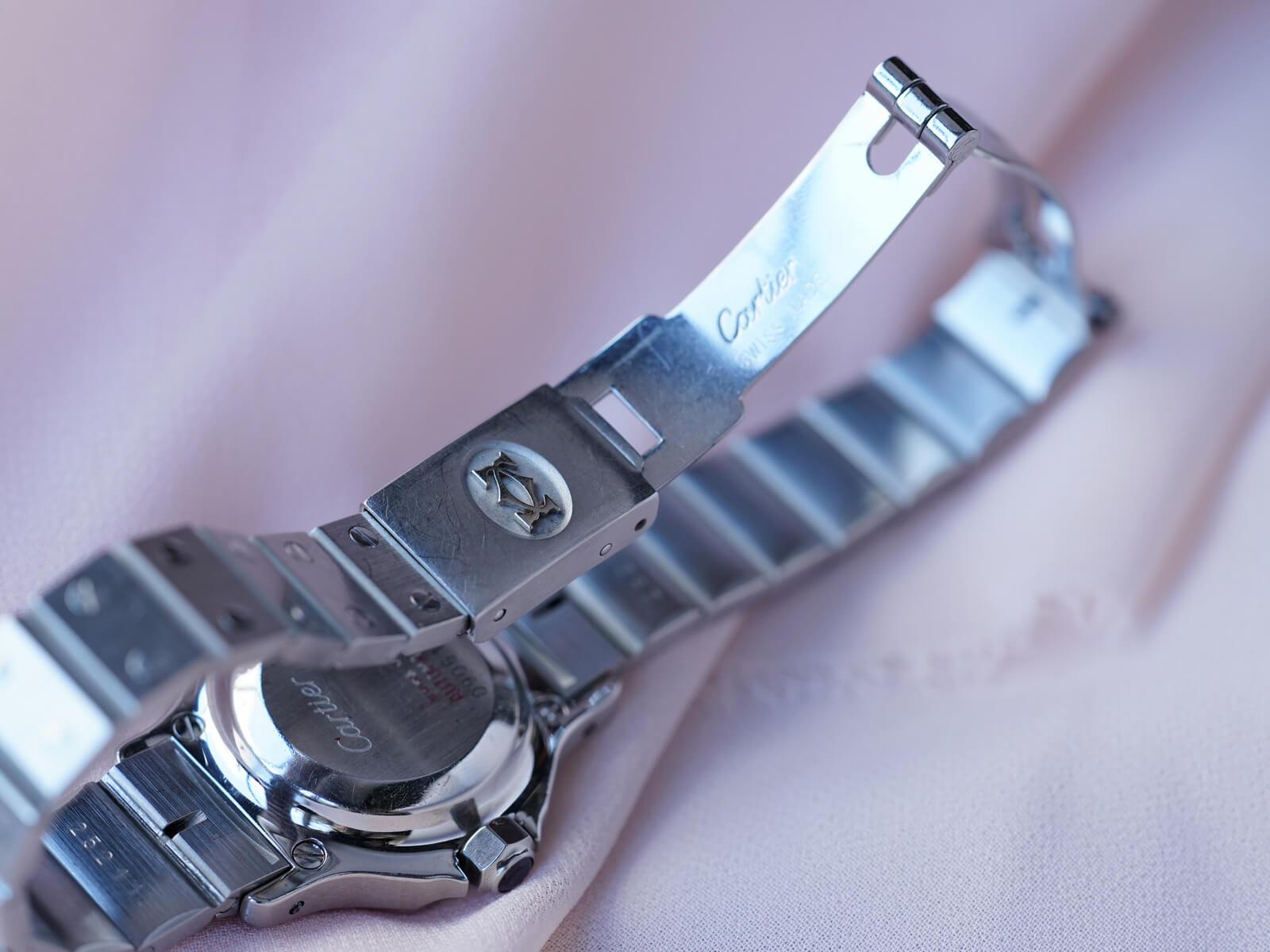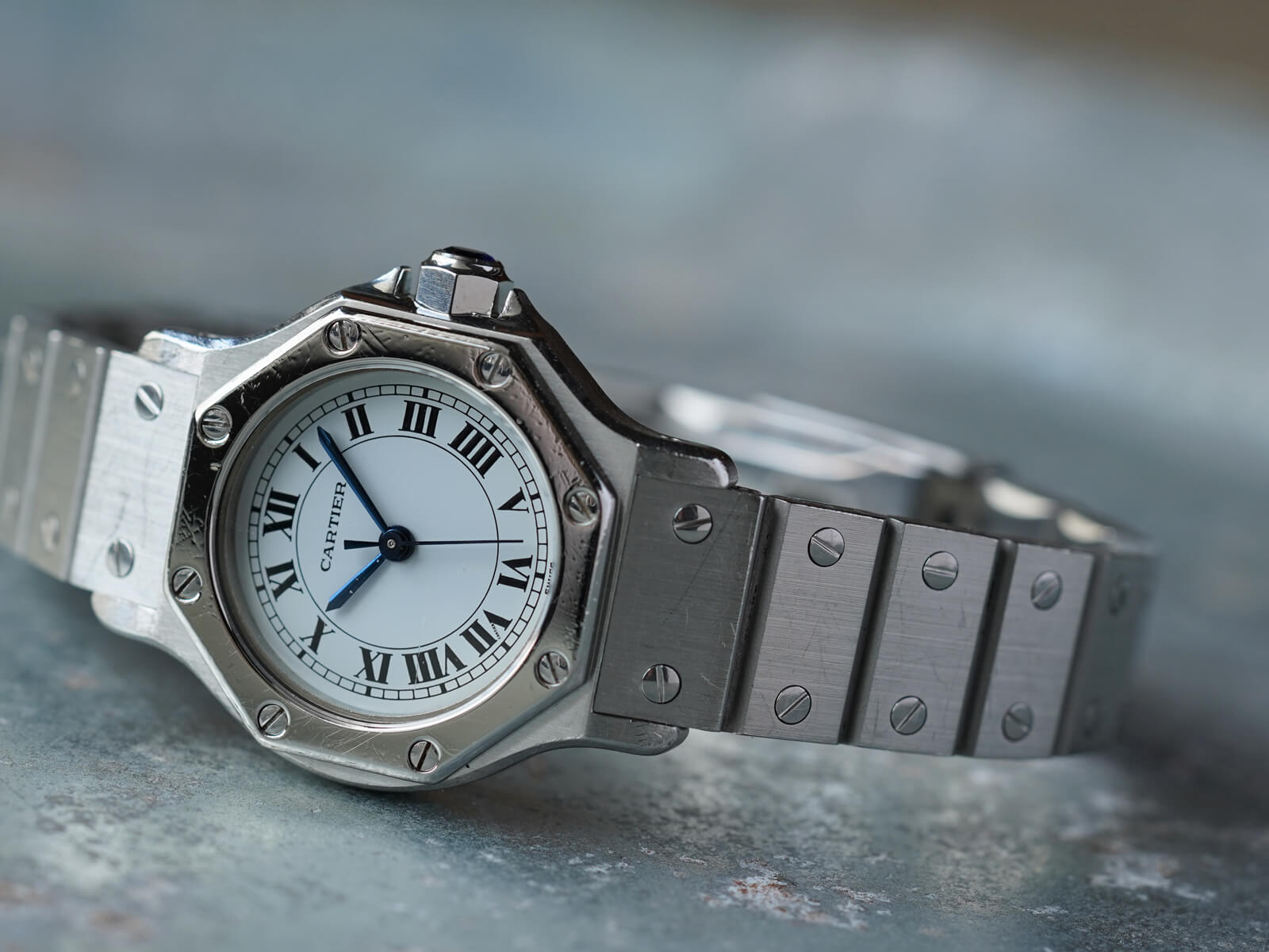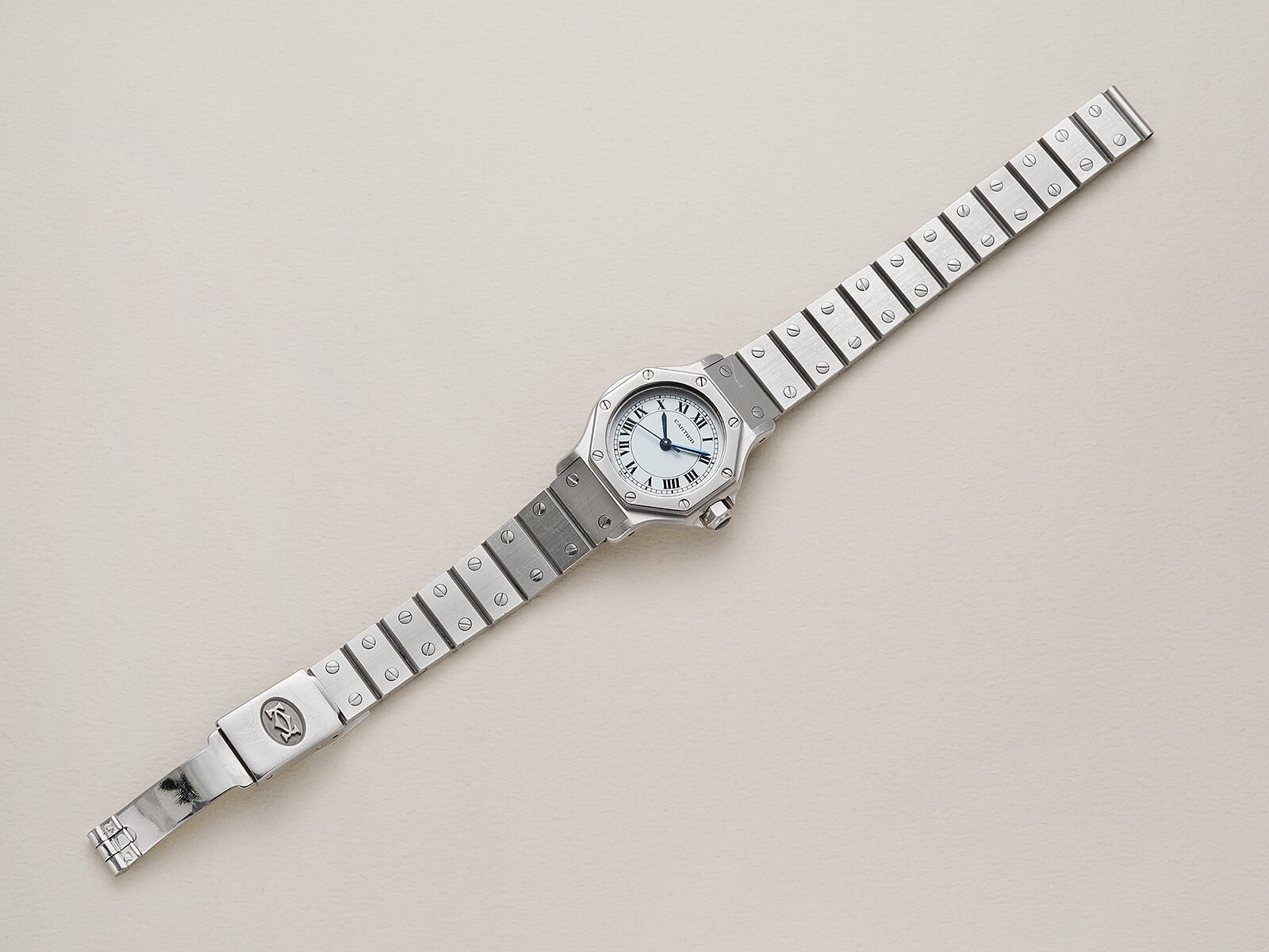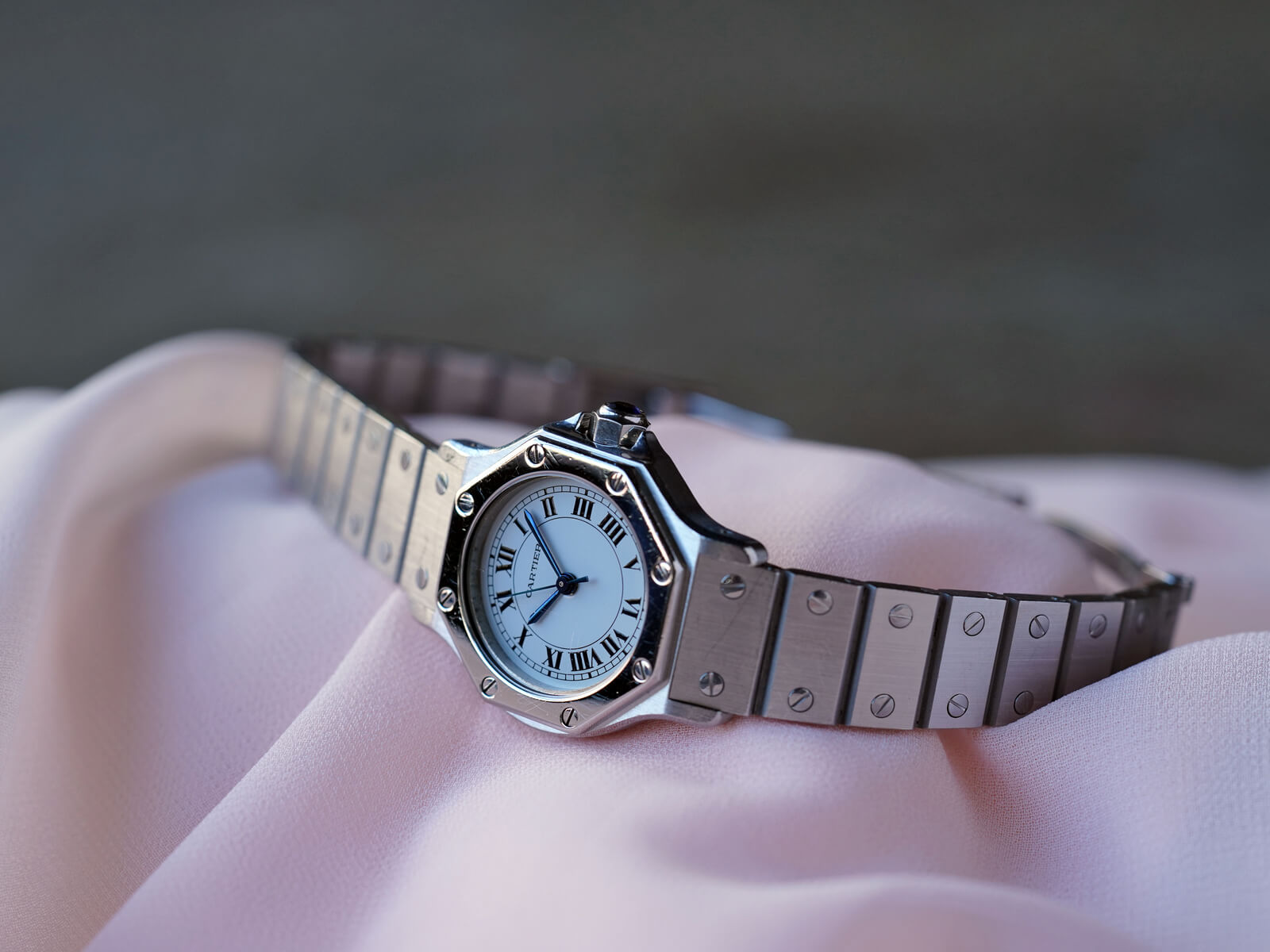 『8角形』を意味するオクタゴンのベゼルと伝統のホワイトローマンインデックスとブルースチールハンド、カボションリューズが揃い、カルティエらしいジュエリー要素も感じさせてくれるスポーツウォッチ。この感覚は他の時計ブランドからは感じることのできない、カルティエだからこそできるデザインと言えます。
