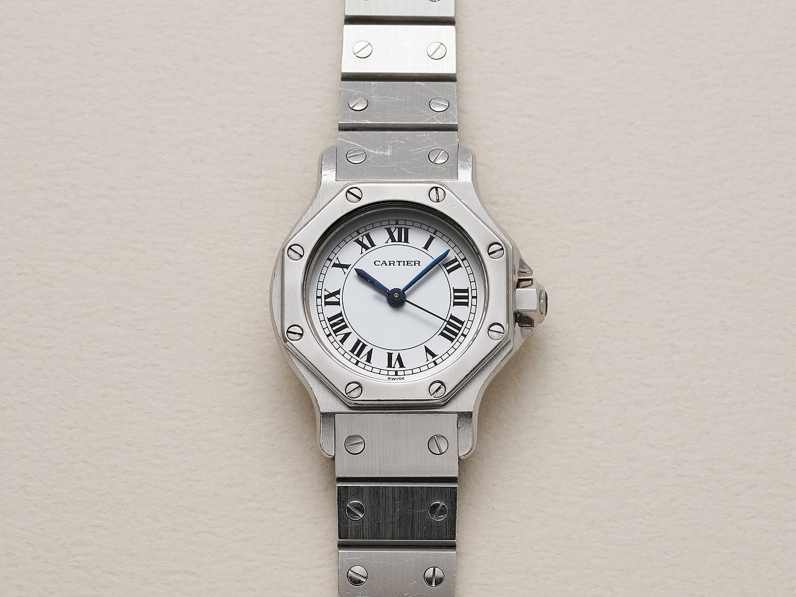 今回は、カルティエを代表するサントスシリーズで、生産終了した自動巻きモデル「サントスオクタゴン / Santos Octagon」Ref.0906のご紹介です。当時ラグジュアリースポーツウォッチとして発売されていた為、イエローゴールドとのコンビが多く、オールステンレスケースモデルは生産数が少なく希少な一本です。すっきりとした精悍な顔立ちで、お手元を現代的でスタイリッシュな雰囲気を演出された素晴らしいモデルです。