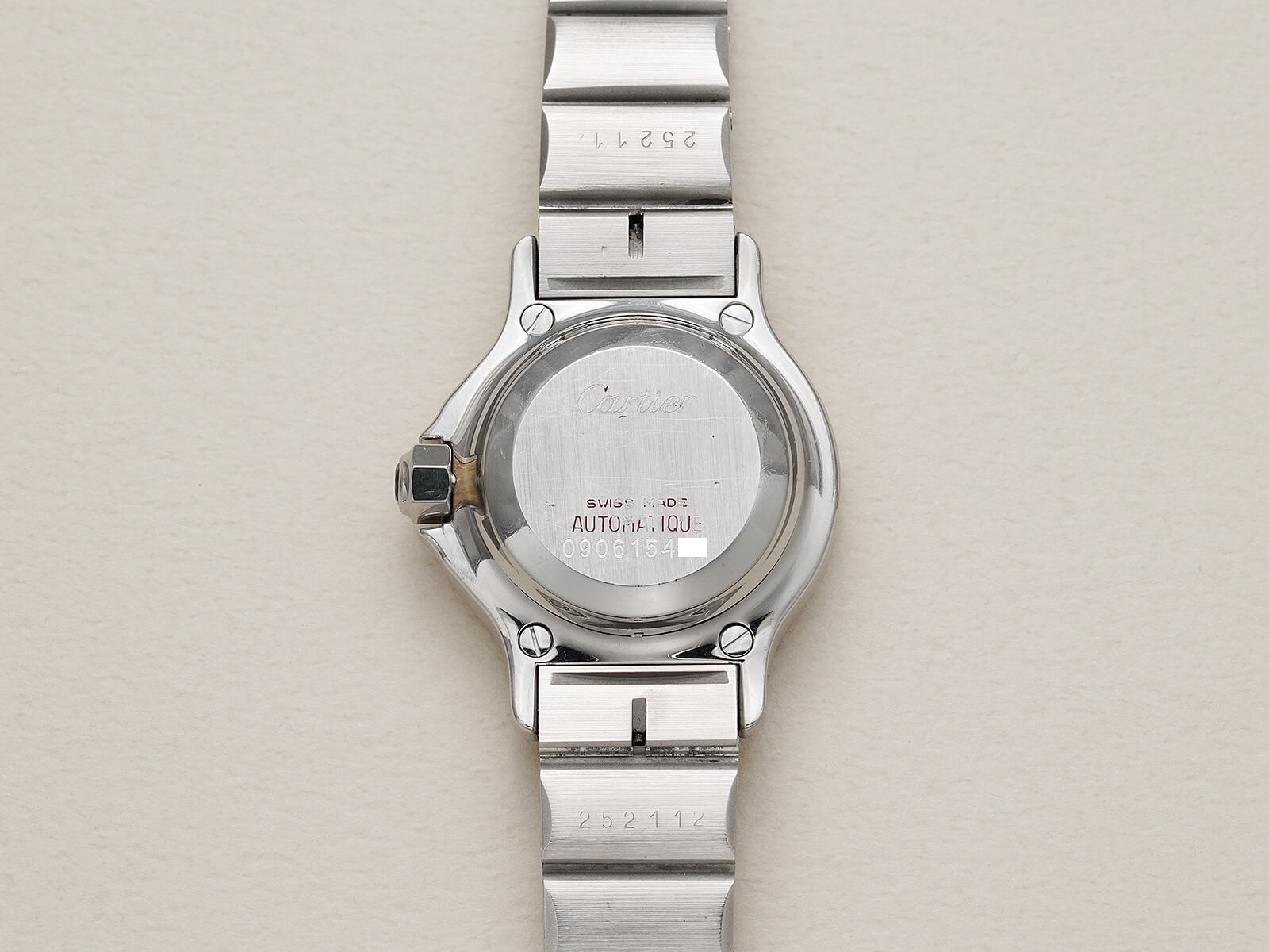 ブレスレットには、当時から交換されていない初期型カルティエロゴ入リシングルバックルがセッティングされたラブブレスを付属。スポーツ要素を感じさせながらも上品さを演出した、汎用性の高い魅力的な一本です。是非店頭にてご覧下さい。