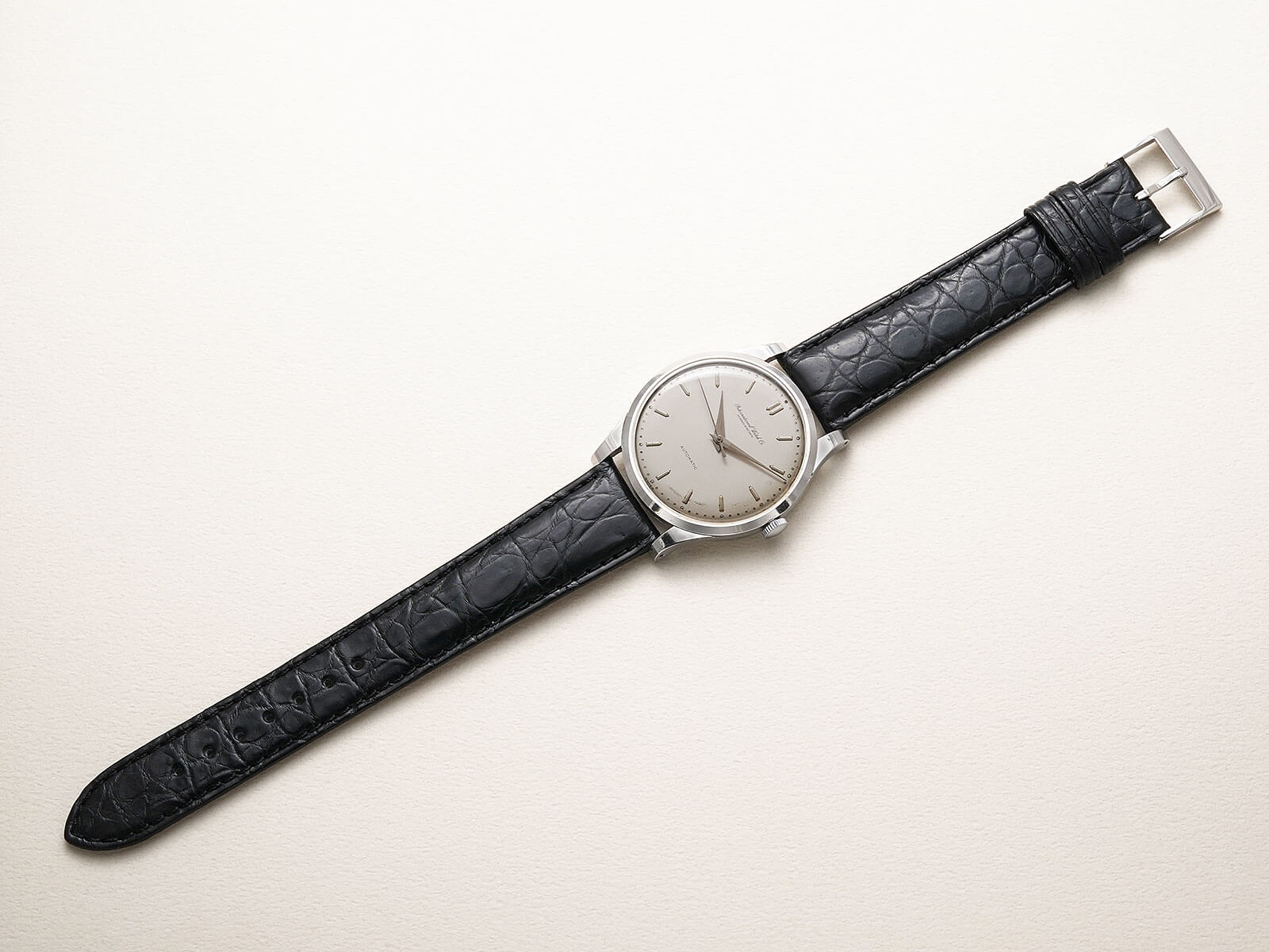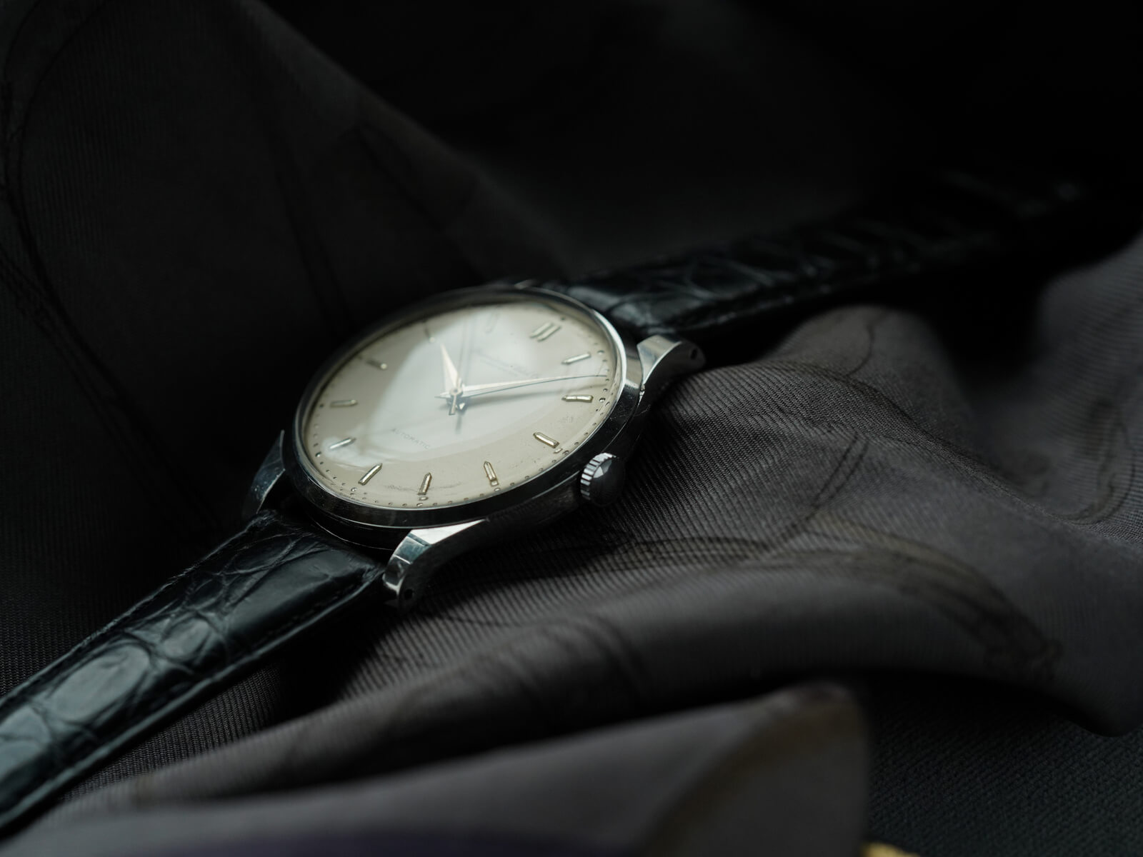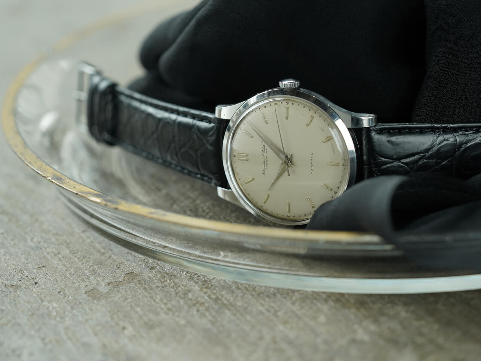 今回は、形の良いステンレス製ラウンドケースで、風格を感じさせてくれるモデルのご紹介です。ほのかにアイボリーがかった優しい色合いのダイヤルに、バレットインデックスとドルフィンハンドが、ヴィンテージテイストを強く感じさせ、シンプルで存在感の際立つ美しいデザイン。オールドインター特有の筆記体ロゴのみの表記や、ミニッツマーカーに金属のボールを埋め込む[パール・ドロップ手法/Pearl drop]等、職人の卓越した手仕事によって織り成された、端正な表情が魅力的です。