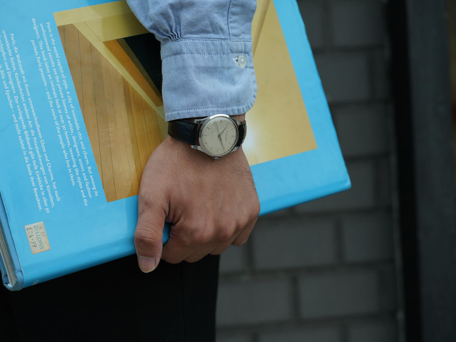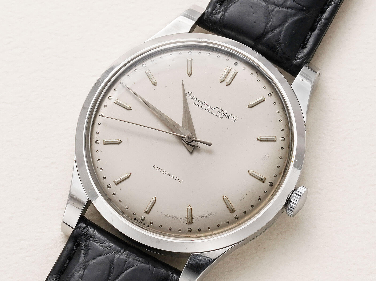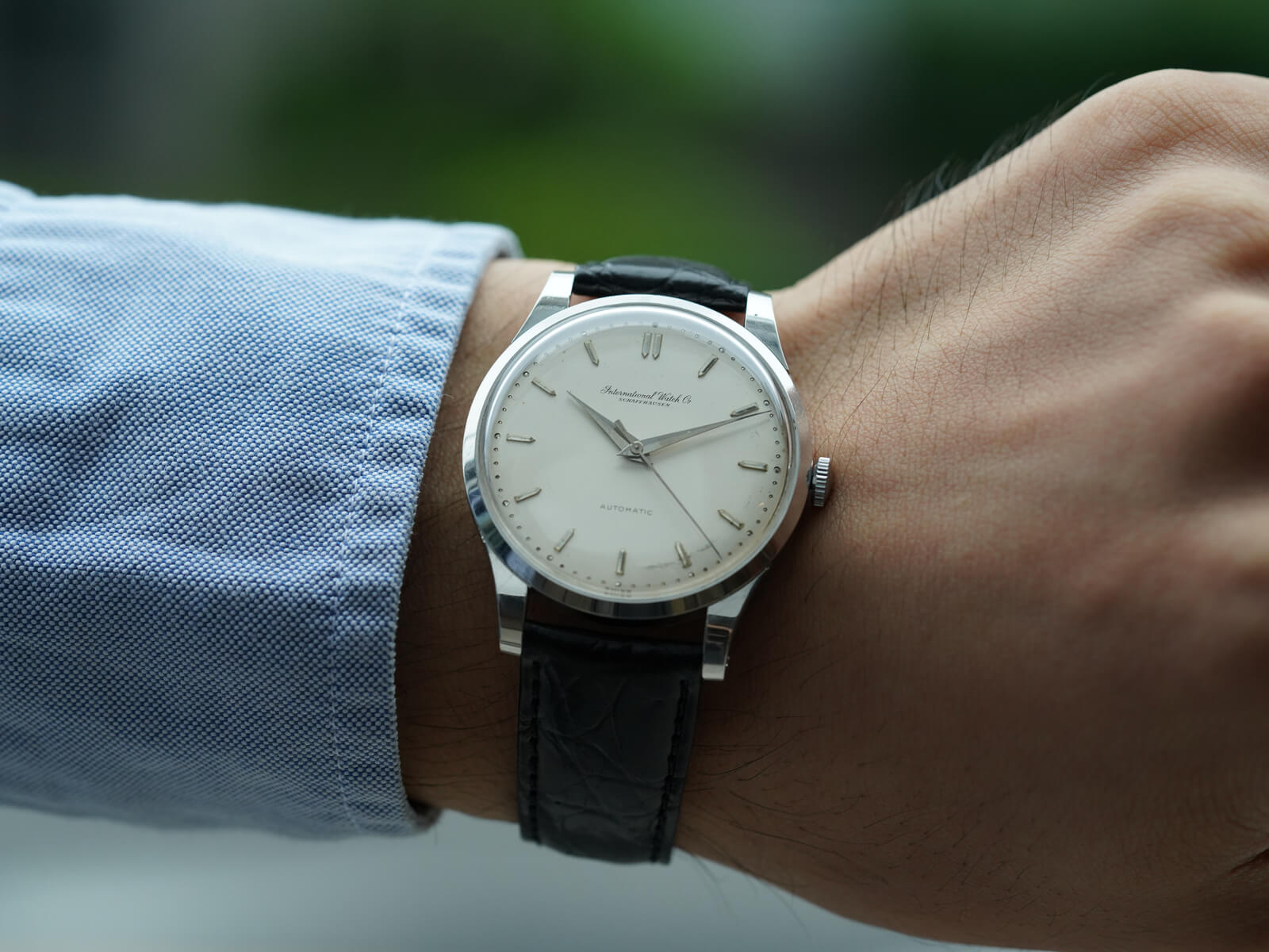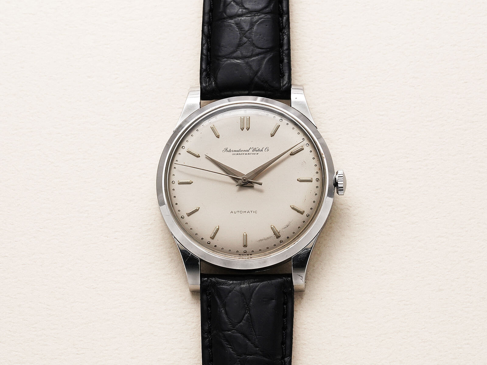 今回は、形の良いステンレス製ラウンドケースで、風格を感じさせてくれるモデルのご紹介です。ほのかにアイボリーがかった優しい色合いのダイヤルに、バレットインデックスとドルフィンハンドが、ヴィンテージテイストを強く感じさせ、シンプルで存在感の際立つ美しいデザイン。オールドインター特有の筆記体ロゴのみの表記や、ミニッツマーカーに金属のボールを埋め込む[パール・ドロップ手法/Pearl drop]等、職人の卓越した手仕事によって織り成された、端正な表情が魅力的です。