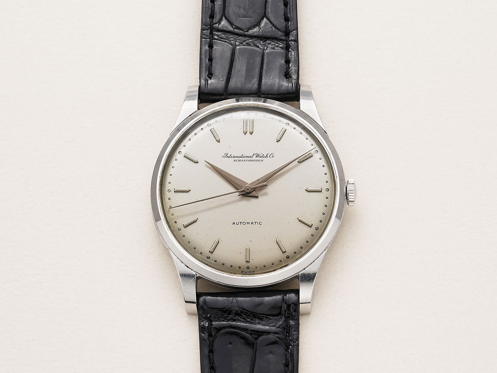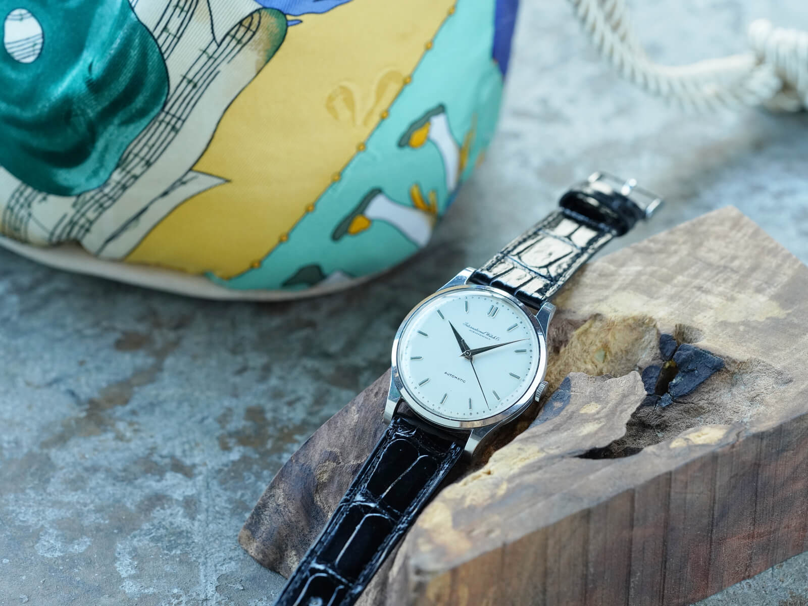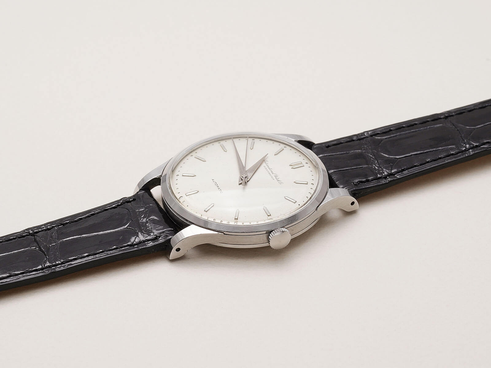 今回のご紹介は、シンプルで上品な雰囲気を漂わせたスタイルの良いモデルです。趣のあるアイボリーダイヤルに、独特な形のバレットインデックスやドルフィンハンド、繊細さを感じさせる筆記体ロゴ表記が、格別な美しさを演出しています。勿論、オールドインター特有と言える、金属のボールが埋め込まれたミニッツマーカーもあり、シンプルでありながら職人気質漂う一本。