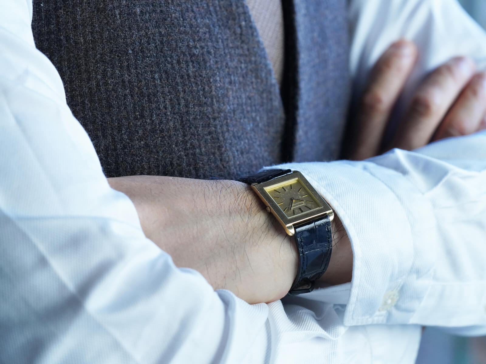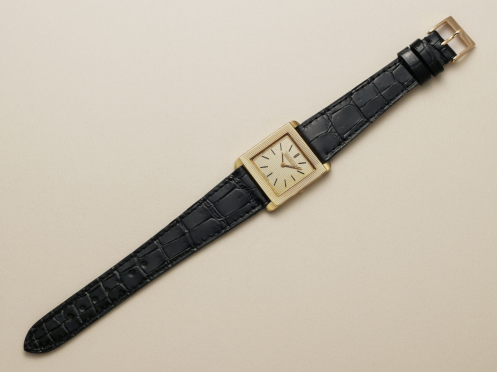 レザーブレスには、当店オリジナルのクロコダイルレザーのシャイニーブラックをセッティング。美しいスクエアケースが、スタイル良くエレガントな雰囲気を纏わせてくれる素敵な時計を是非店頭にてご覧ください。