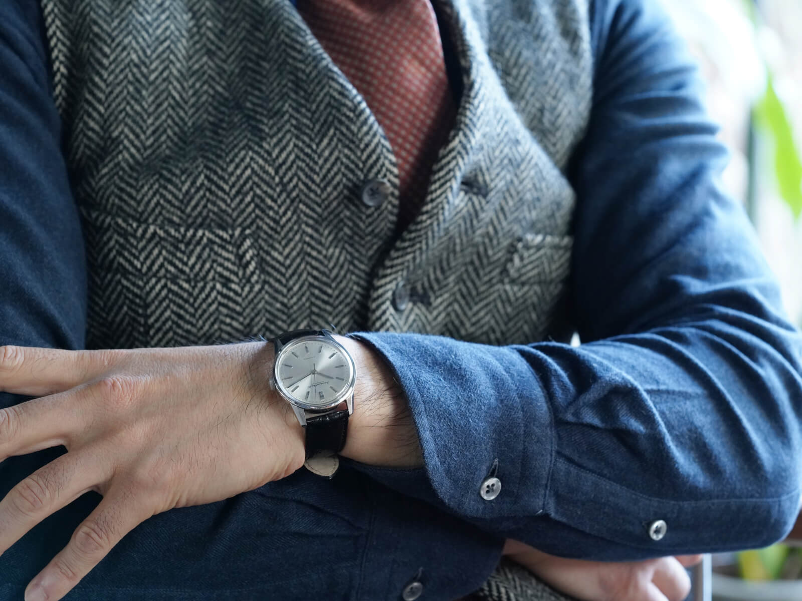 レザーブレスには、当店オリジナルのクロコダイルレザーのブラックをセレクト。さりげない気品を纏い、大人の雰囲気を格上げしてくれる綺麗な時計です。是非店頭にてご覧ください。