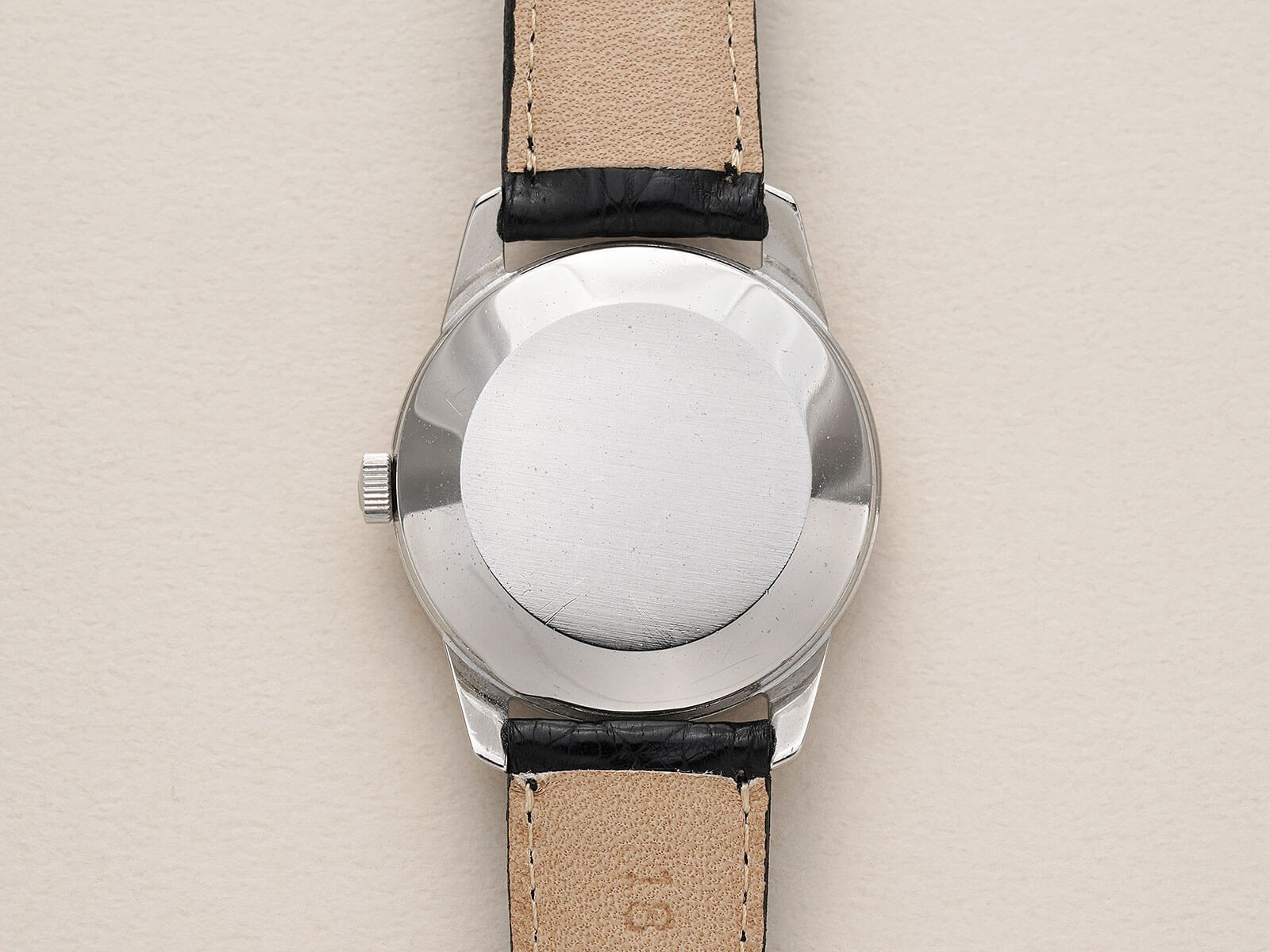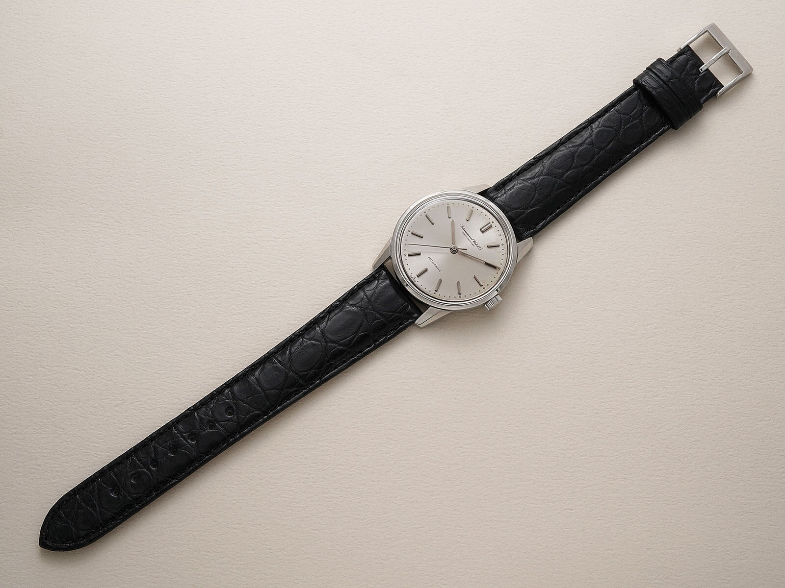 今回は、均整のとれた美しいデザインのステンレス製ラウンドケースモデルRef.R810Aのご紹介です。サンバースト加工が施された綺麗なシルバーダイヤルに、バレットインデックスや筆記体のブランド表記が、格別な美しさを演出したモデルです。オールドインター特有である、ミニッツマーカーに金属のボールを埋め込んだ"パール・ドロップ"手法も健在し、"腕時計らしく"シンプルであることの魅力を感じさせる素晴らしいモデルです。