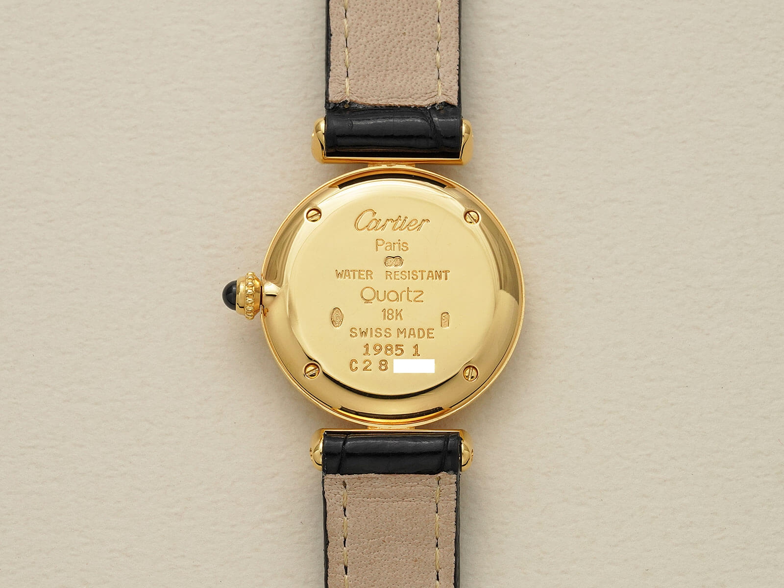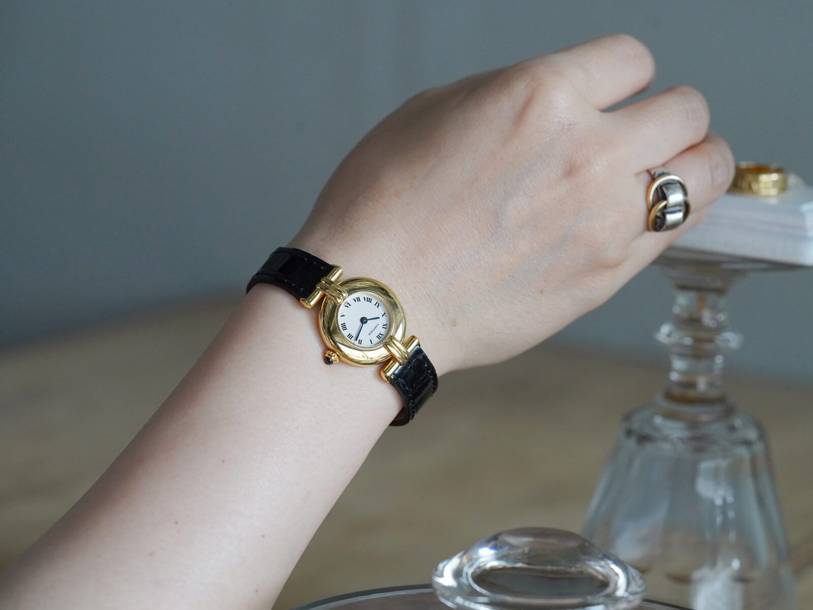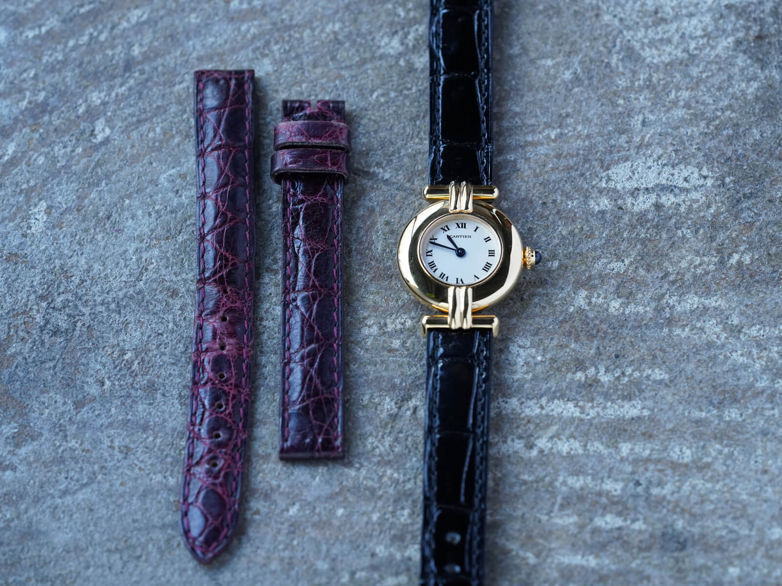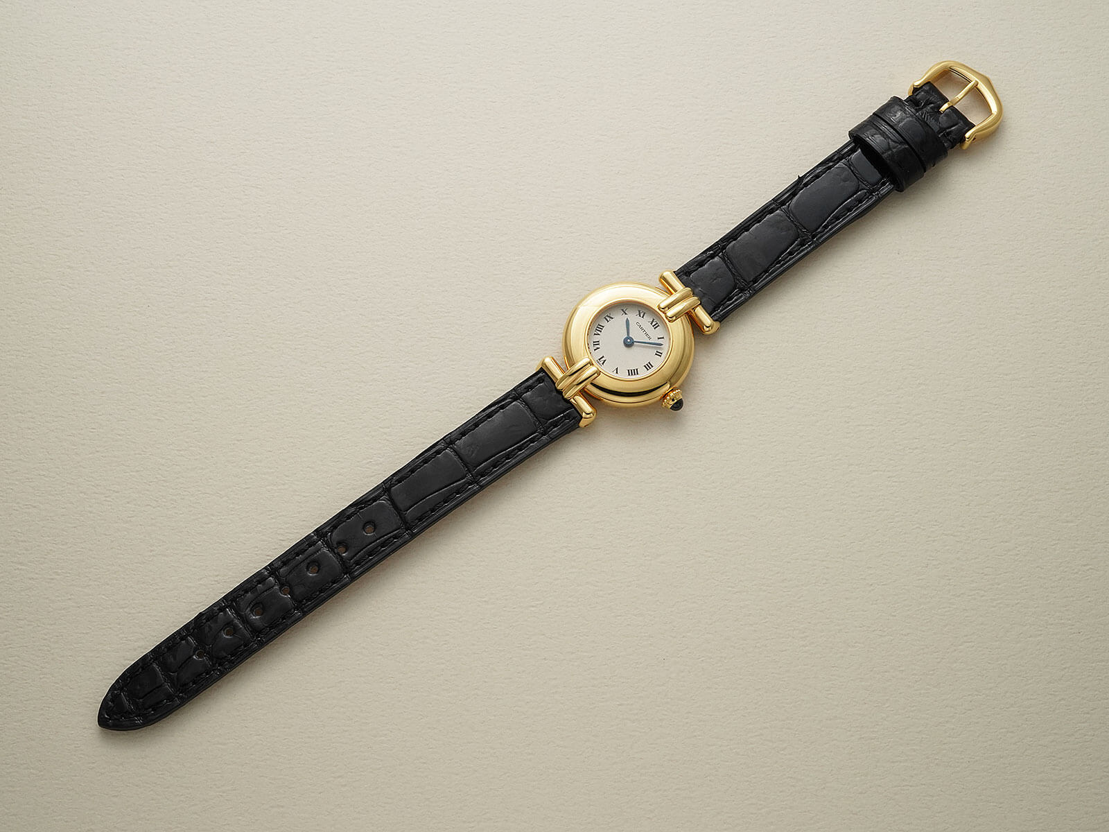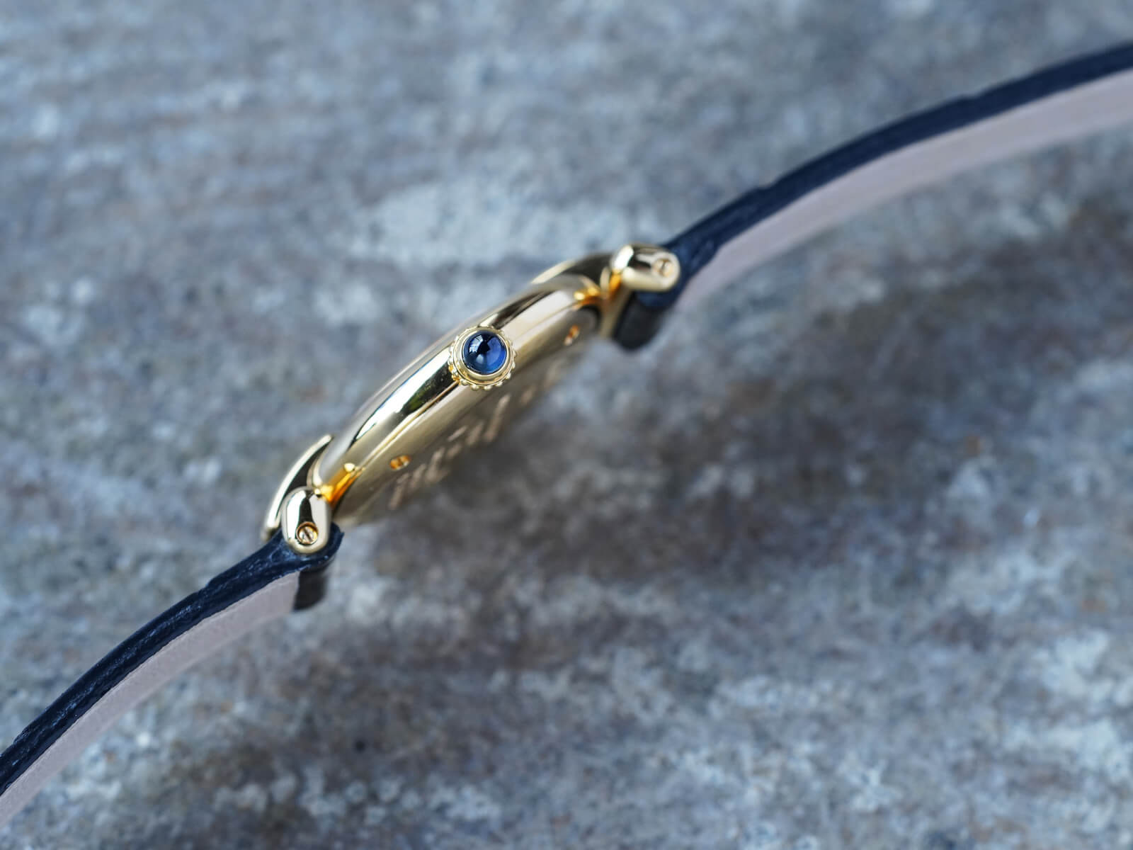 レザーブレスには、当店オリジナルのクロコダイルレザーブレスのブラックをセッティング。貴重なイエローゴールド製の純正尾錠も付属しておりますので、共にお使い頂くことをお奨め致します。直線的デザインの多いカルティエの中では珍しく、独特な曲線を持った綺麗な時計をぜひ店頭にてご覧ください。