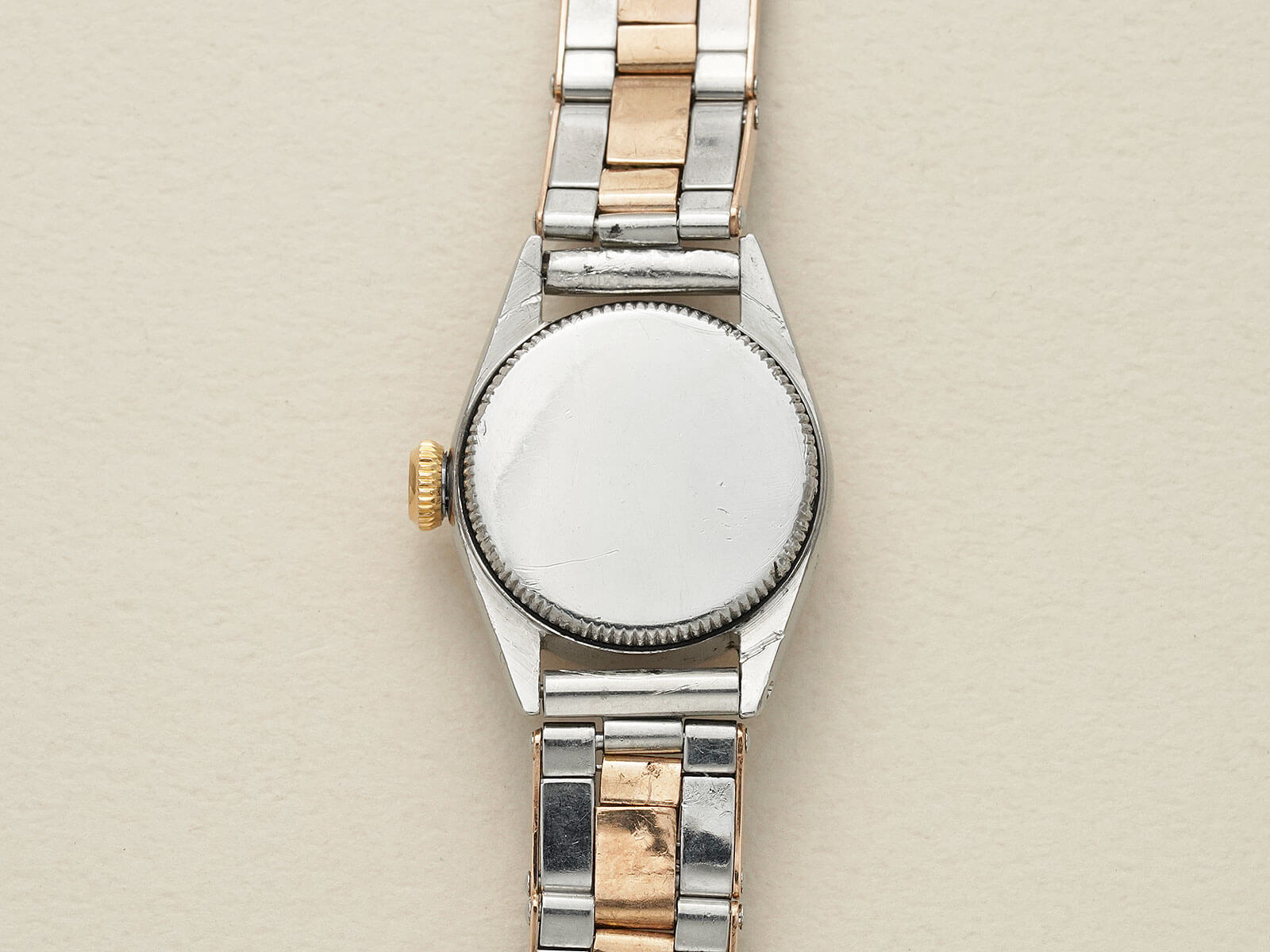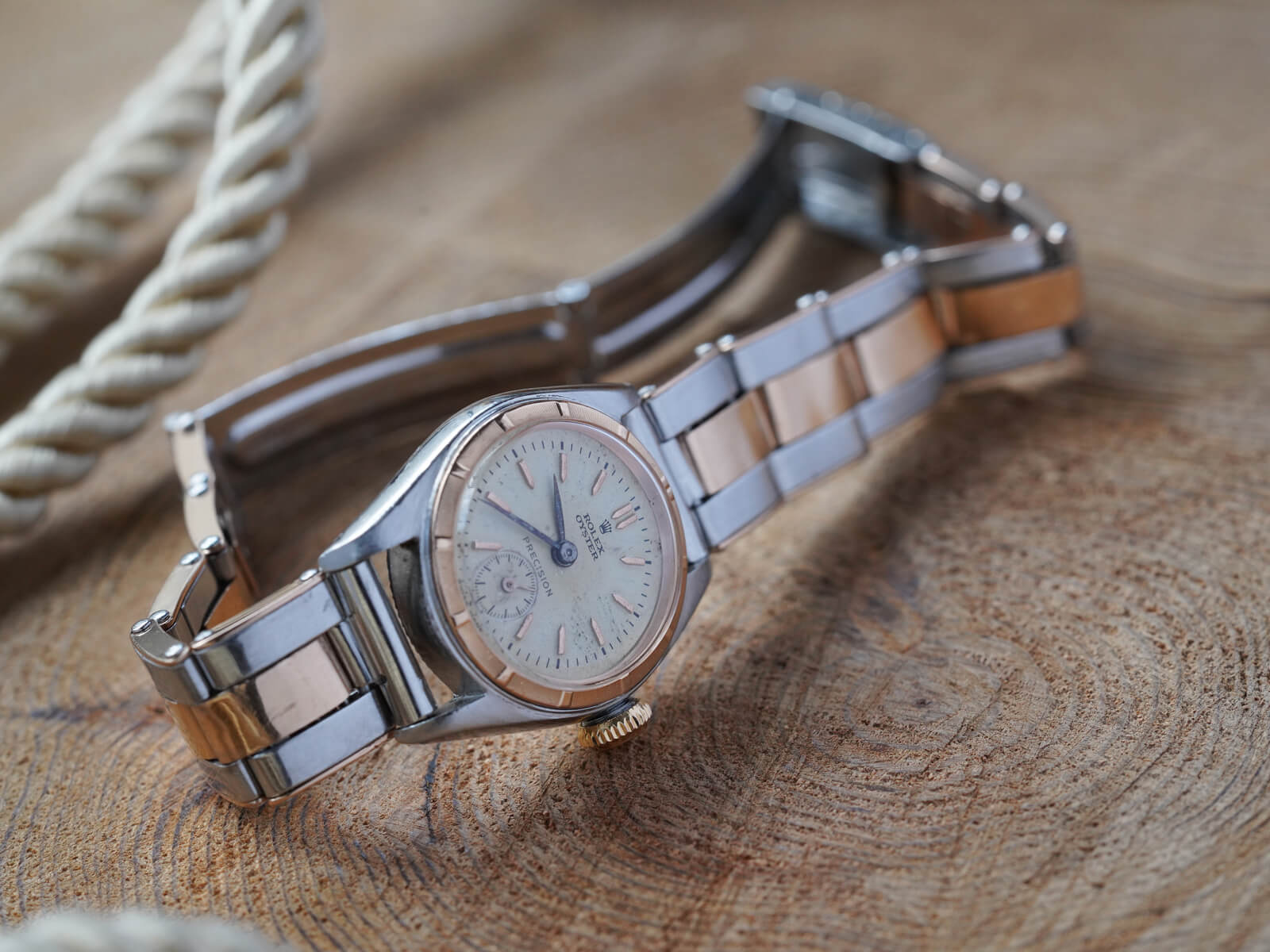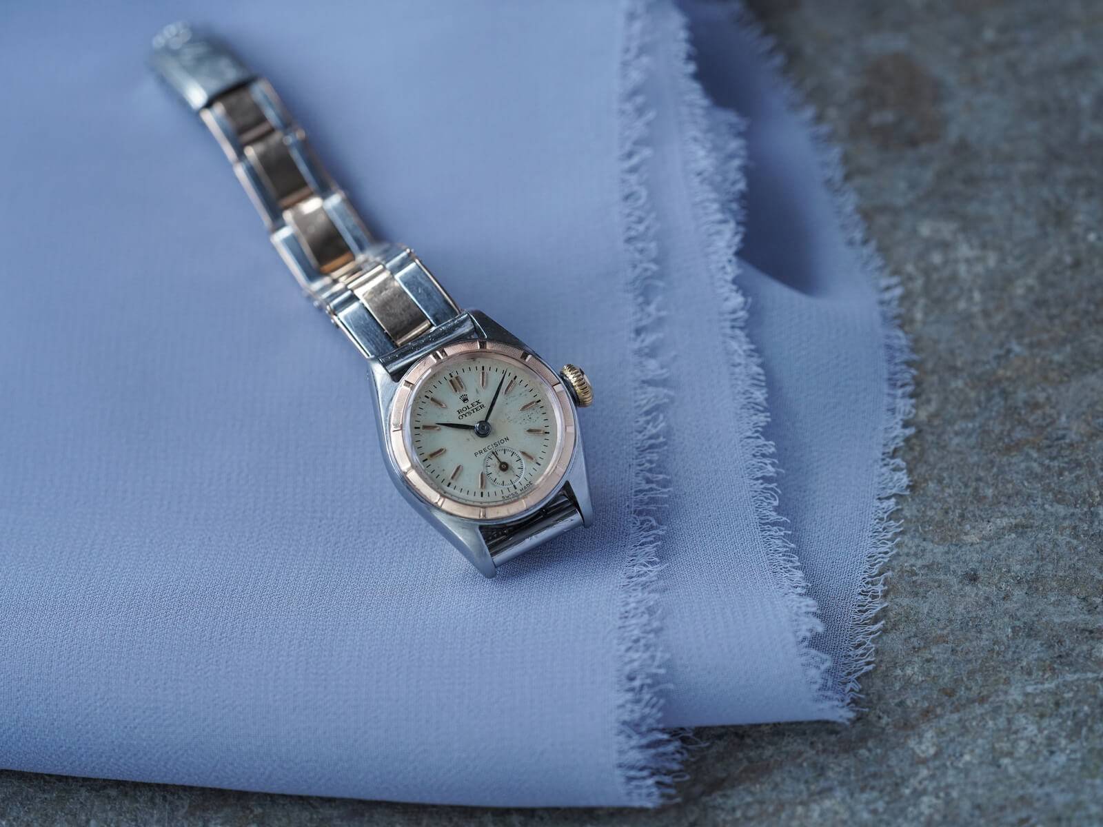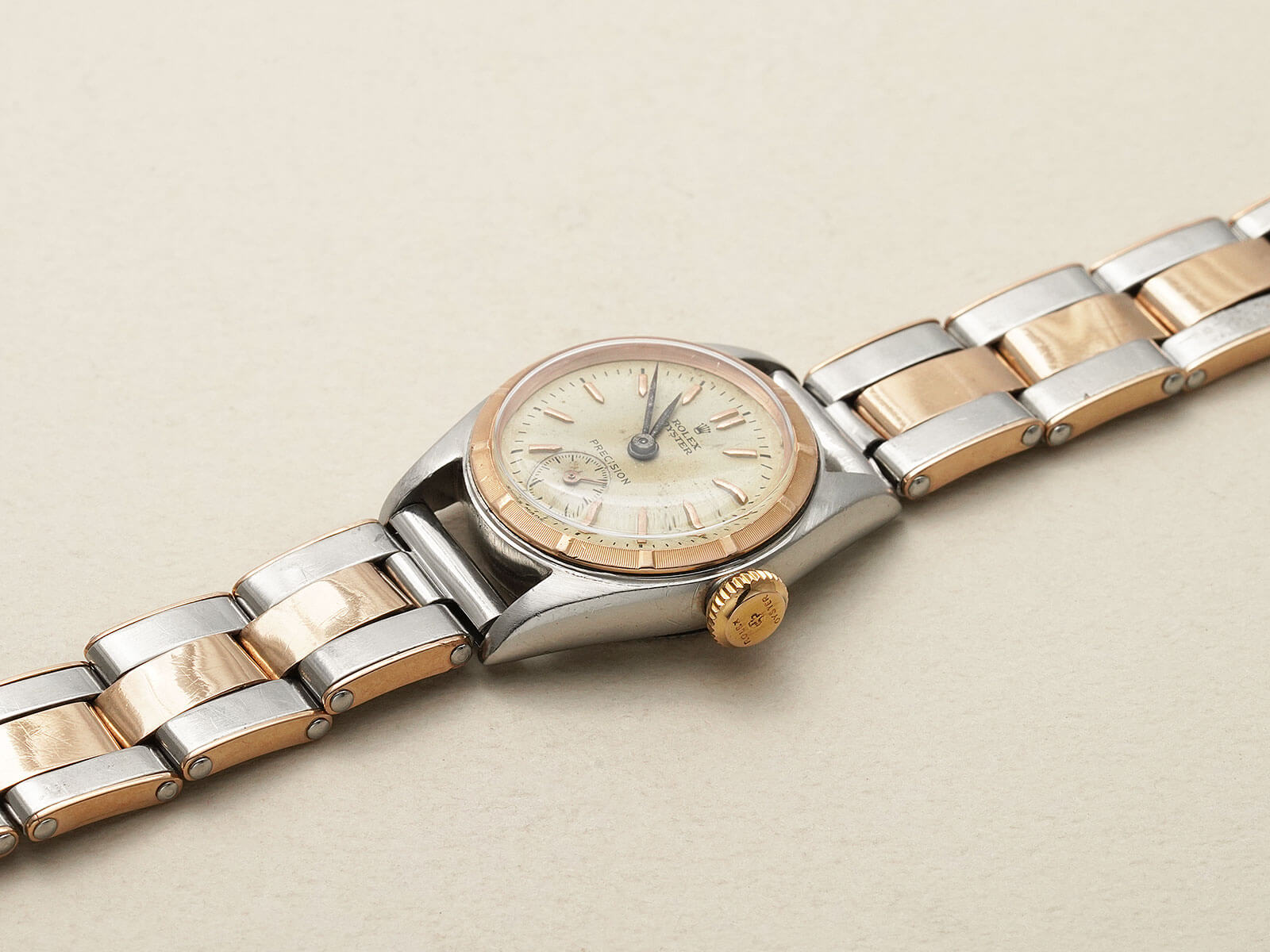 ブレスレットは、王冠マークの飛び出した様な通称"デベソバックル"と、大変貴重な伸縮性のある、エクステンションリベッドコンビブレスをセッティング。既に展開はされていましたが、1950年代まではオイスターケースの大きさや厚みは、当時の女性に受け入れられていなかったようで、個体数が少なく、とても貴重な存在です。ヴィンテージ特有の際立つ存在感で、時代を超える美しさを感じさせてくれる魅力的な時計です。是非店頭にてご覧ください。