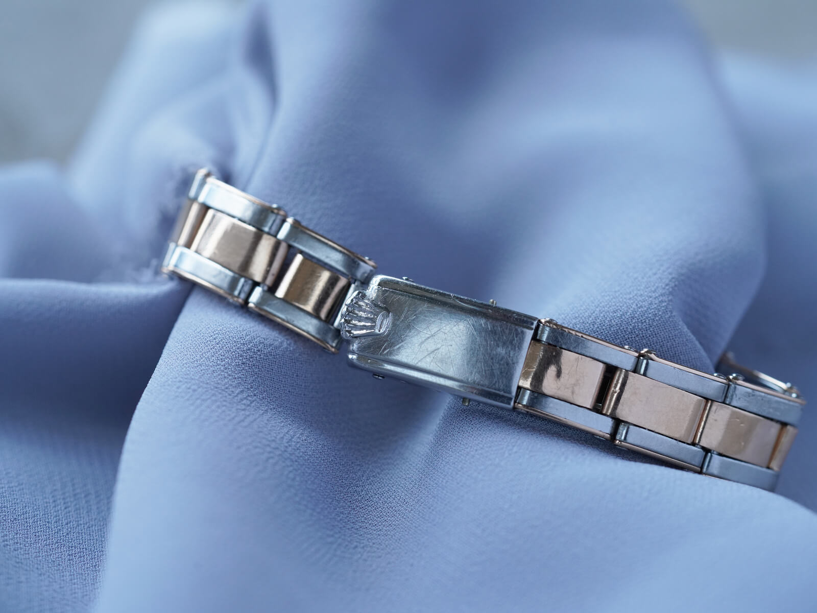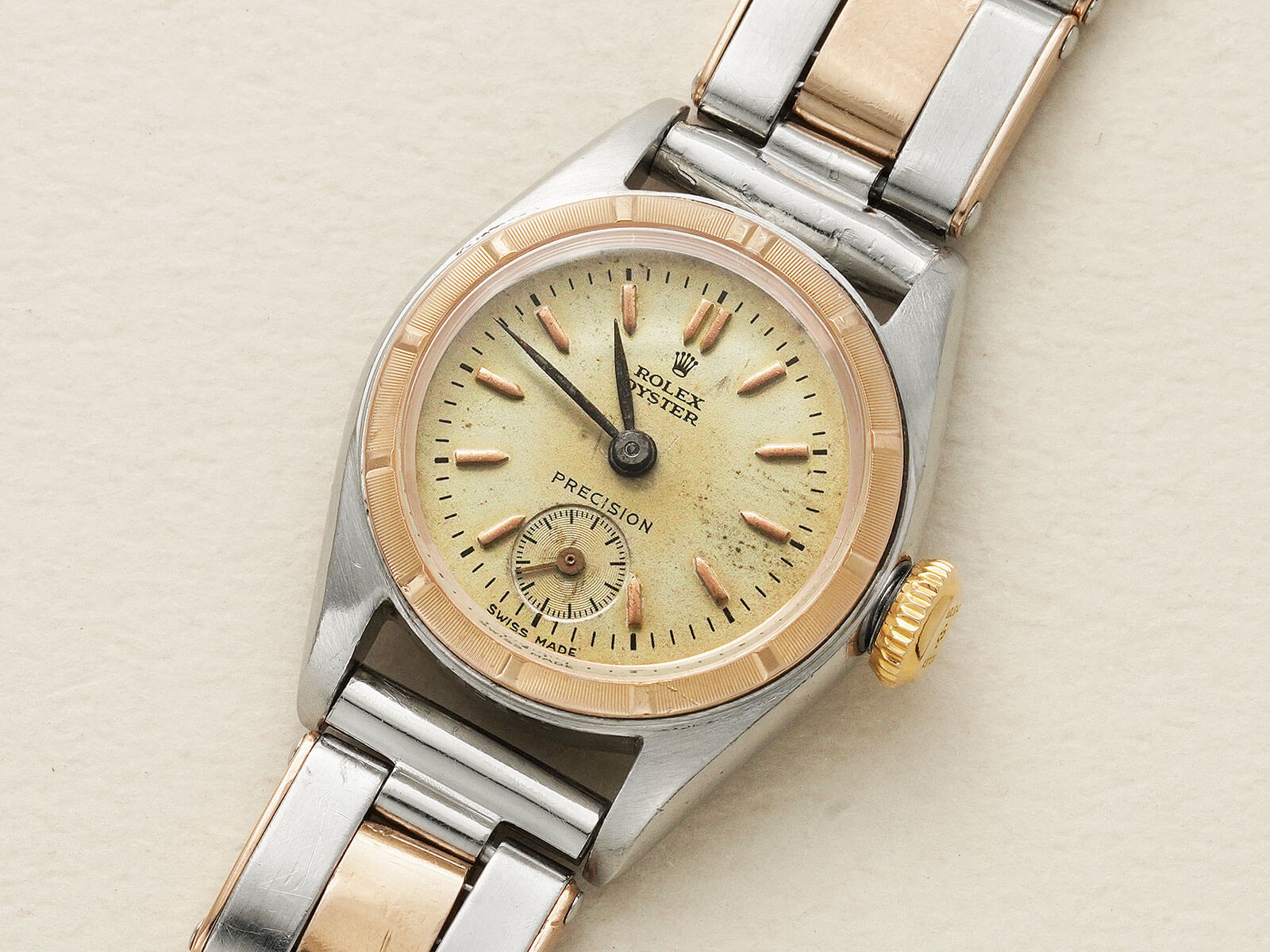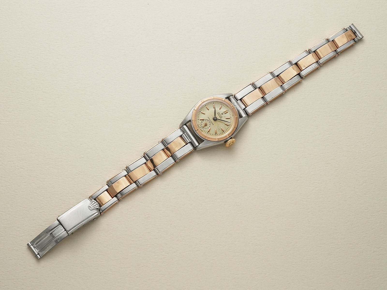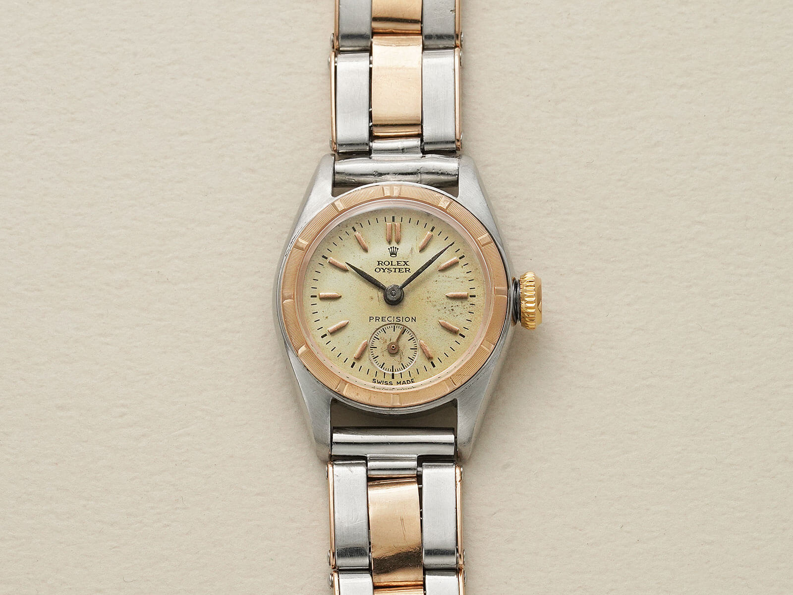 ブレスレットは、王冠マークの飛び出した様な通称"デベソバックル"と、大変貴重な伸縮性のある、エクステンションリベッドコンビブレスをセッティング。既に展開はされていましたが、1950年代まではオイスターケースの大きさや厚みは、当時の女性に受け入れられていなかったようで、個体数が少なく、とても貴重な存在です。ヴィンテージ特有の際立つ存在感で、時代を超える美しさを感じさせてくれる魅力的な時計です。是非店頭にてご覧ください。