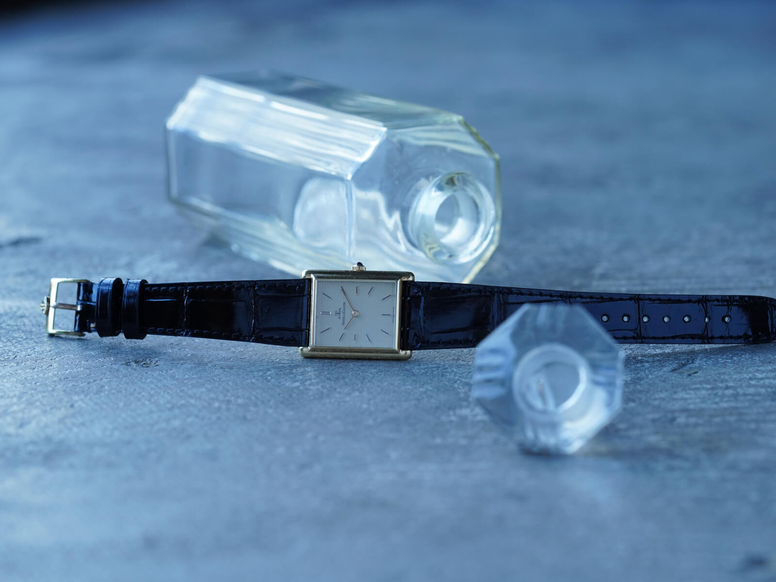 レザーブレスには、当店オリジナルのクロコダイルレザーのシャイニーブラックをセッティング。貴重な純正尾錠も付属しておりますので、併せてご使用いただくことをお勧めいたします。大人らしく、腕元をエレガントに引き立ててくれる素敵な時計です。是非、店頭にてご覧ください。
