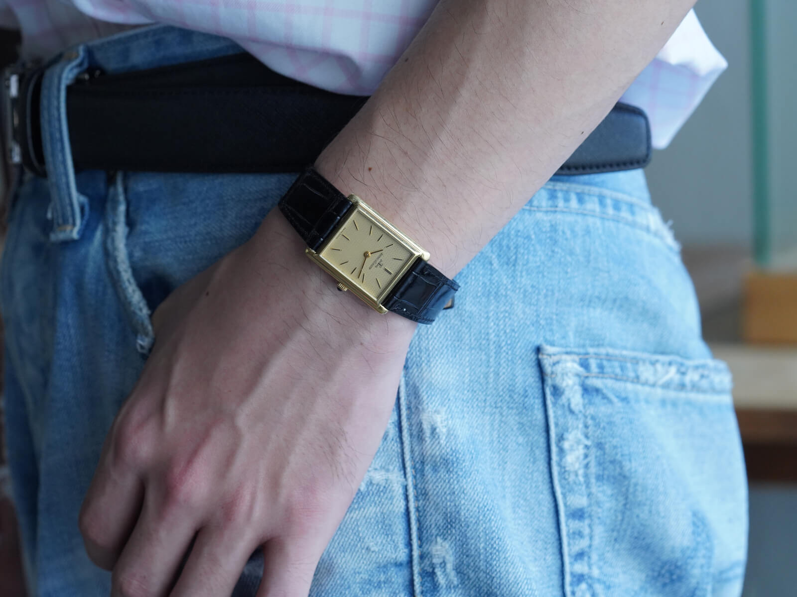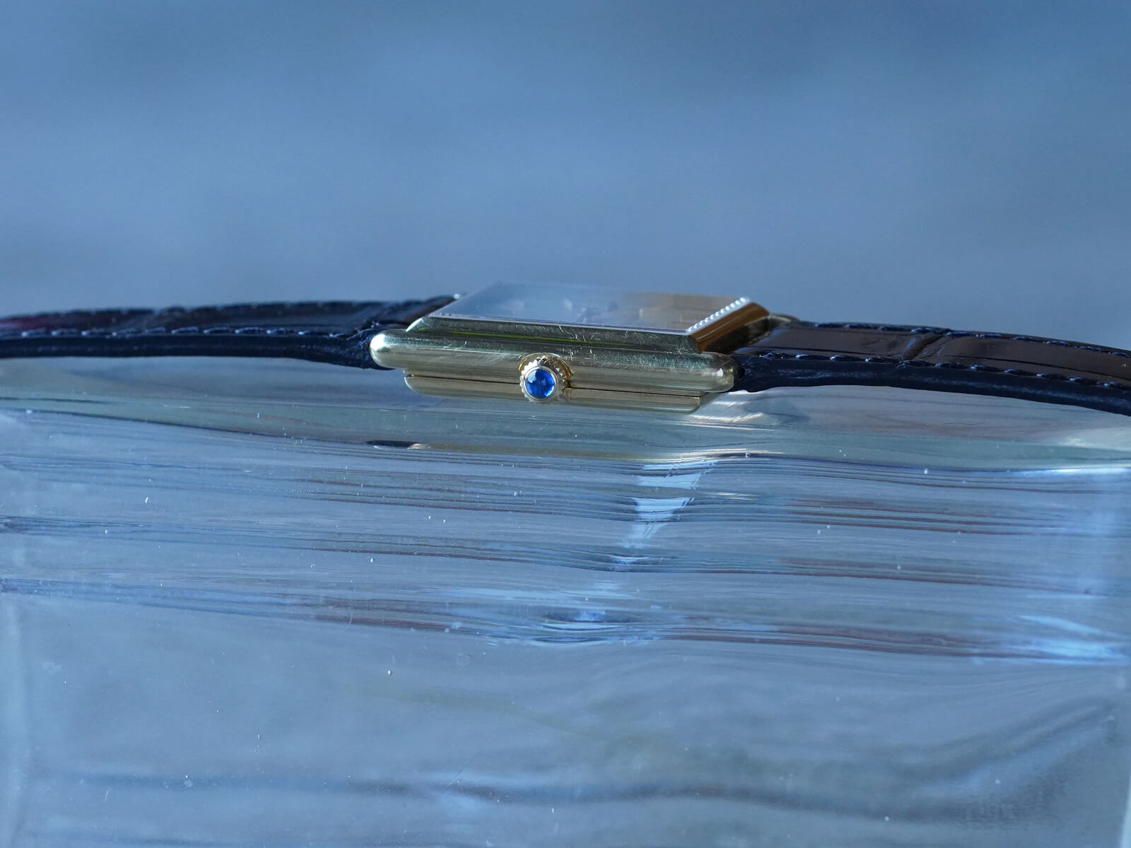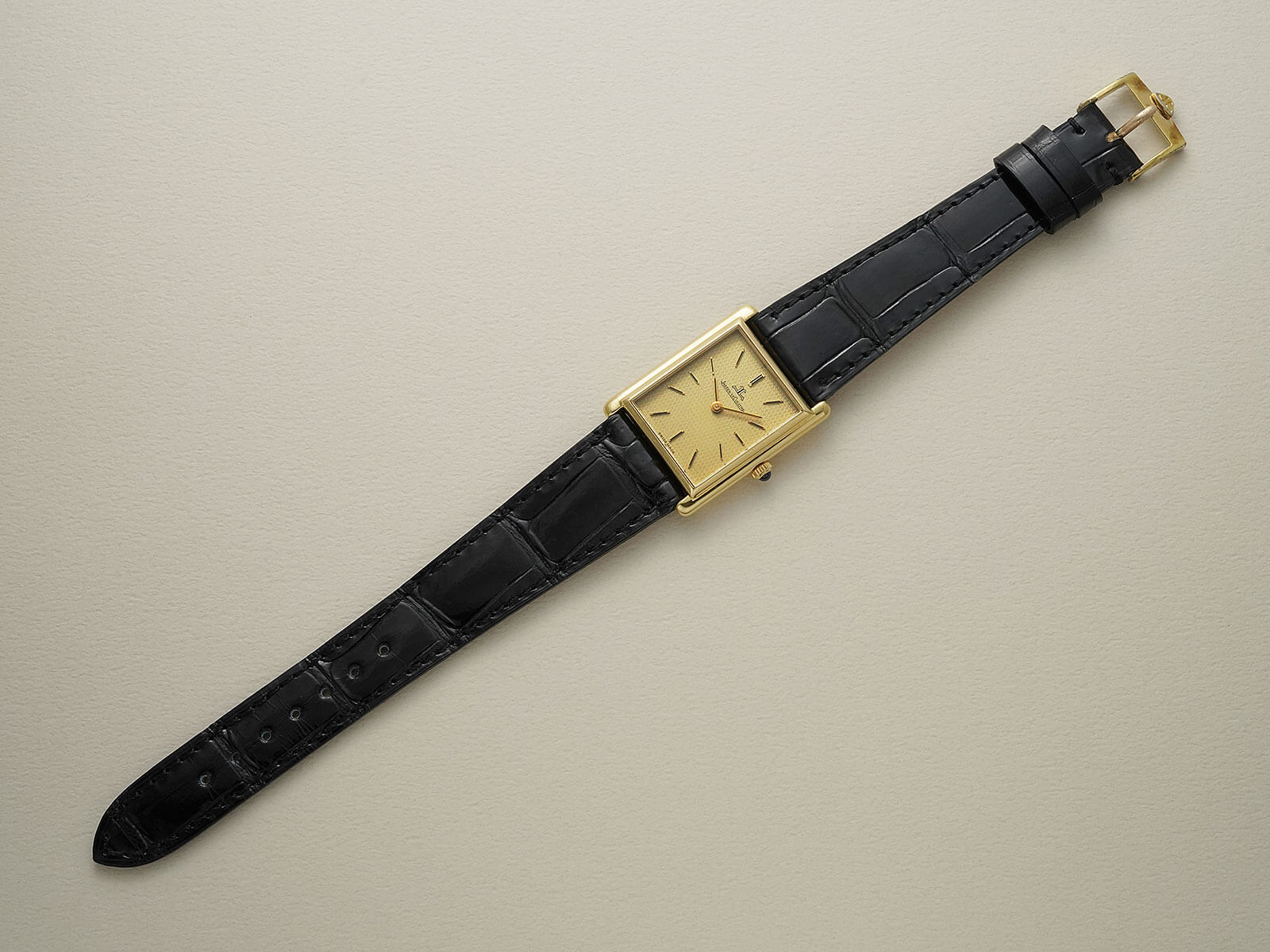 今回は、装いに気品を与えてくれるモデル、Ref.6029.21のご紹介です。風格ある輝きを放つイエローゴールド製のレクタンギュラーケースに、ドレスウォッチらしく繊細なペンシルハンドとバーインデックスで、時代を超える美観を備えたデザイン。さり気なく個性を演出できるタペストリー模様のゴールドダイヤルや、サファイアカボションリューズが良いアクセントになっており、大人の日常を彩ってくれる一本です。