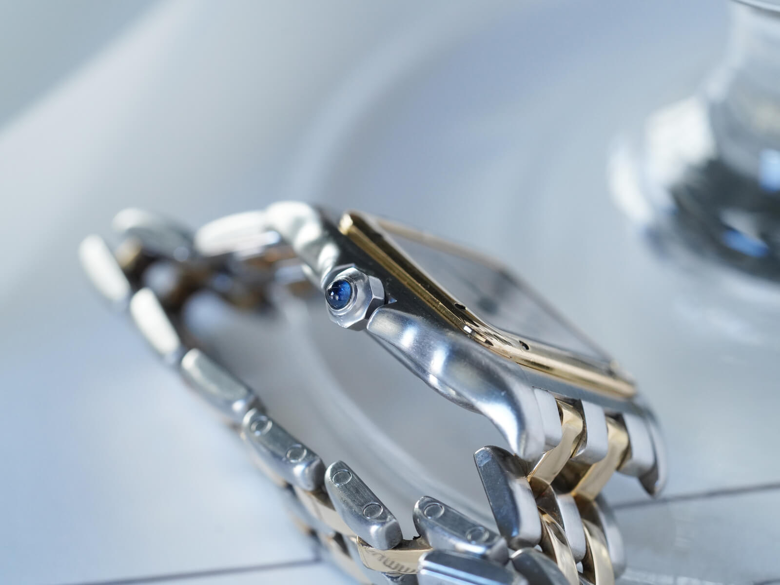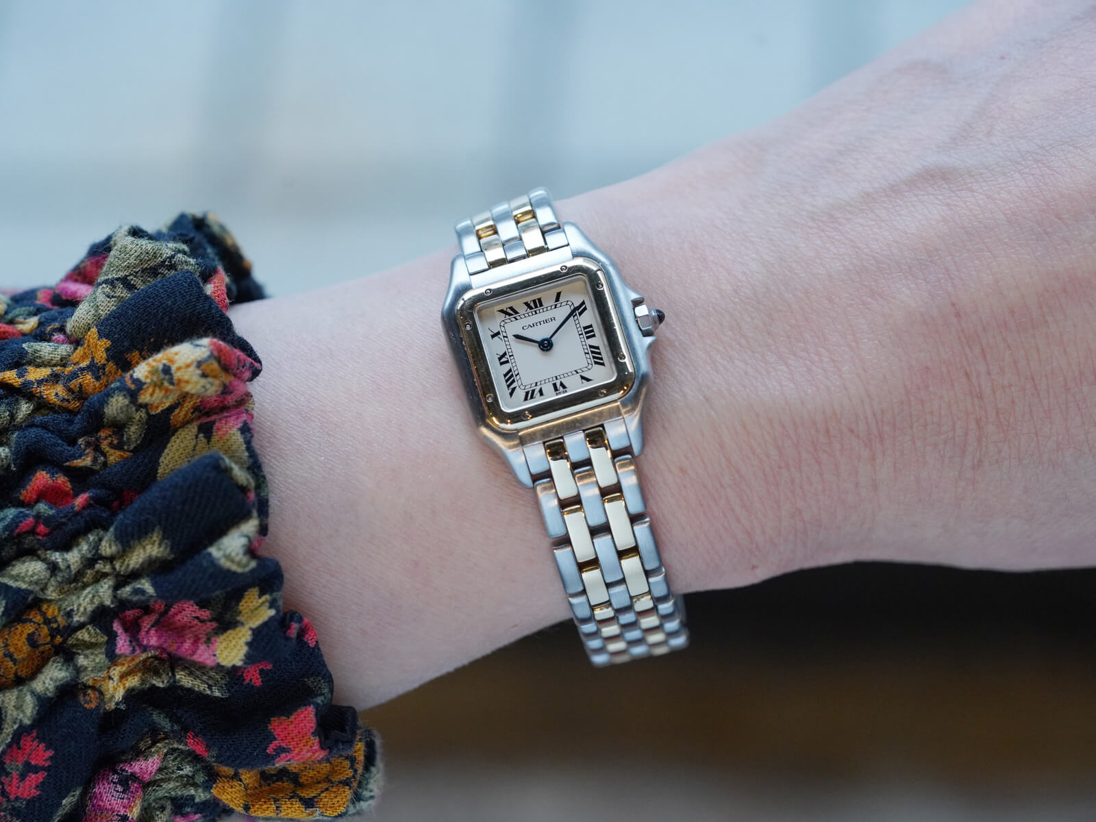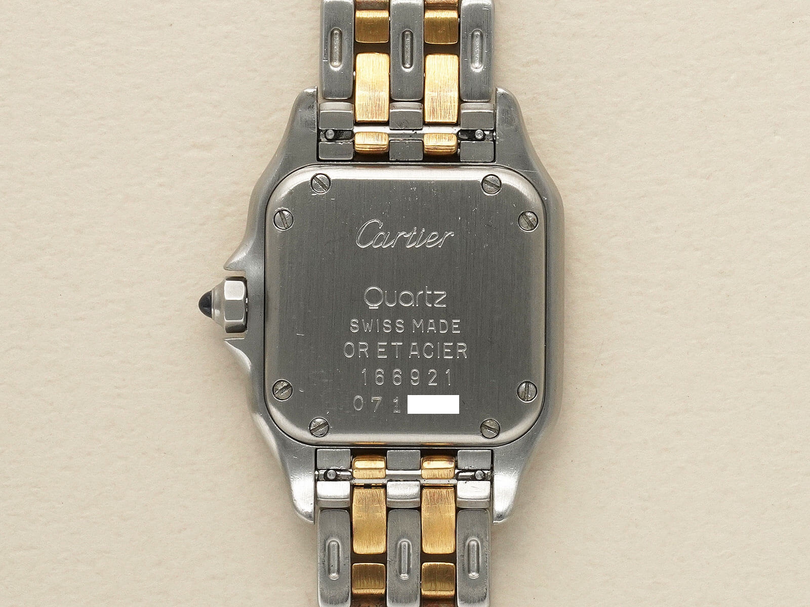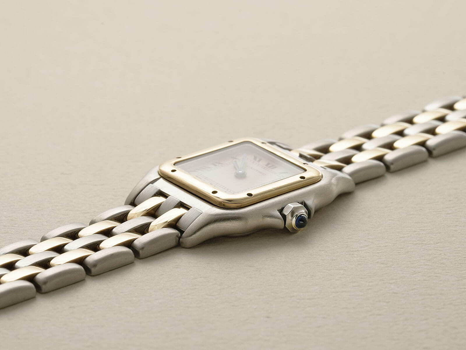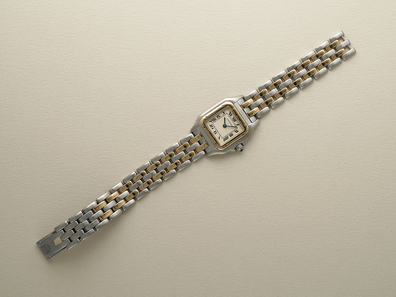 ブレスレットには、豹の足跡から着想を得たとされる[ Maillon Panthere Bracelet / マイヨンパンテール ]をセッティング。イエローゴールドとステンレススチールのコンビカラーが美しく、ヘアラインとポリッシュの異なる仕上げを使い分けた、ヴィンテージならではのディテールです。洗練された美しさを感じさせてくれる、カルティエのアイコニックな存在の一本を、是非お手に取ってご覧ください。