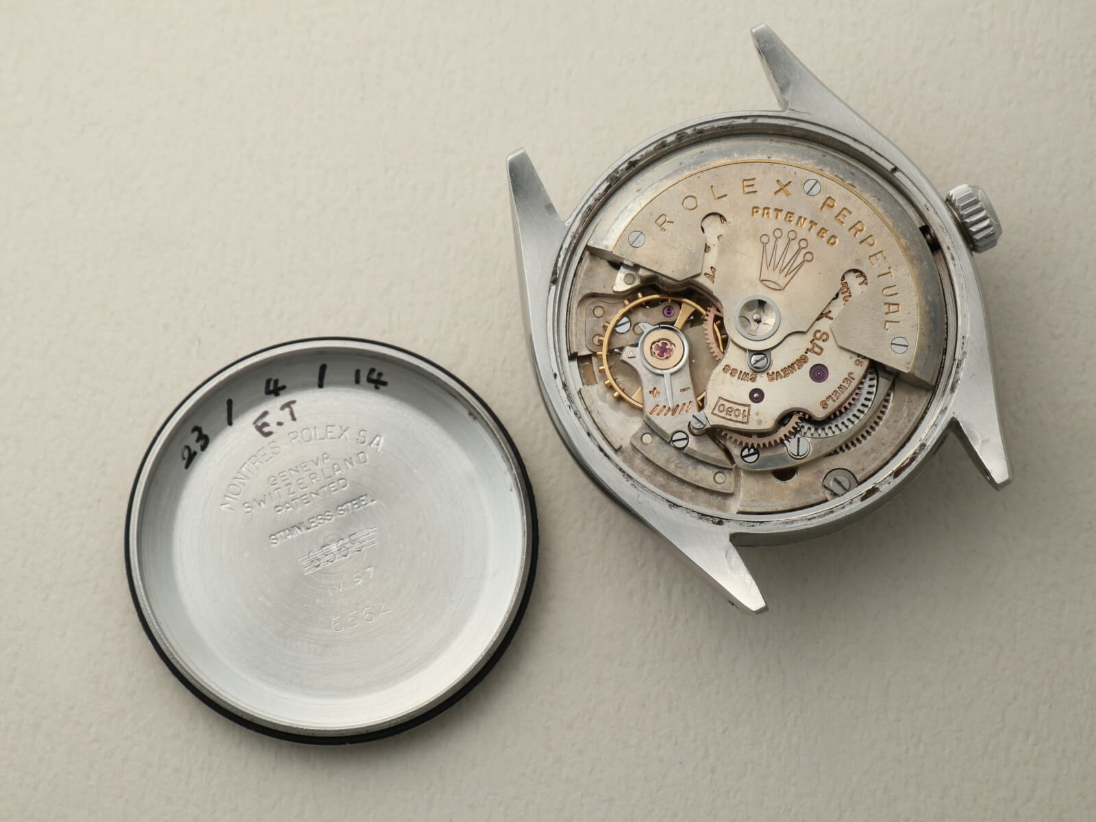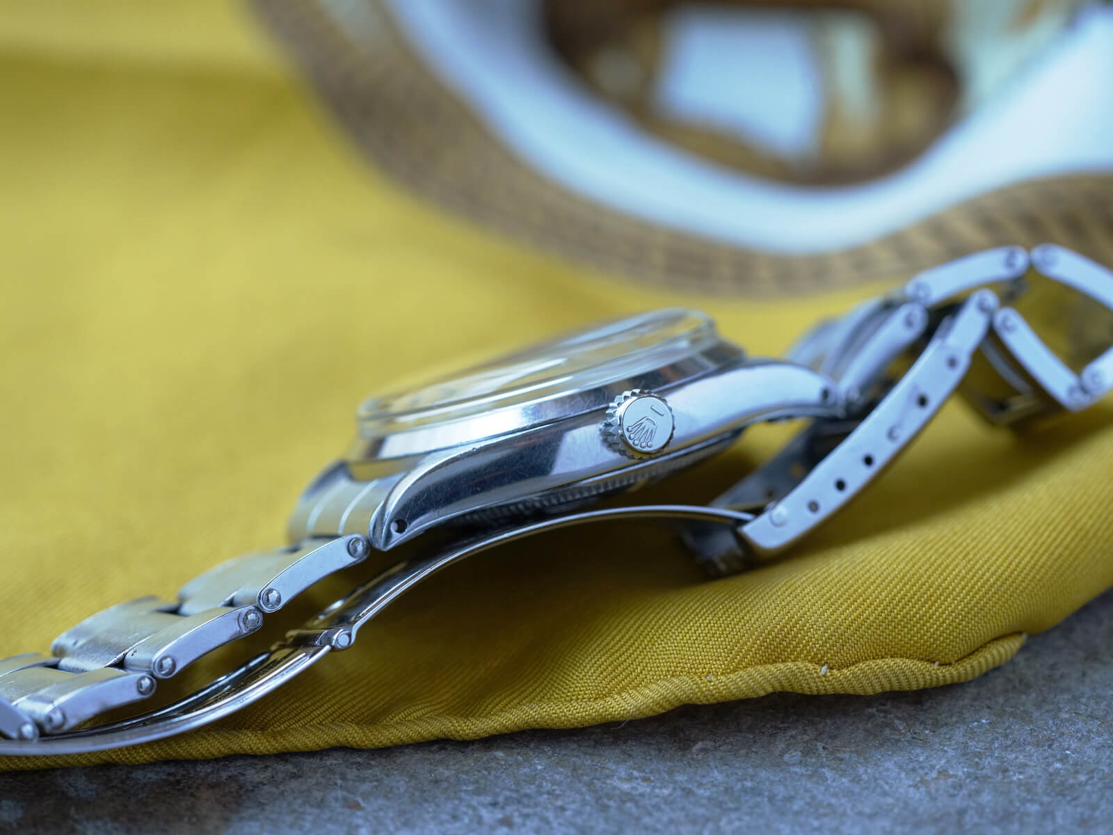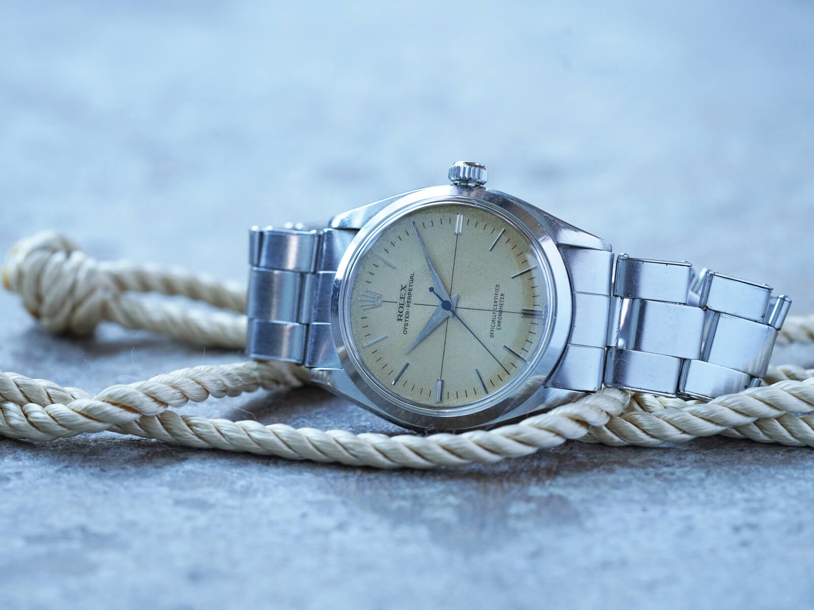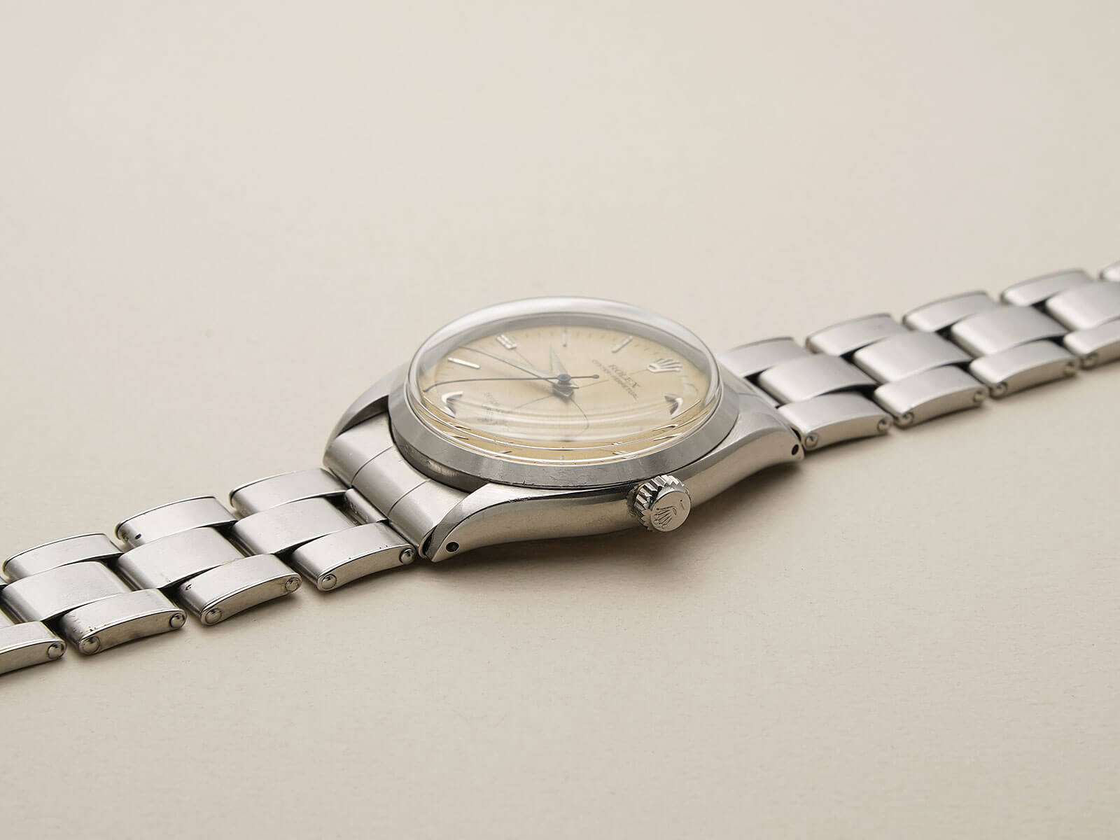 ムーブメントは、[クロノメーター/Chronometer]規格を通過したキャリバー1030を搭載。通称OCCと呼ばれる50年代特融のクロノメーター表記も魅力の一つです。世界初の両方向巻き上げ式として開発され、50年代の象徴である[Unicorn Rotor / ユニコーンローター]がセッティングされた、ロレックス黄金期を支えた名機です。
