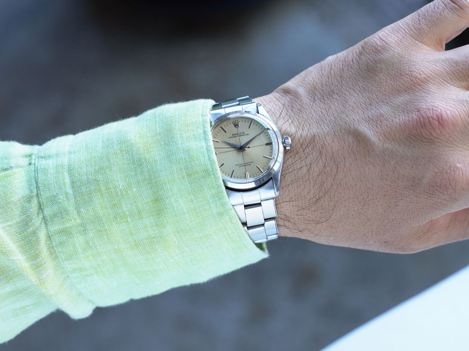 ブレスレットには、王冠マークが飛び出したようなデザインの[Big Crown Logo Clasp / デベソバックル]が付属した、純正のステンレス製オイスターリベットブレスをセッティング。歳月によって紡がれる、多様で個性的な美しさをご堪能いただける素敵な時計です。是非、店頭にてご覧ください。