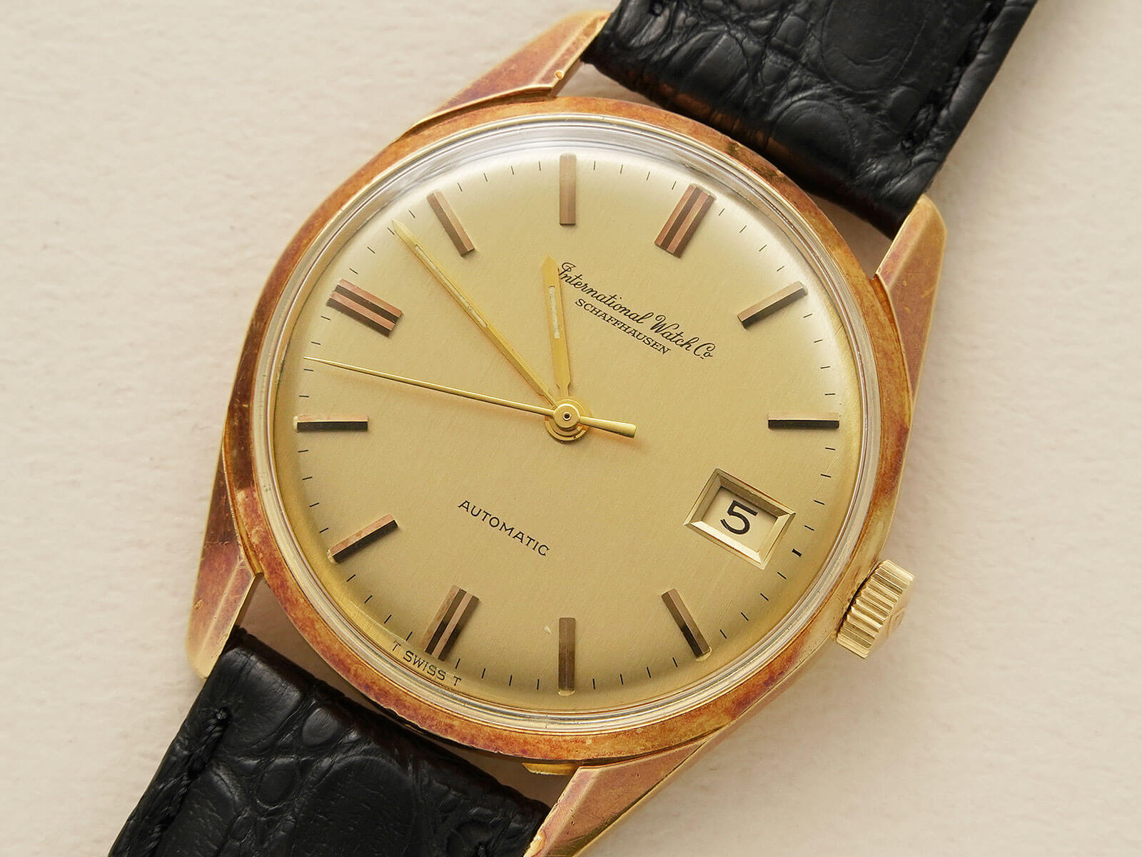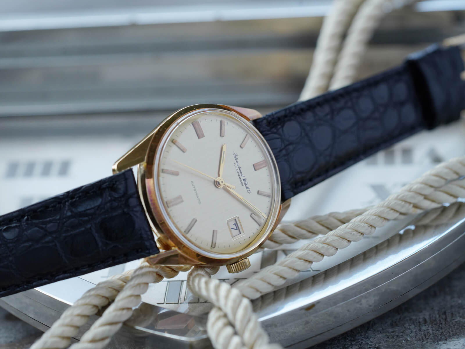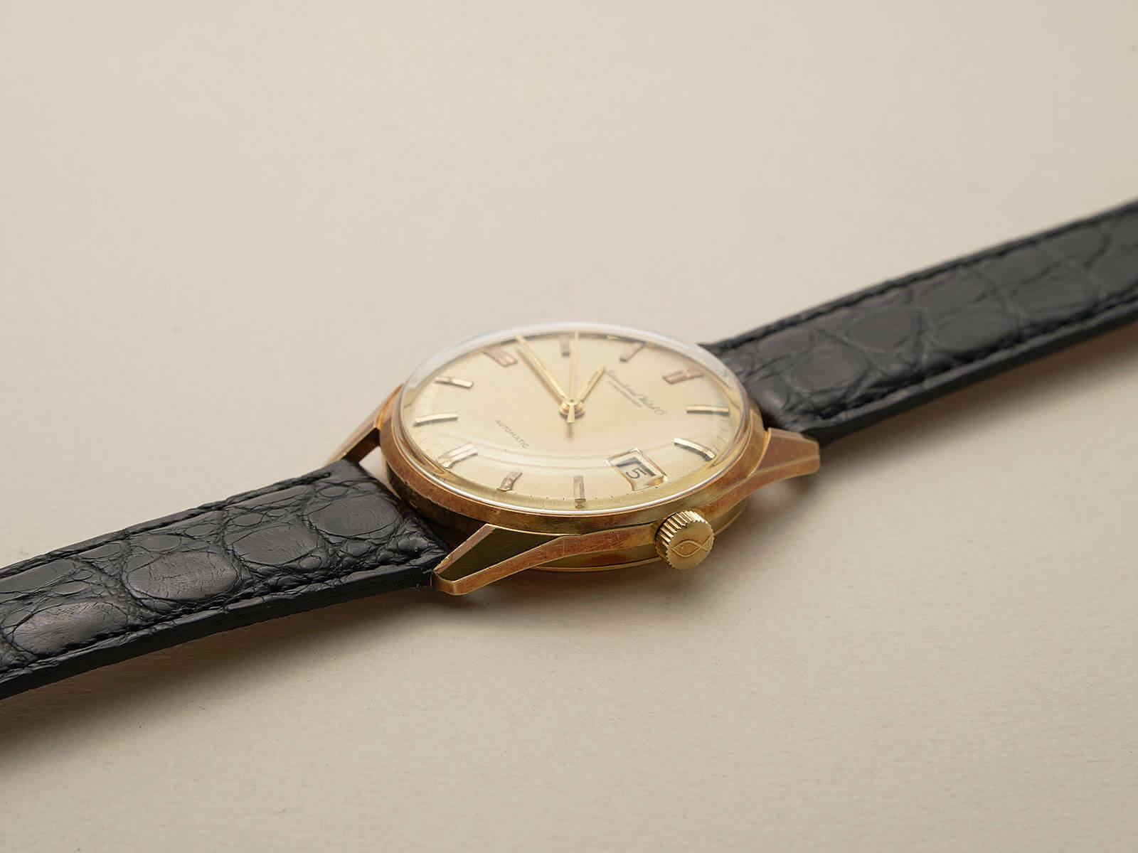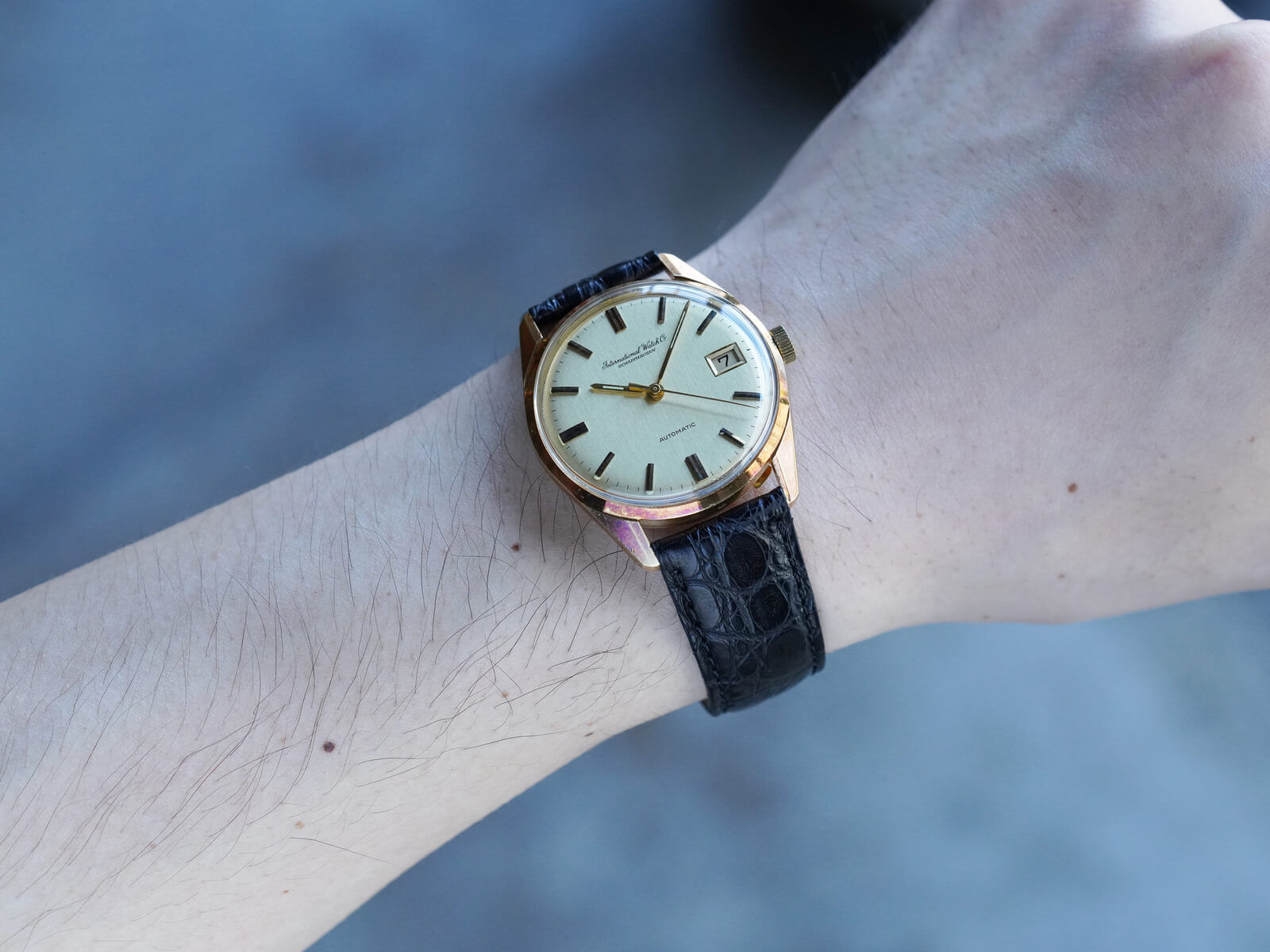 今回は、ミニマルなフェイスでありながら、スタイリッシュな雰囲気を感じさせてくれるモデルRef.R810Aのご紹介です。へアライン仕上げにより落ち着いた質感のゴールドダイヤルに、IWC特有のソードハンドとバーインデックスの組み合わせで、大人らしく洒脱な華やかさのあるデザイン。筆記体でのみ表記されたブランド名や魚リューズもしっかりと備えており、オールドインターならではの魅力をご堪能いただけます。