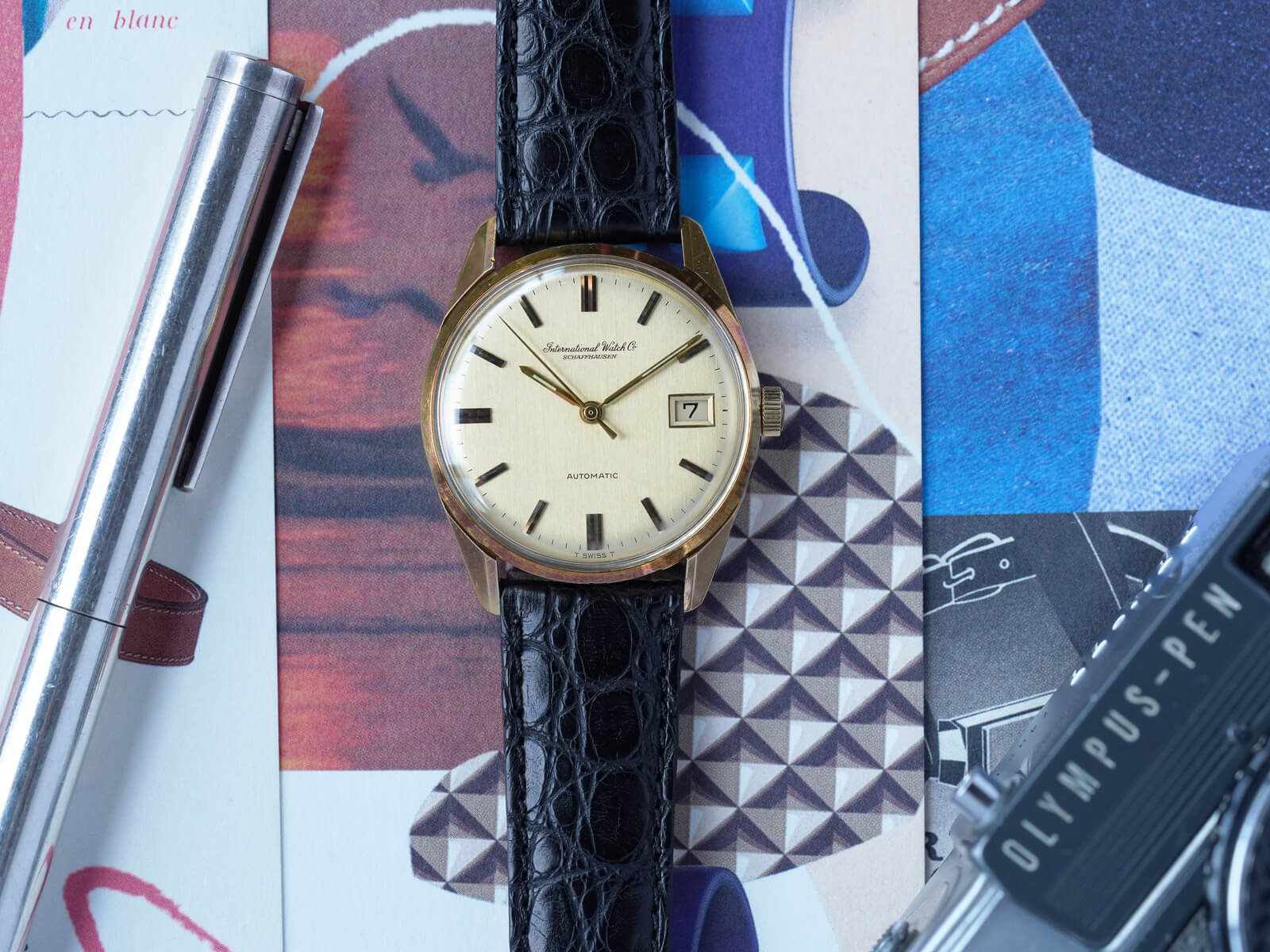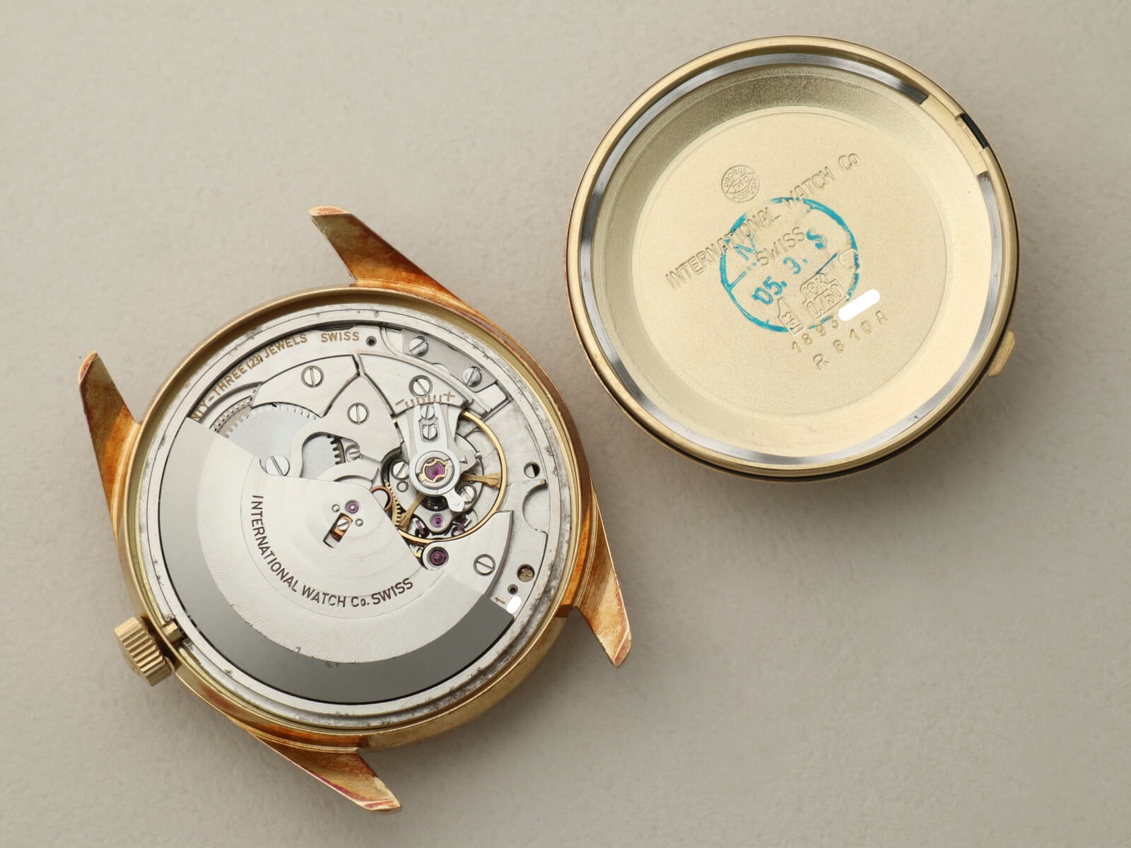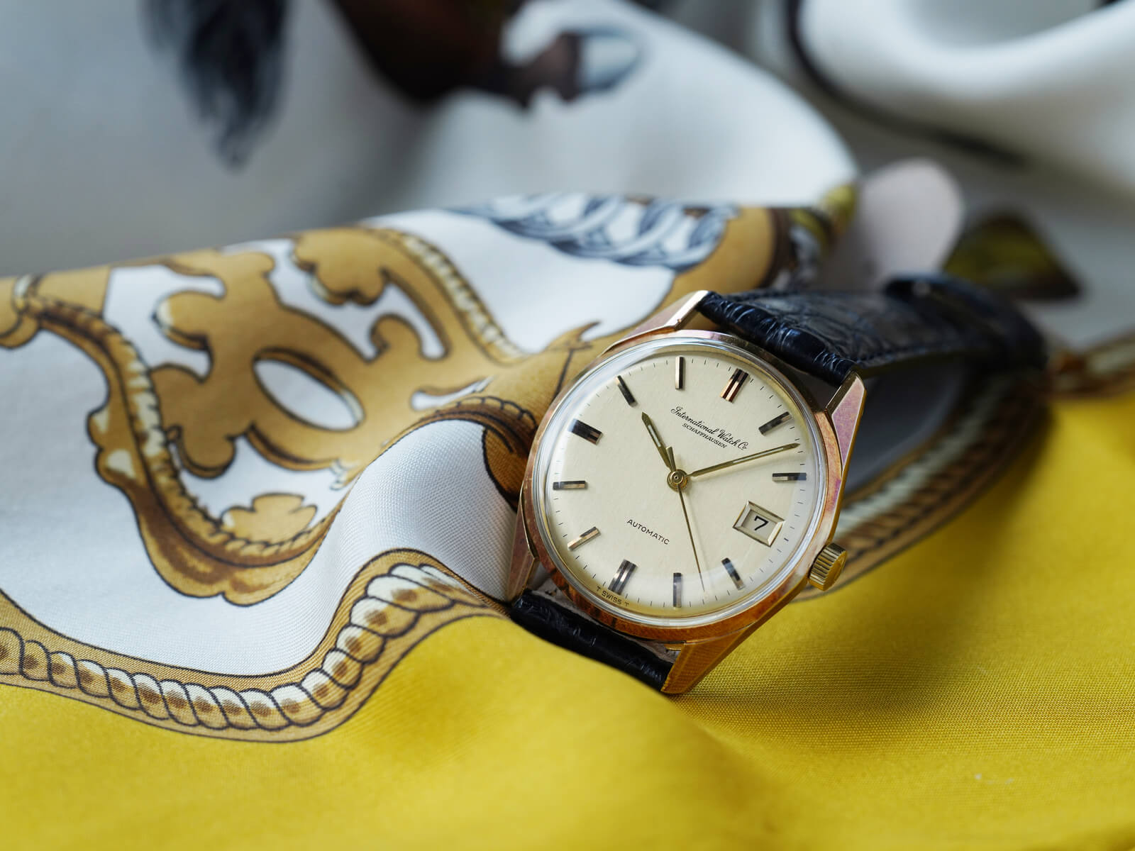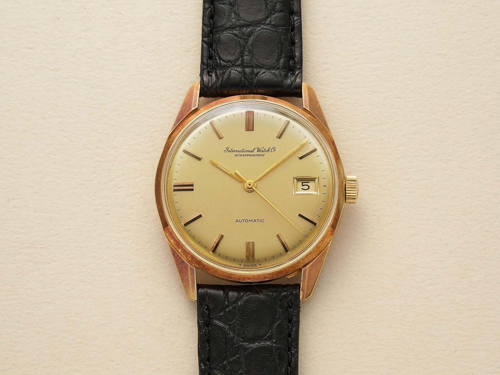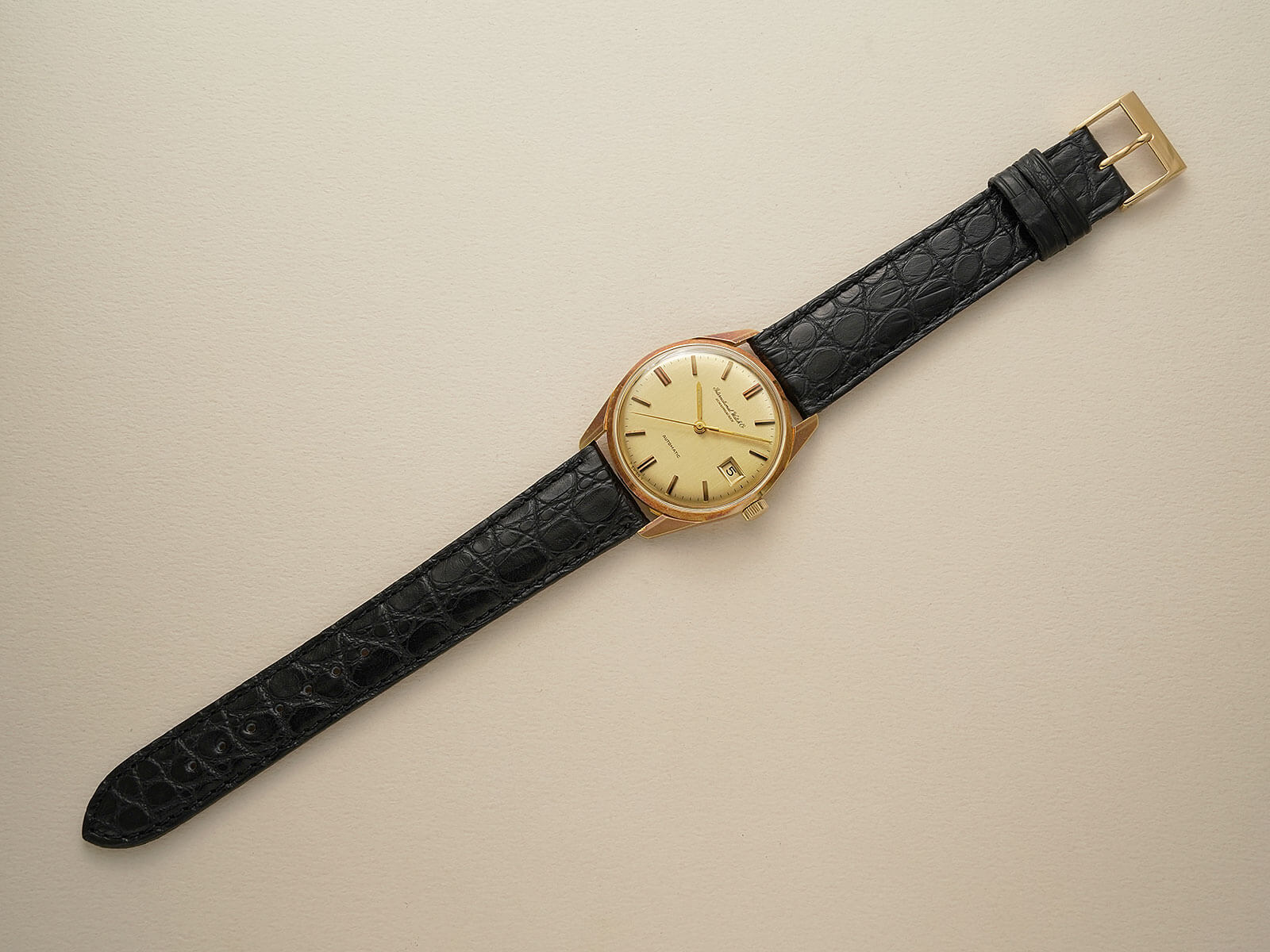 今回は、ミニマルなフェイスでありながら、スタイリッシュな雰囲気を感じさせてくれるモデルRef.R810Aのご紹介です。へアライン仕上げにより落ち着いた質感のゴールドダイヤルに、IWC特有のソードハンドとバーインデックスの組み合わせで、大人らしく洒脱な華やかさのあるデザイン。筆記体でのみ表記されたブランド名や魚リューズもしっかりと備えており、オールドインターならではの魅力をご堪能いただけます。