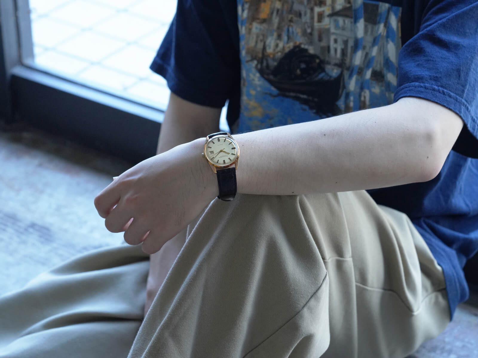 レザーブレスには、当店オリジナルのクロコダイルレザーのブラックをセッティング。フォーマルな装いには勿論の事、カジュアルスタイルも格上げしてくれる素敵な時計です。是非、店頭にてご覧ください。