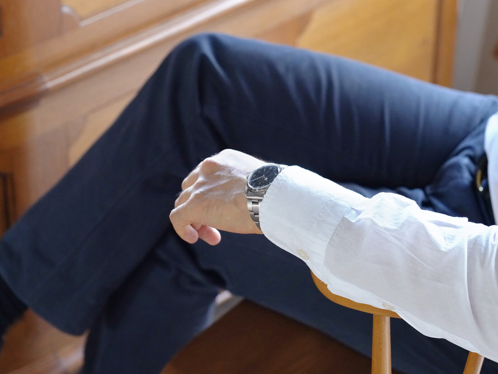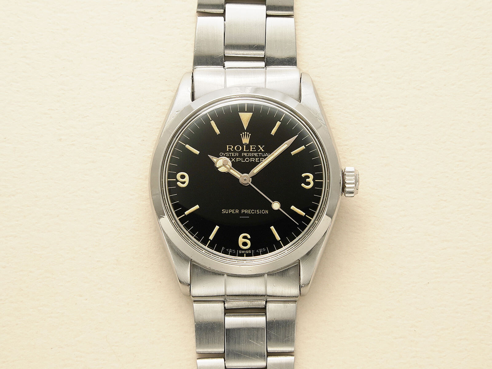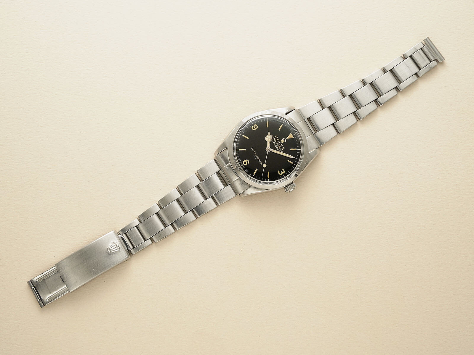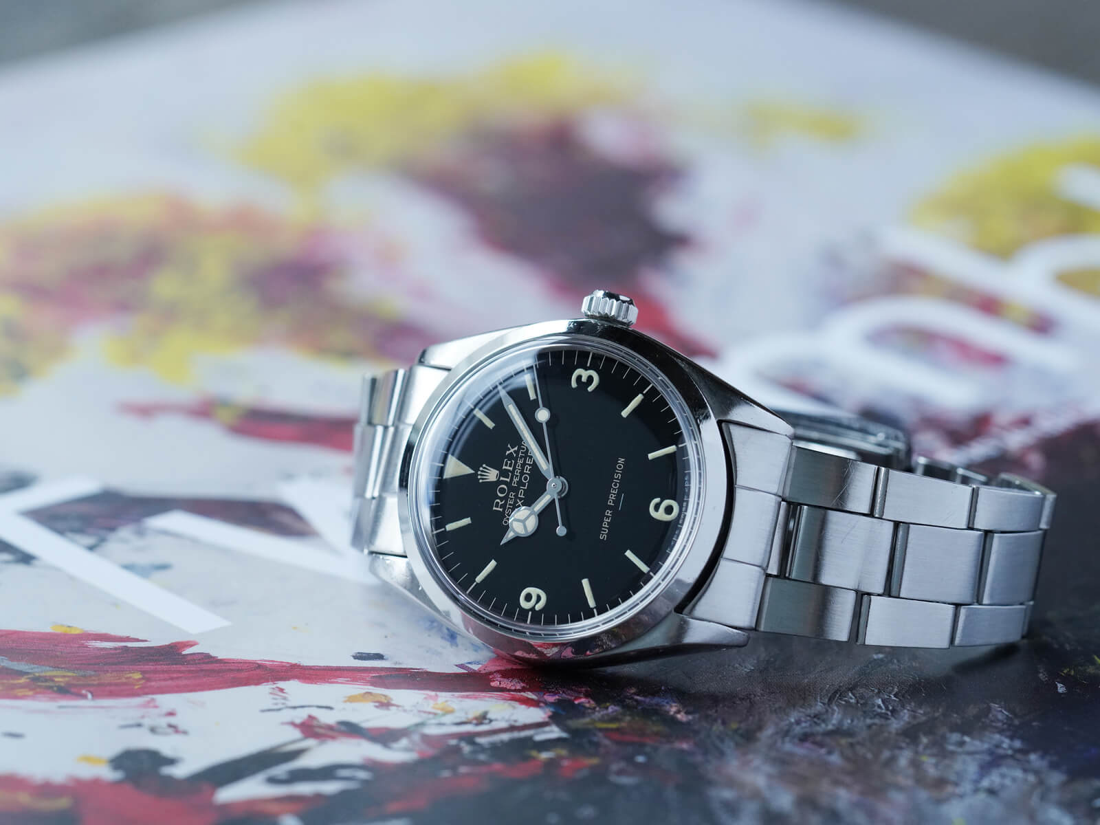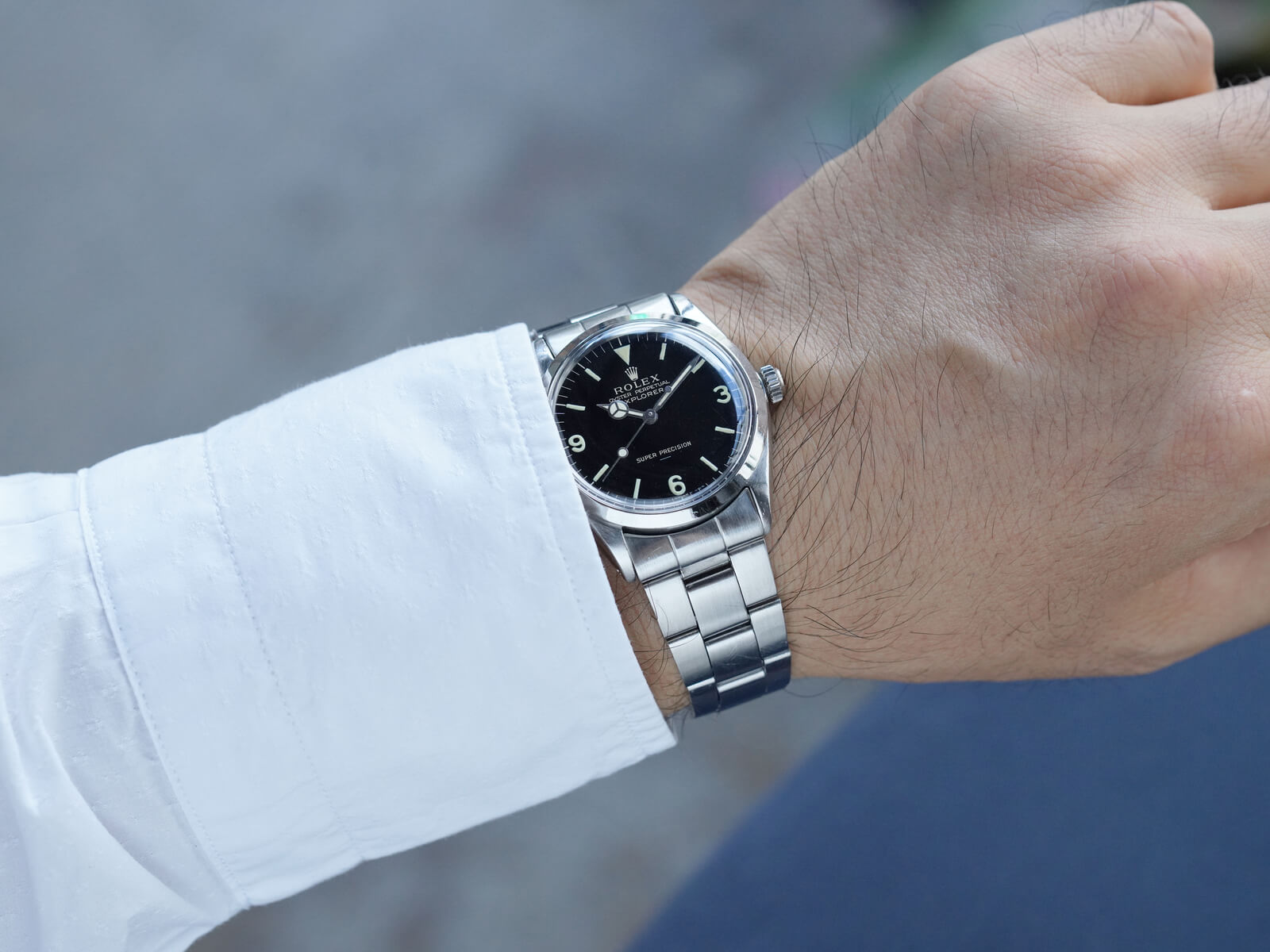 ロレックスの代表的名作[Explorer 1 / エクスプローラー1]。その中のノンクロノメーターで、ダイヤル6時位置に「正確、精密」の意味を持つプレシジョンの表記が印字された「エアキング/Air king」Ref5500をベースとした、通称「エクスプローラーボーイズ」と呼ばれる希少性の高いモデルです。