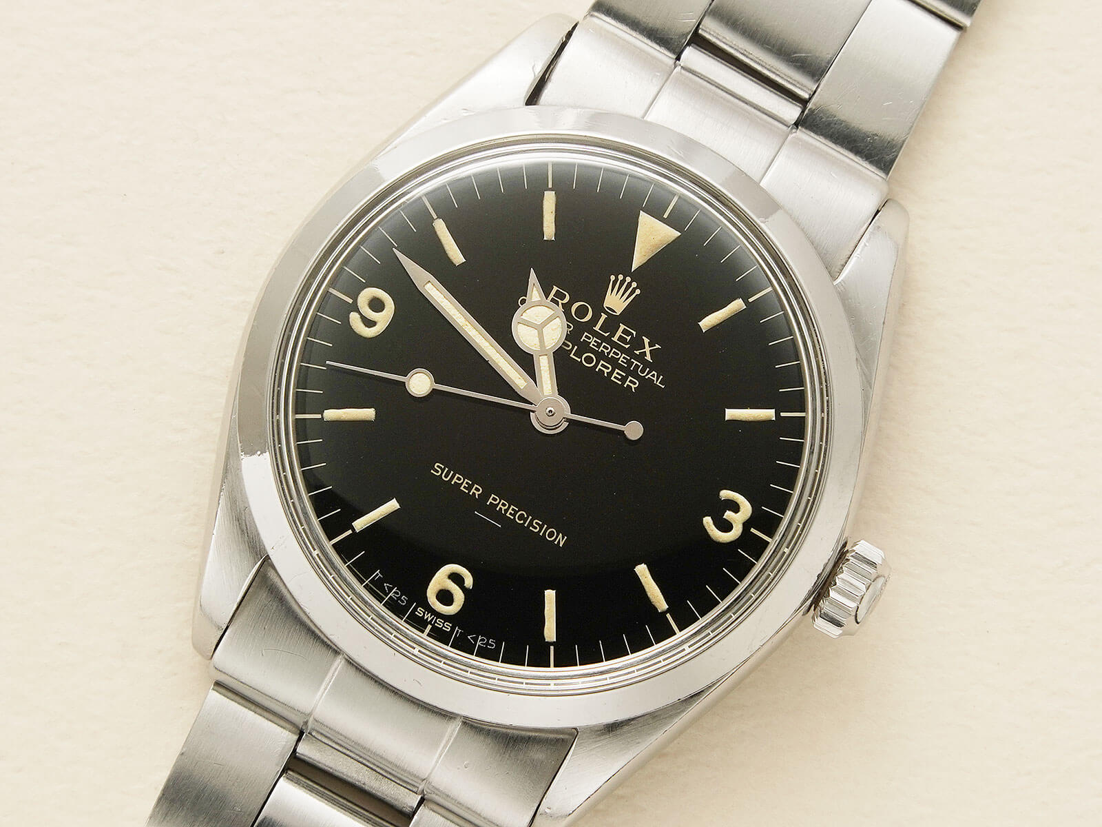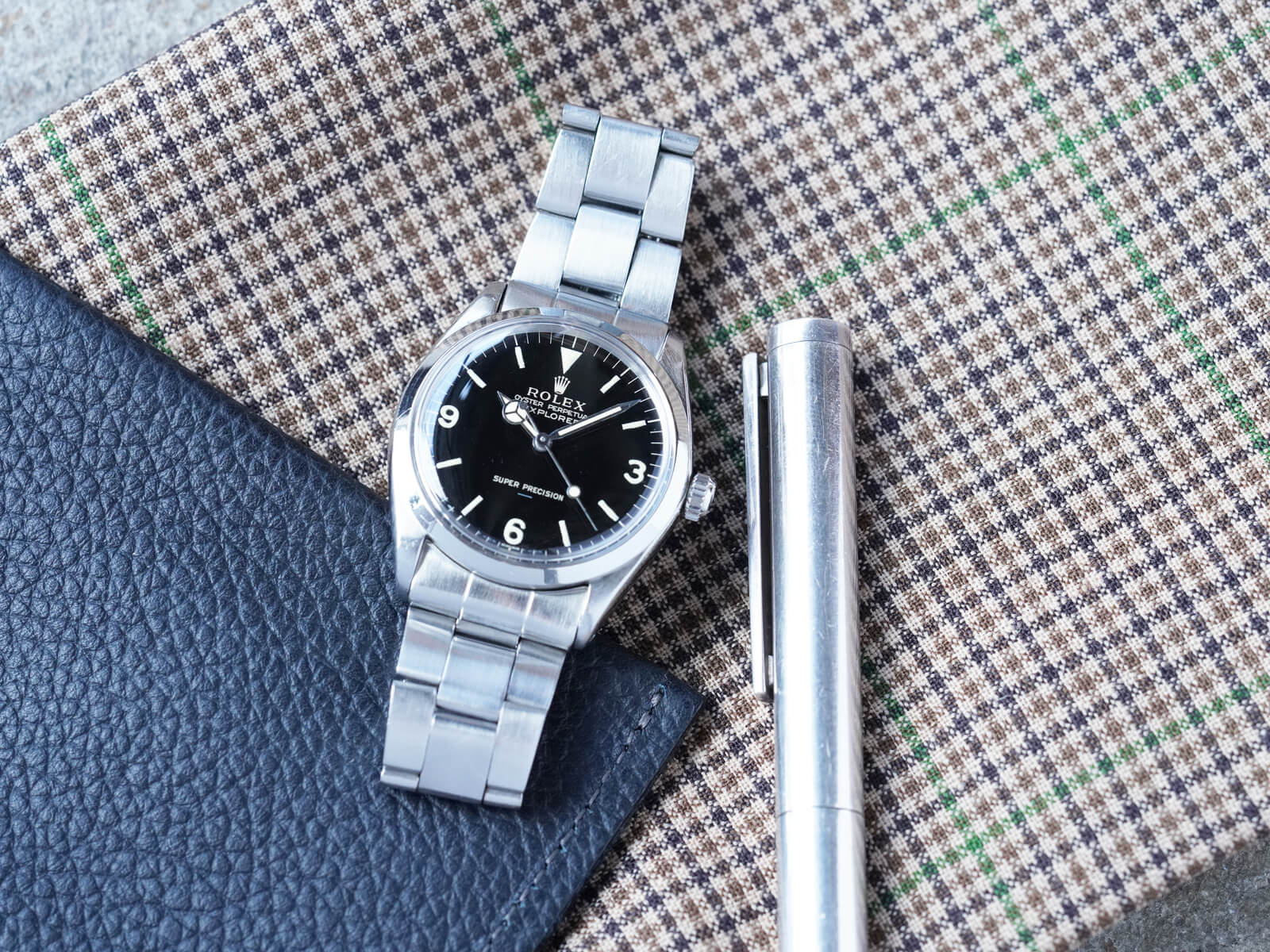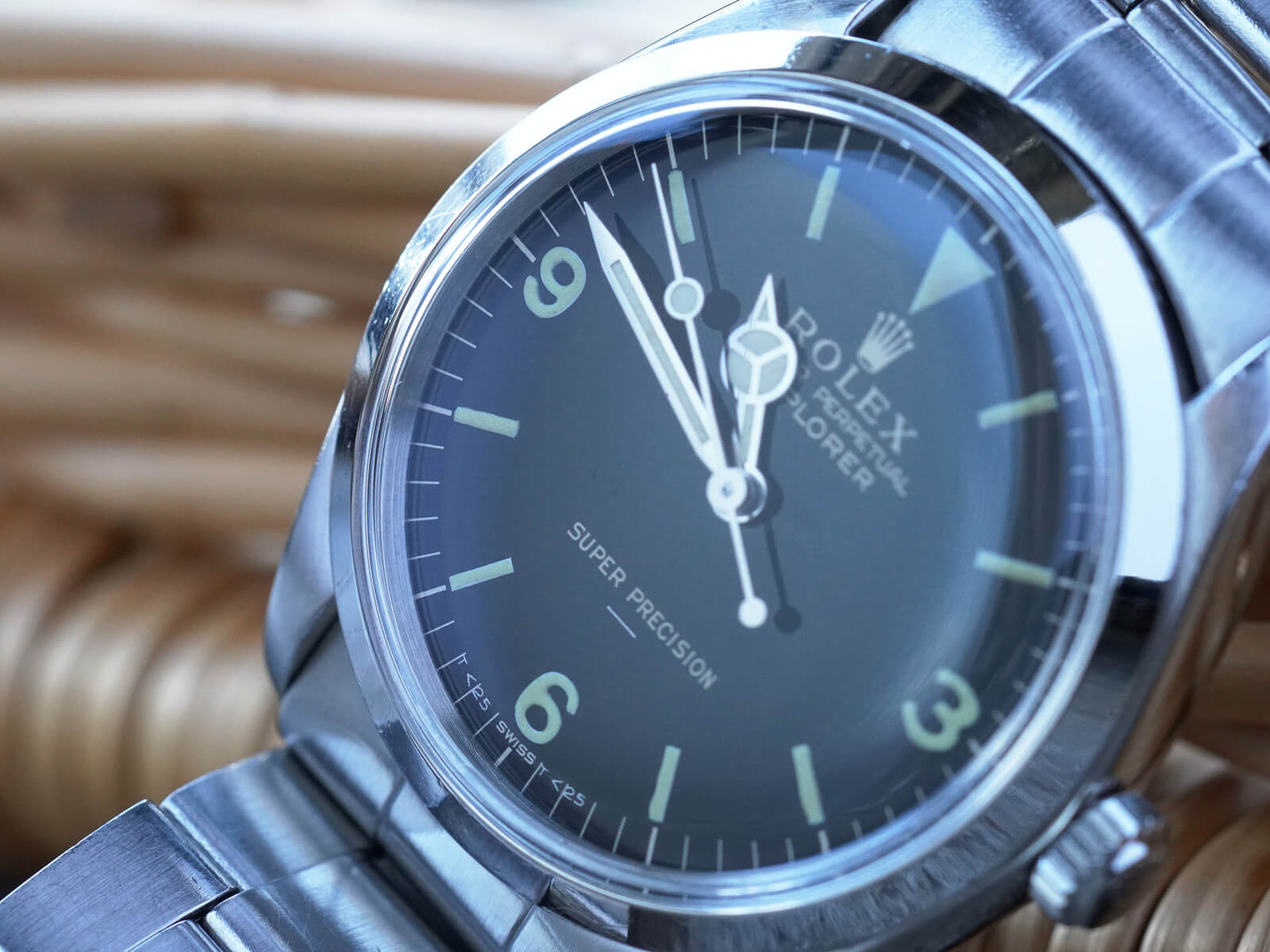 今回は、メンズモデルRef.1016より小さいボーイズサイズRef.5500のご紹介です。6時側のSuper Precisionの文字の下に、小さな横線を入れてダイヤル素材が高品質であることを示すとされる、アンダーライン(アンダーバー)が入る60年代特有のディテールを持った貴重なモデル。経年劣化のない鏡のような輝きを放つ[Gilt Dial/ミラーダイヤル(ギルトダイヤル)]に、ラジウム夜光にも関わらずトリチウム表記された希少な存在です。ロレックスの代表的スポーツモデルに使われるメルセデスハンドに、レトロ調のフチなしのアラビアインデックスが風格ある色合いに変色し、浮かび上がるような強いコントラストを演出。特にこのモデルは、イギリスに駐留していた軍に扱われていたとされる、ミリタリータイプの時計として分類されていたモデルで、オーラのある格別な存在感を感じさせてくれます。