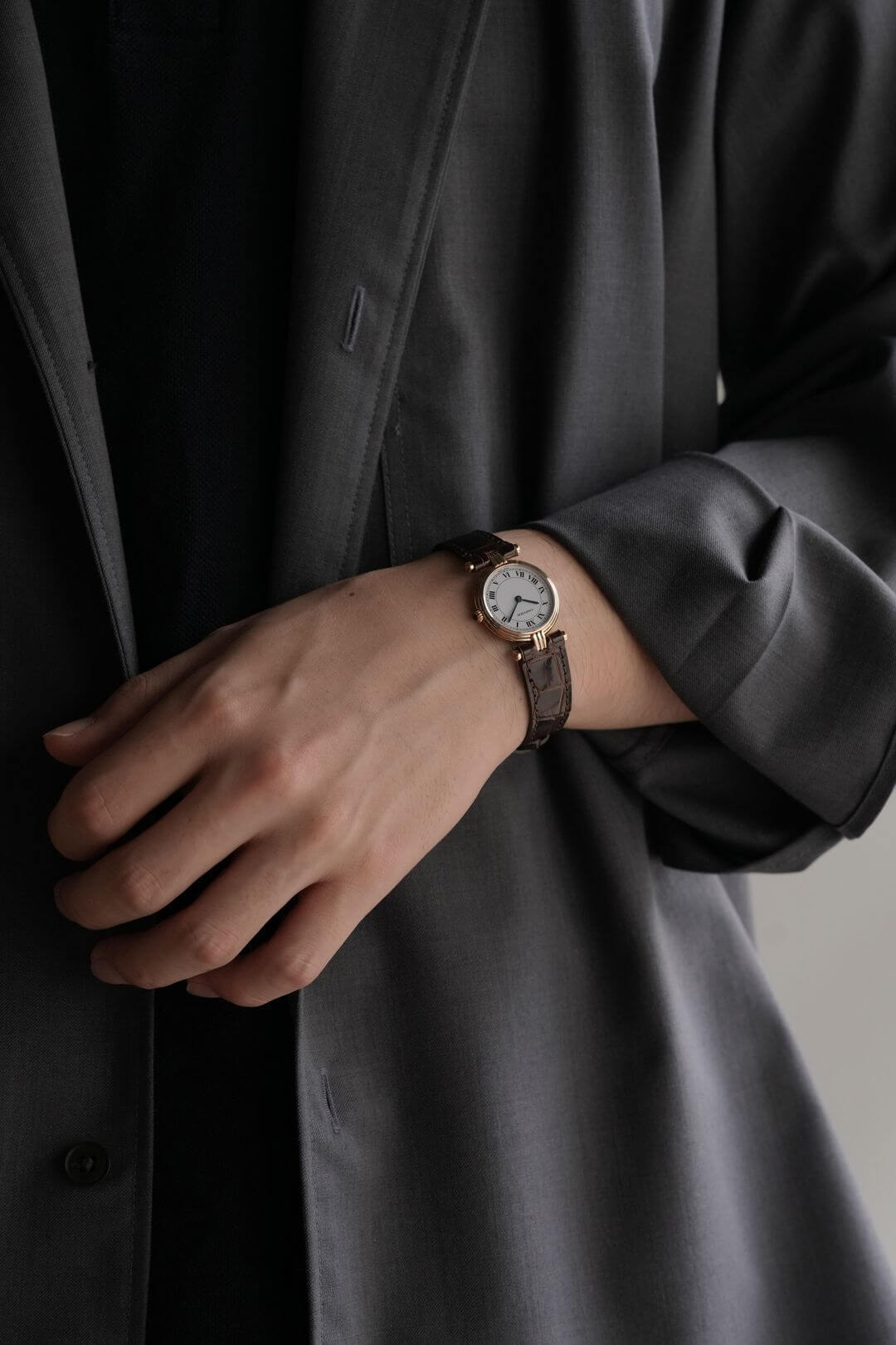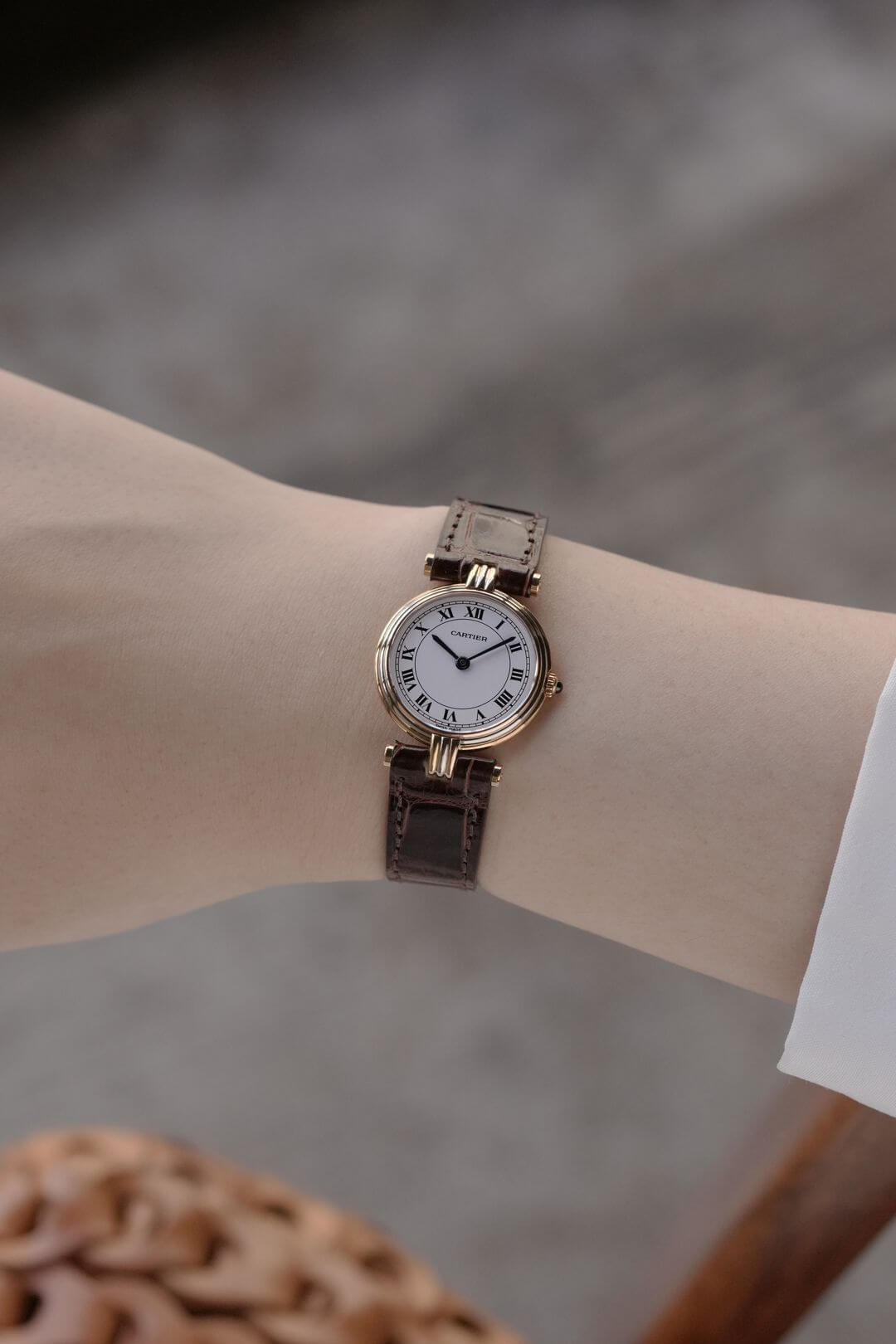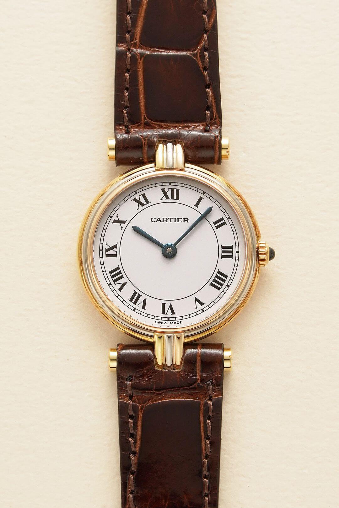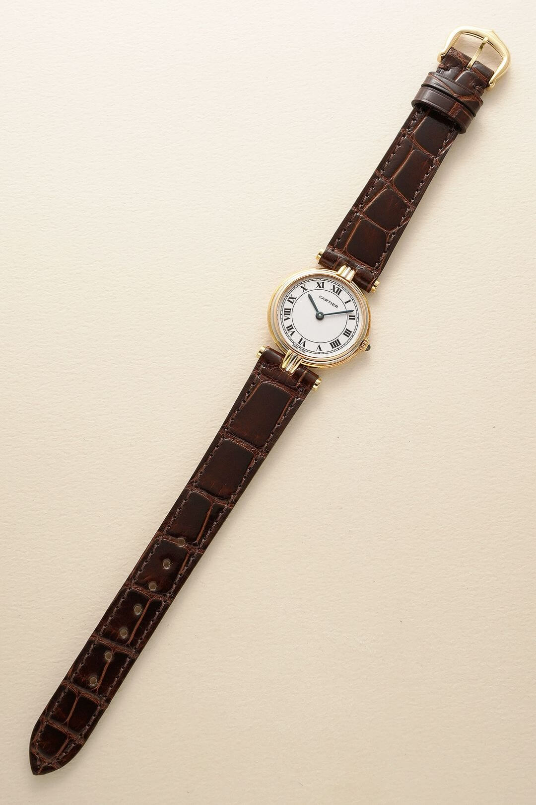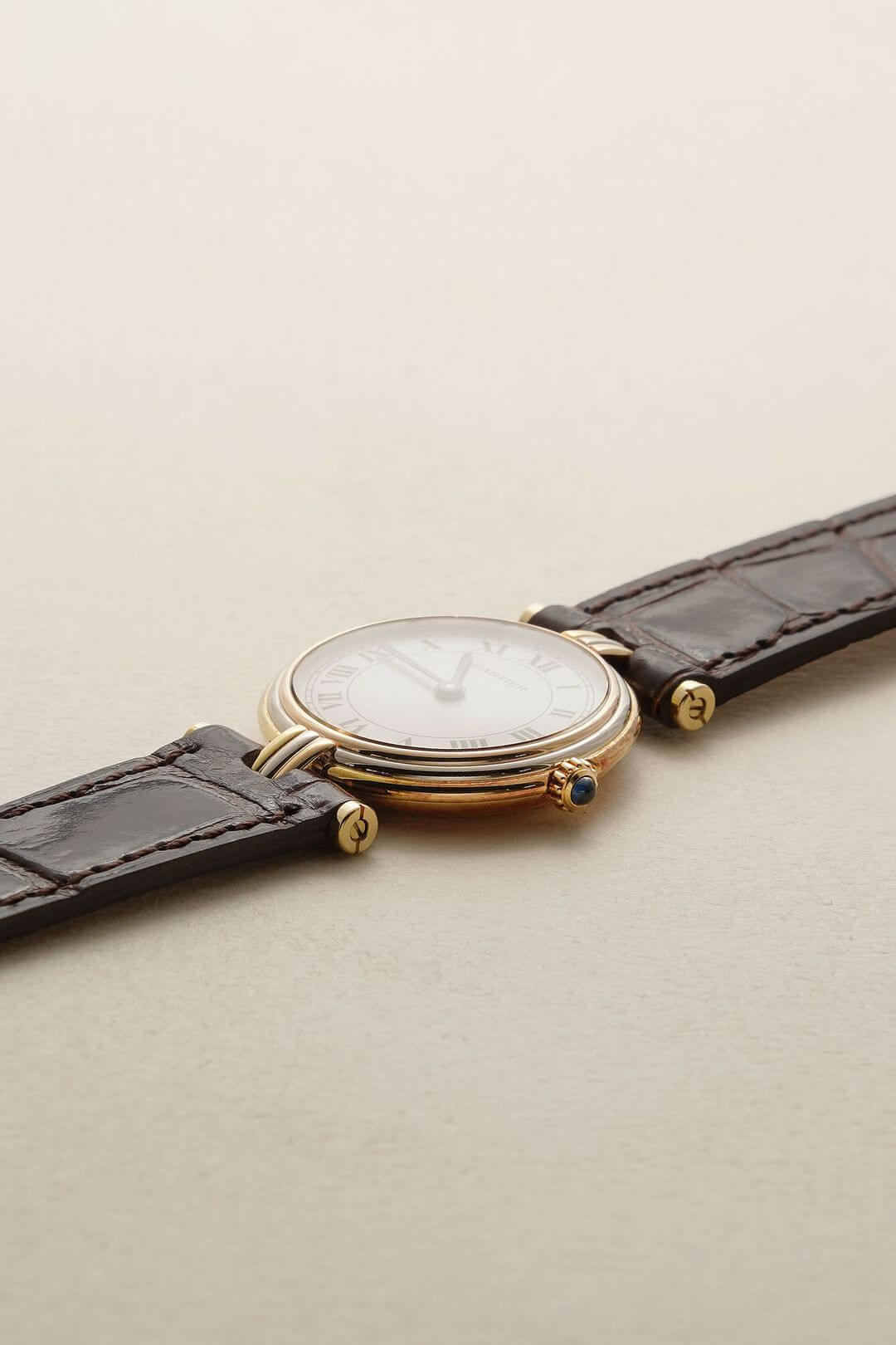 レザーブレスには、当店オリジナルのクロコダイルレザーのシャイニーブラウンをセッティング。貴重なイエローゴールド製のカルティエ純正尾錠も付属しています。白い文字盤に描かれたローマ数字、ブルースチール製の針、サファイアカボション付きのリューズなど、カルティエの伝統美を体現するディテールが随所に散りばめられた素敵な時計です。是非、店頭にてご覧ください。