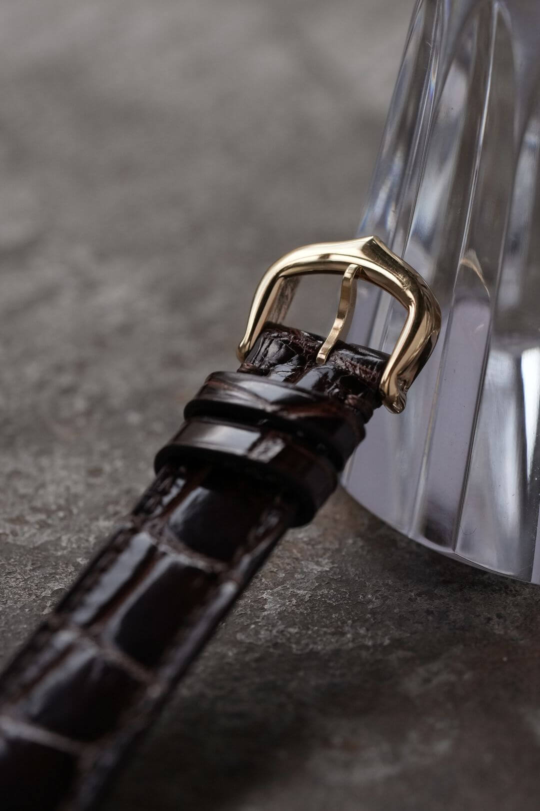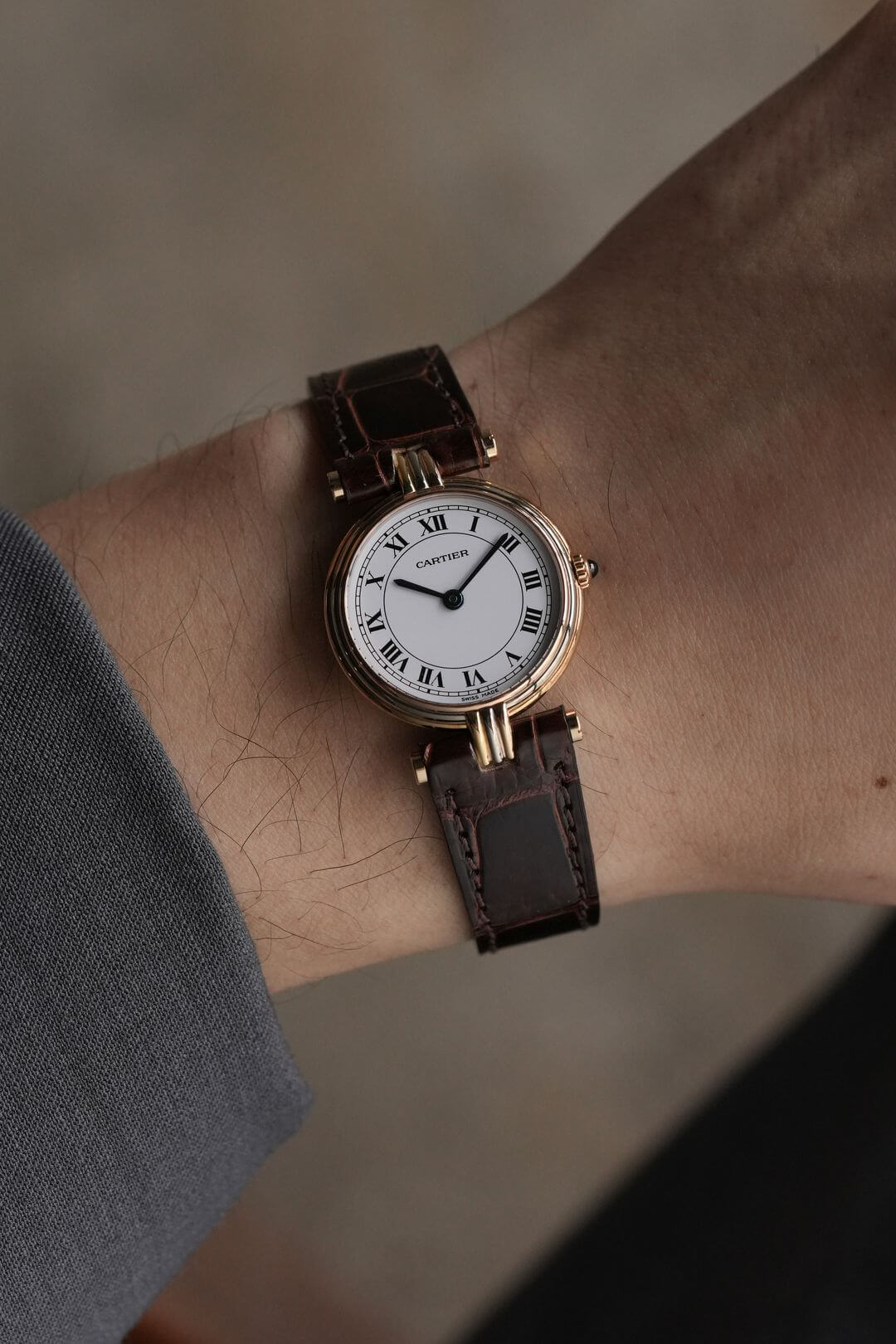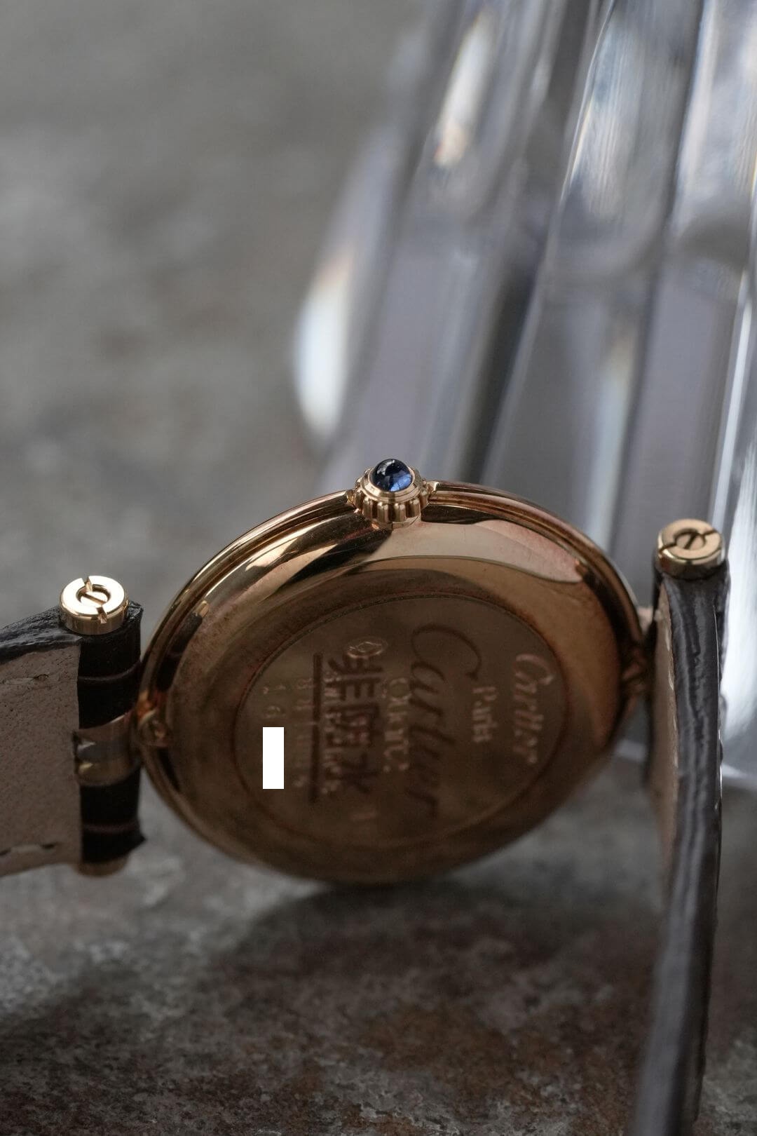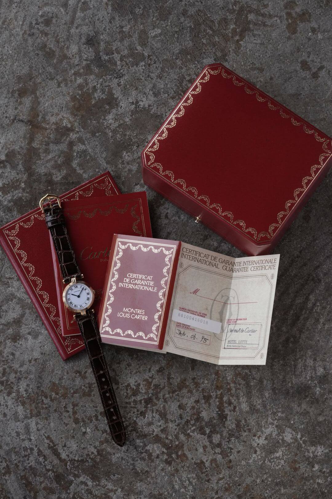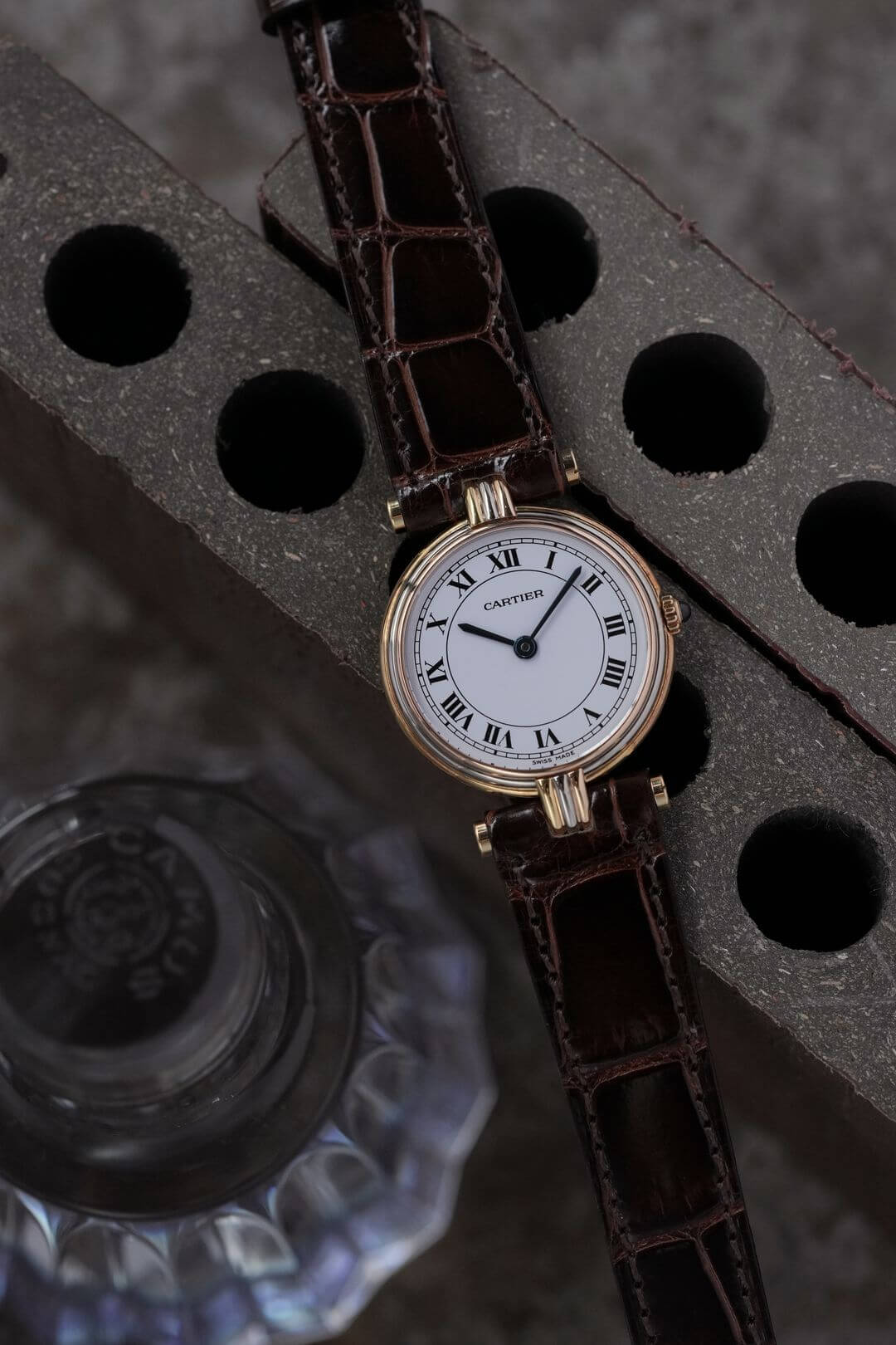 レザーブレスには、当店オリジナルのクロコダイルレザーのシャイニーブラウンをセッティング。貴重なイエローゴールド製のカルティエ純正尾錠も付属しています。白い文字盤に描かれたローマ数字、ブルースチール製の針、サファイアカボション付きのリューズなど、カルティエの伝統美を体現するディテールが随所に散りばめられた素敵な時計です。是非、店頭にてご覧ください。