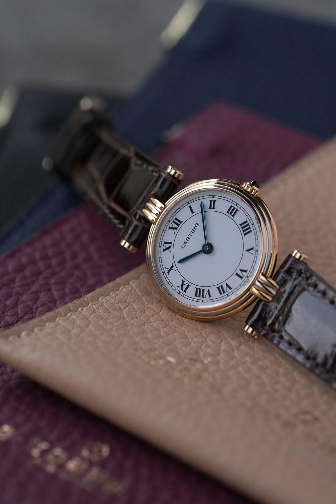 [Vandome Louis Cartier/ヴァンドームルイカルティエ]。1930年代、パリのヴァンドーム広場に位置するカルティエ本店で、ルイ・カルティエが馬車の車輪構造から着想を得て誕生したモデルです。