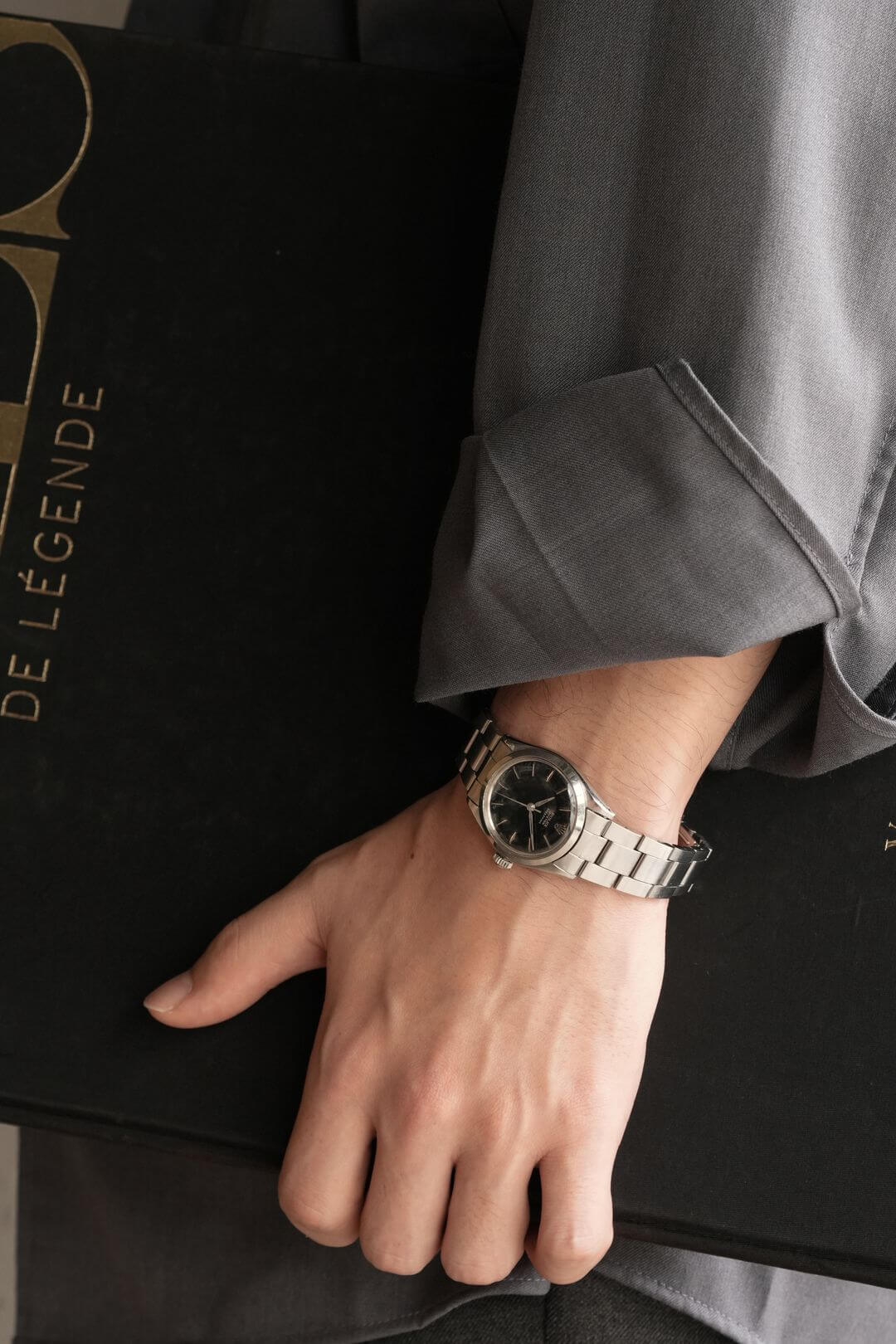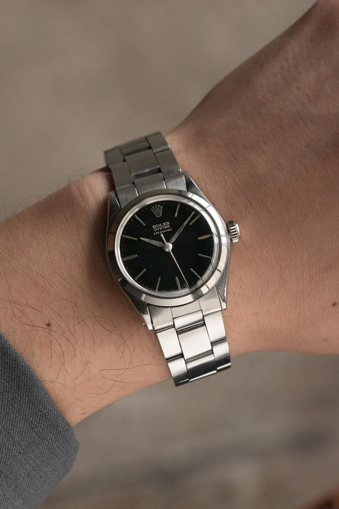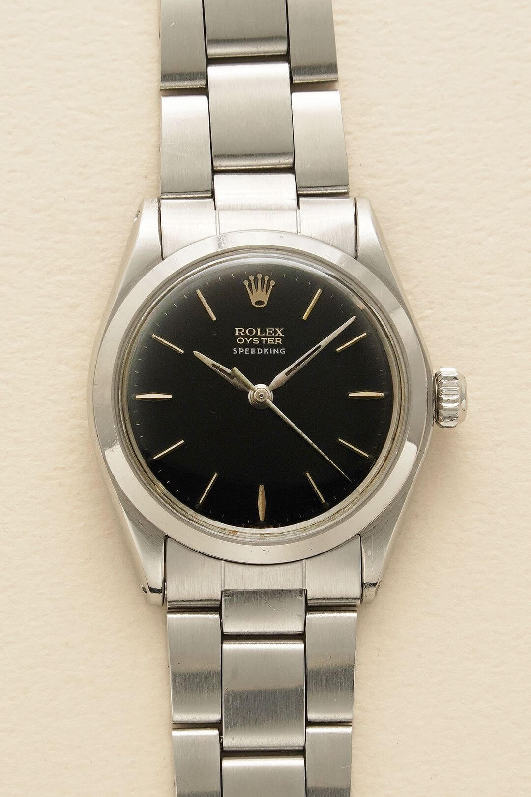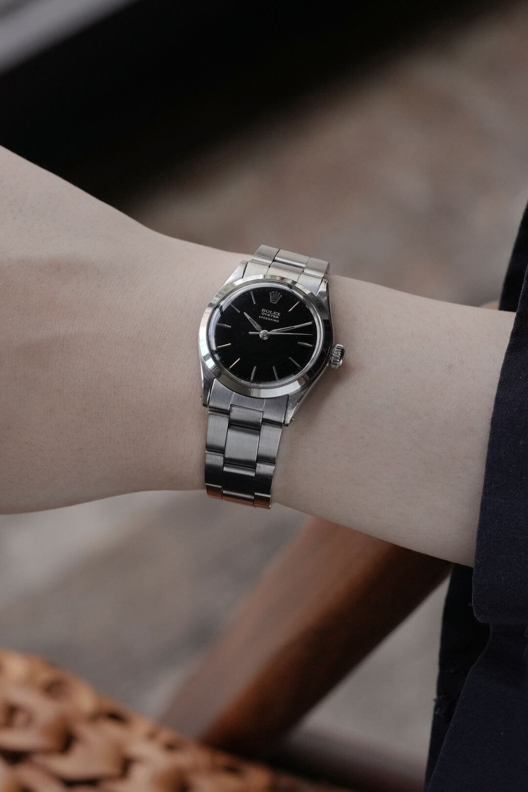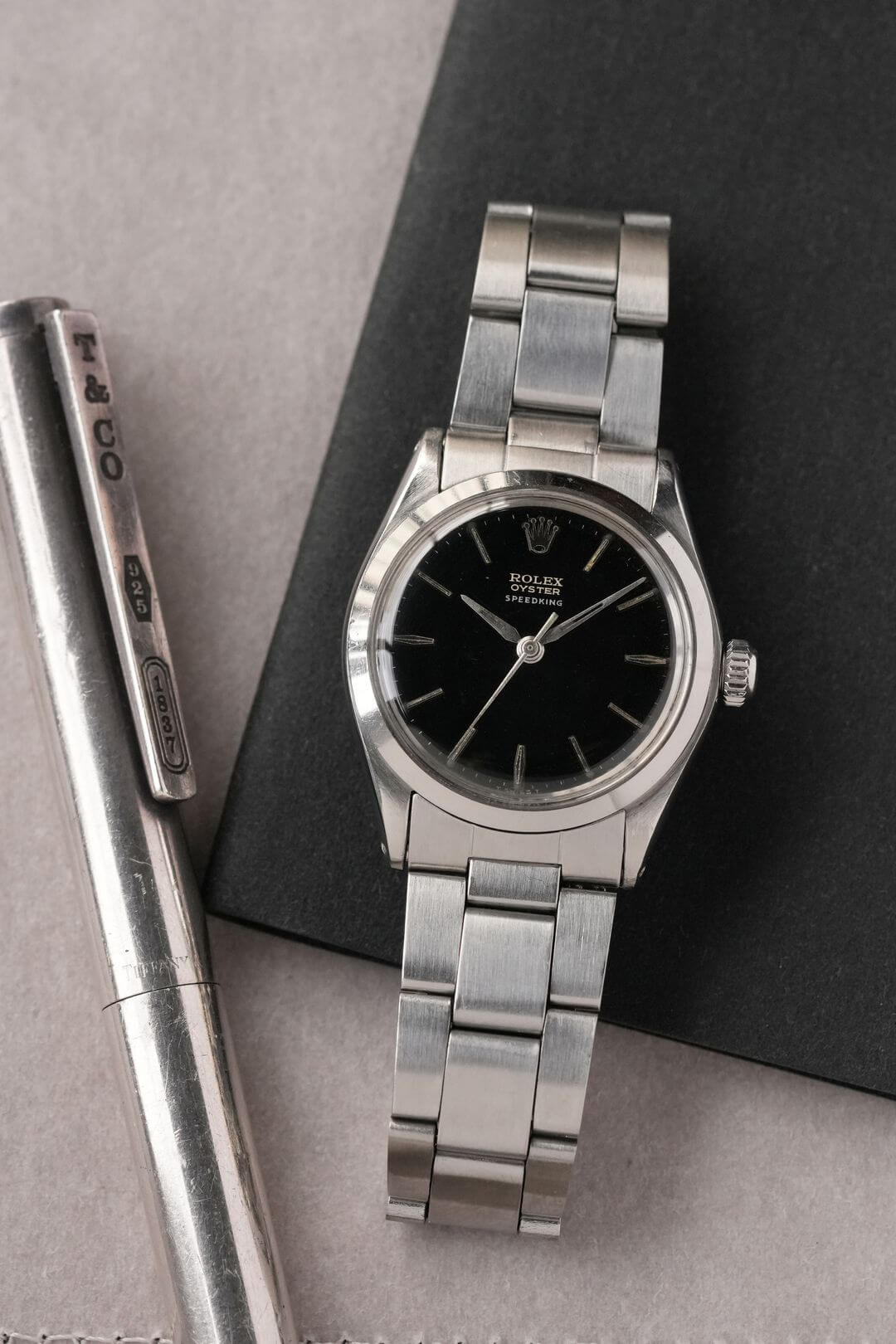 今回は、小ぶりなスポーツモデルを好む方におすすめの、[Oyster Speedking/オイスタースピードキング]Ref.6430Mのご紹介です。黒漆の器を思わせる独特な質感のミラーダイヤルに、端正なアルファハンドと存在感のあるバーインデックスが調和し、ヴィンテージロレックスの魅力を存分に感じていただけるデザインです。オイスターケースがスポーティーな印象を引き立てつつ、ロレックスらしい上品な高級感も漂います。本来は6時位置にPRECISIONの文字が入るのですが、12時位置のみのレター表記である事も珍しいディティールです。