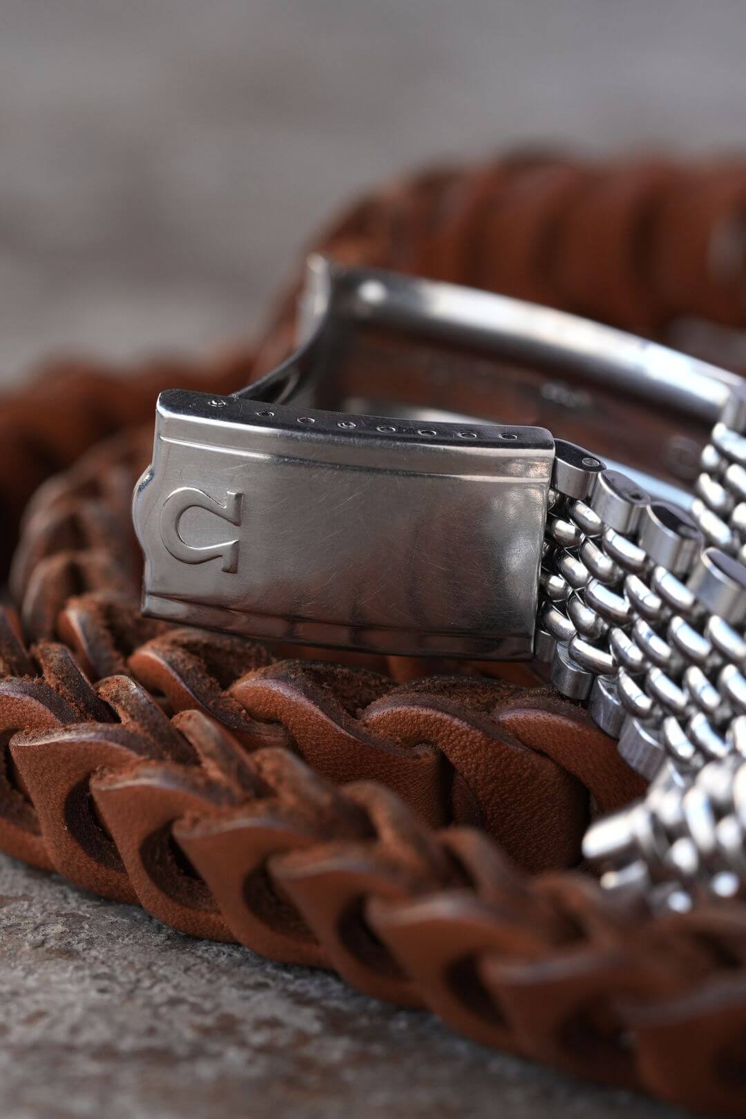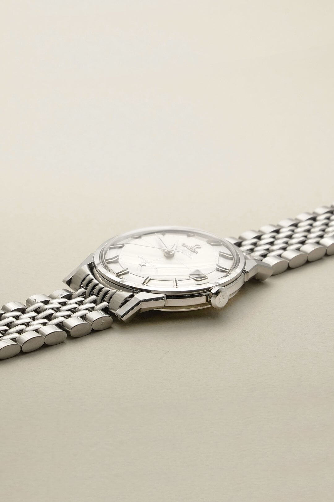 ブレスレットには、ステンレス製のオメガ純正7連ライスジュビリーブレスレットをセッティング。